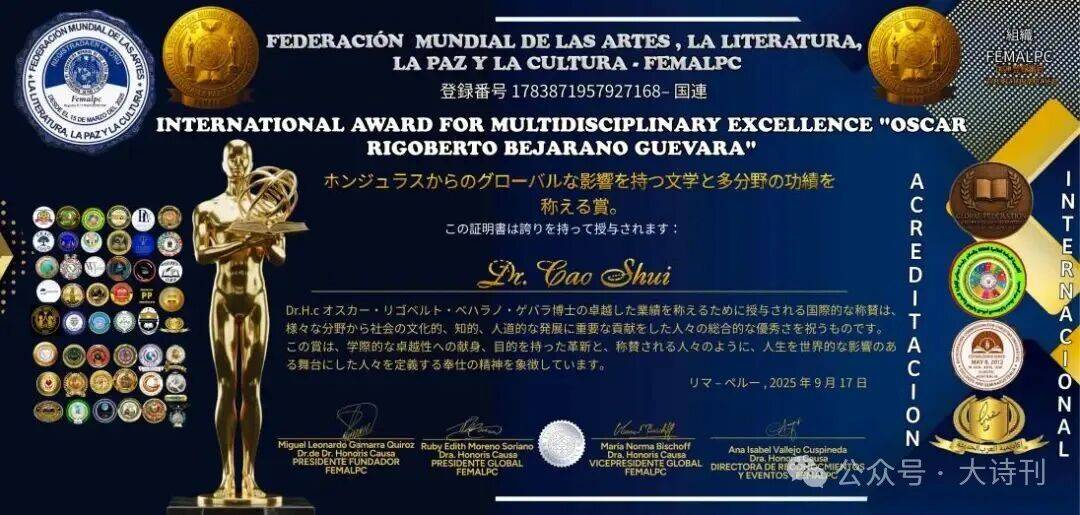 俄罗斯作家协会副主席、金砖国家作家协会主席瓦迪姆·特里金为中国诗人曹谁颁发联合国教科文组织国际跨学科卓越奖。曹谁收到联合国教科文组织下属的世界文学艺术文化和平联合会创始人兼主席米格尔·莱昂纳多·加马拉·基罗斯(Miguel Leonardo Gamarra Quiroz )的来信,祝贺曹谁获得国际跨学科“奥斯卡·里戈贝托·贝哈拉诺·格瓦拉”卓越奖,表彰曹谁在跨学科写作和研究领域的突出贡献。本次由瓦迪姆代表米格尔·莱昂纳多·加马拉·基罗斯颁奖,并发表获奖演说。