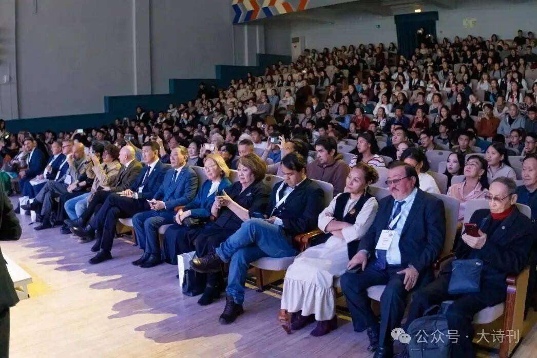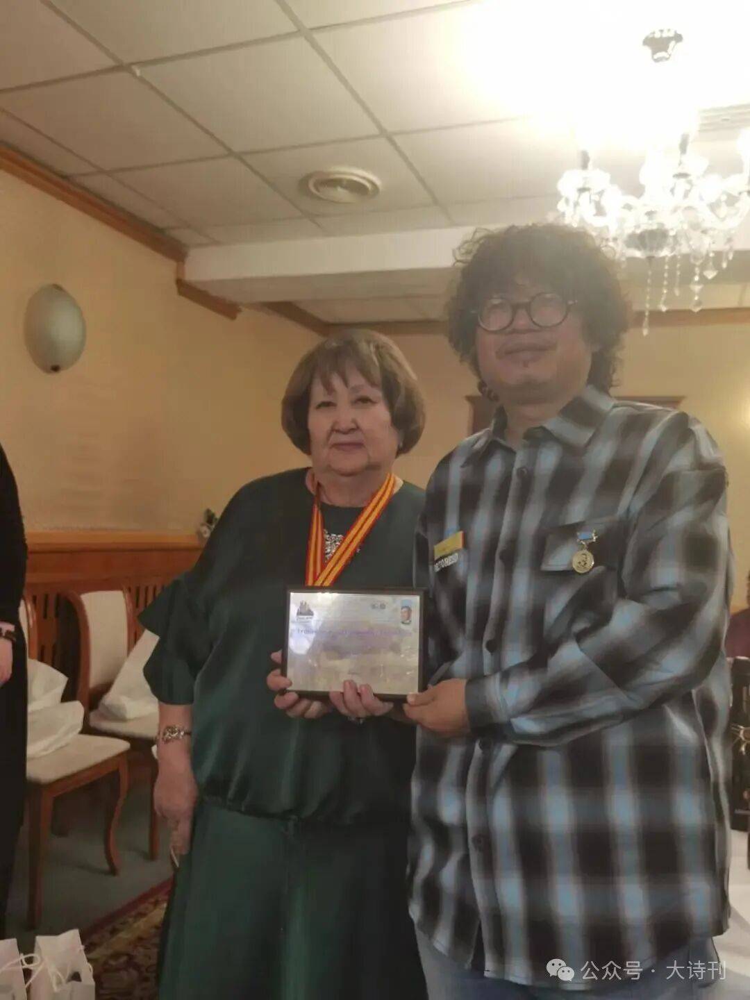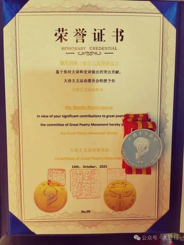 大诗主义运动发起人曹谁和俄罗斯作家协会副主席、金砖国家作家协会主席瓦迪姆·特里金为俄罗斯雅库特作家协会主席娜塔莉亚·哈尔兰皮耶娃颁发大诗主义运动勋章。大诗主义勋章由纯银打造,直径70mm,厚3.4mm,重70克,从设计到铸造都出自名家之手,肖像由著名摄影家宋醉发拍摄,勋章由著名雕塑家张国梁设计,印章由著名书法家古明川雕刻;正面是大诗主义运动发起人曹谁肖像,中英文书写:大诗主义运动(GREAT POETRY MOVEMENT);背面是古老的亚洲、欧洲、非洲三叶草地图,发布标注英文ASIA,EUROPE, AFRICA,地图由德国地理学家海因里希•宾廷在1581年绘制,代表着当时已知的古老世界,在这里象征人类的共同家园,周围雕刻大诗主义运动的核心观点“融合古今,合璧东西,合一天人”。大诗主义运动从2007年曹谁写作《大诗主义运动宣言》开始,如今已经传播到世界各主要语种。从2023年开始,大诗主义运动委员会将会在每年选择2-4名对大诗和史诗有杰出贡献的国际诗人颁发,2023年度的勋章颁发给了土耳其诗人纽都然·杜门、荷马国际诗歌节主席哈鲁克·萨辛、哈萨克斯坦作家协会原主席乌鲁克贝格·耶斯道勒特。2024年度的勋章颁发给了麦德林国际诗歌节主席费尔南多·伦德、美国诗人乔治·华莱士,阿联酋杰出诗人阿德尔·霍扎姆。2025年度的勋章颁发给了俄罗斯作家协会副主席瓦迪姆·特里金、委内瑞拉世界诗歌节主席安娜·玛利亚·奥维爱多(Ana María Oviedo Palomares)。