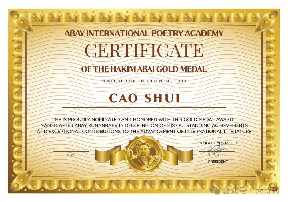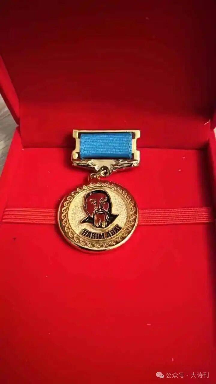 哈萨克斯坦作家协会前主席乌鲁克贝格·耶斯道勒特,为中国诗人曹谁,颁发哈萨克斯坦共和国哈基姆·阿拜国际诗歌金奖。此奖以哈萨克伟大的思想家、哲学家、民主主义诗人、近代哈萨克书面文学的开创者阿拜·库南巴耶夫(1845-1904)命名,他以纯洁精炼的语言和现实主义手法创作了大量的诗歌、散文、长诗和哲学作品,为哈萨克族的诗歌发展开展了新的道路,被称为哈萨克斯坦的民族作家。这个奖在2025年创立,专门奖励在文学创作上有突出贡献的国际诗人。乌鲁克贝格在现场为曹谁佩戴勋章,并宣读授奖词,表彰曹谁在诗歌和文学创作上的杰出成就。