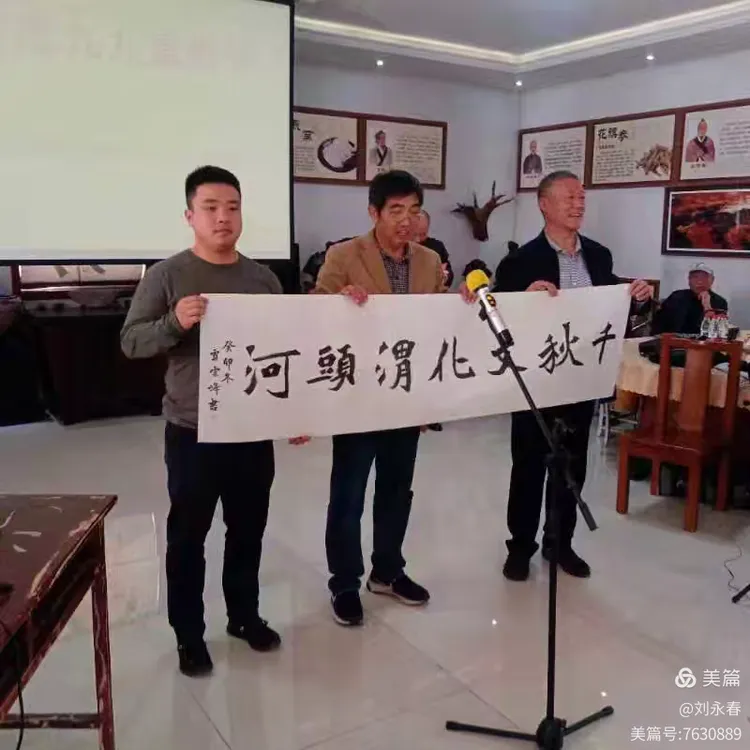 韩克俊先生向大缸博物馆捐赠书画作品“千秋文化渭头河”(中)兴利陶瓷有限公司总裁司维利(右),大缸博物馆馆长吕世伟(左)。