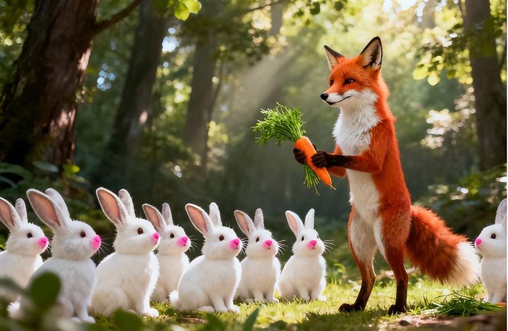 第二天一早,狐狸便背着满满一筐胡萝卜和鲜嫩青草,来到兔群聚居的山坡。它装出一副憨厚的模样,叹了口气说道:“兔子兄弟姐妹们,我这几天翻山越岭找食物,累得腿都软了,想着大家平时难得吃到这么新鲜的口粮,就特意弄来送来给你们尝尝!”说着,便把食物分给围拢上来的兔子们。