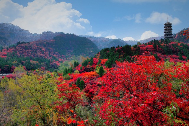 时维九月,序属三秋,值第四届儒商大会之隙,天朗气清,惠风和畅,阴晴乍变间,云卷天光别有韵致。遂邀新朋旧友,驱车循绣川而行,遥见远山含丹,若霞君捧出胭脂,心下已知红叶谷至矣。