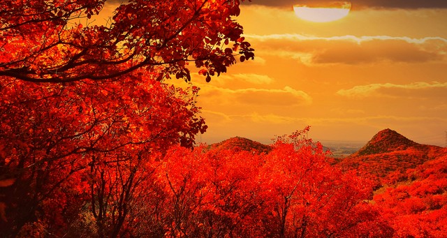 登高远眺,层林尽染,非独丹红。赭黄若鎏金,绛紫如凝霞,翠碧间杂,恰似七宝楼台倾下碎玉。忽忆易安“人比黄花瘦”之幽,而今我辈却效稼轩“白鸥盟约”,于茅庐枫影间与山鸟对答,真乃“落日余晖天地醉”也。