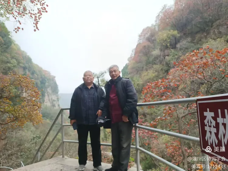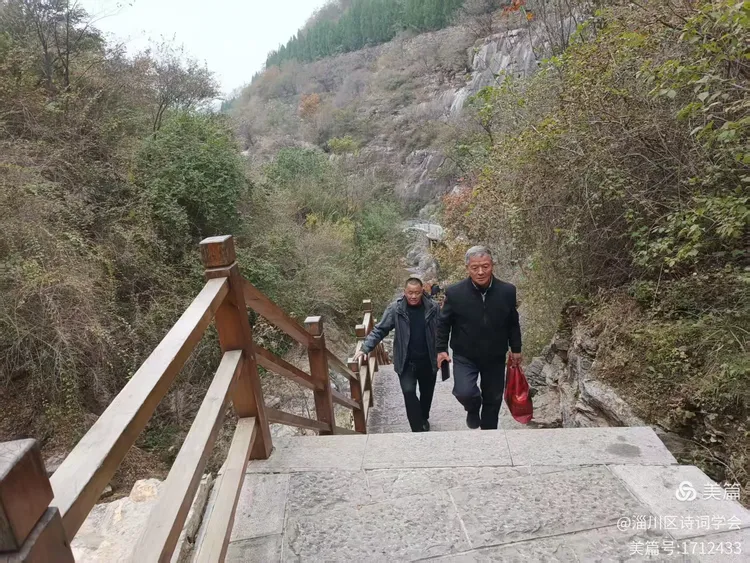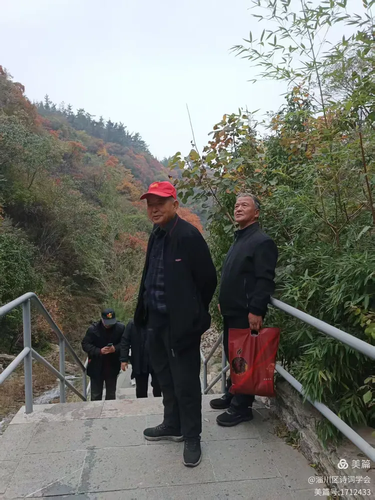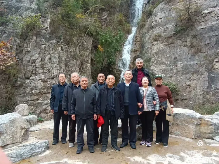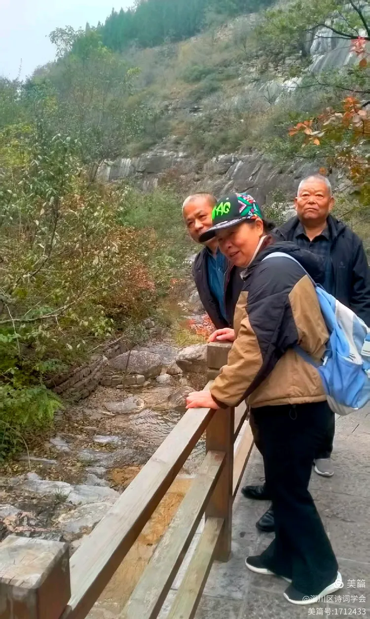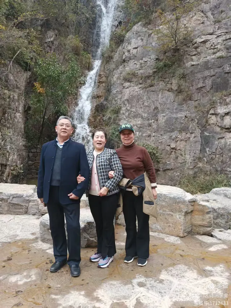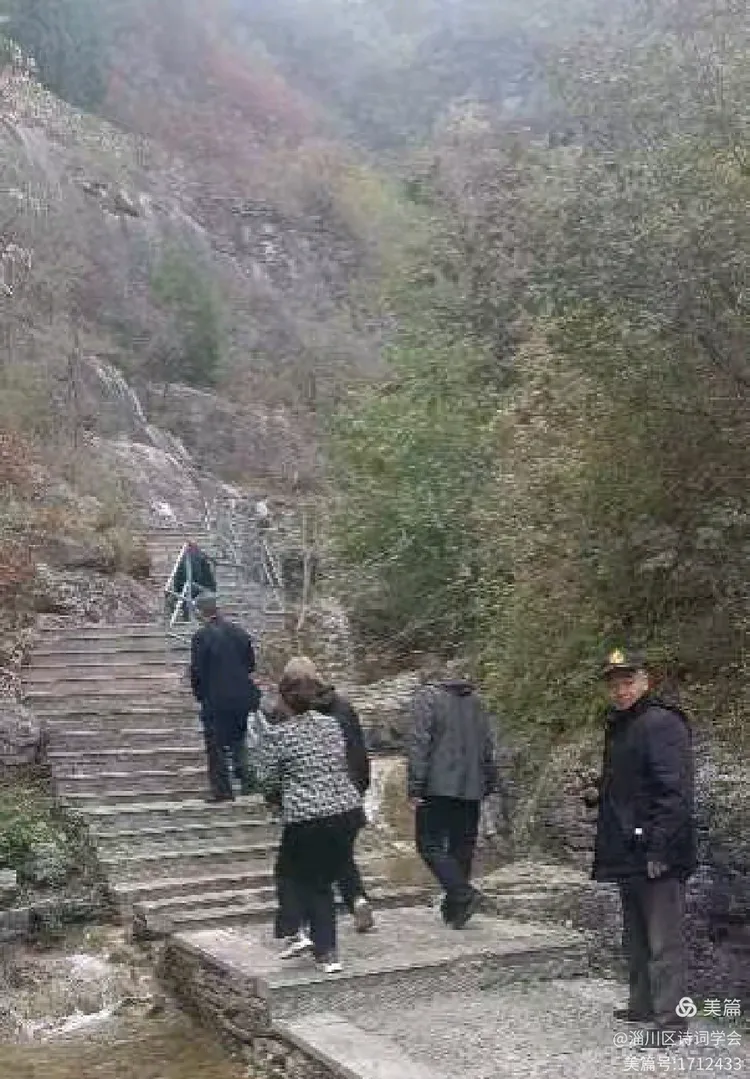不多时,登山的队伍在轻风中出发。一路欢声笑语,诗兴盎然。穿过“三连潭”,越过“一线天”,山光水色,层林尽染。红叶纷飞如霞,溪水潺潺,瀑布似雪,诗友们拍照留念,吟咏成章。
