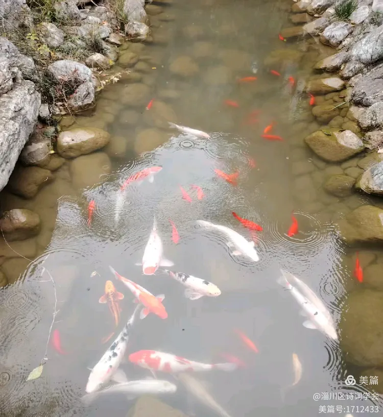 锦鲤漫串欢欣影,清涧飞流振奋花。