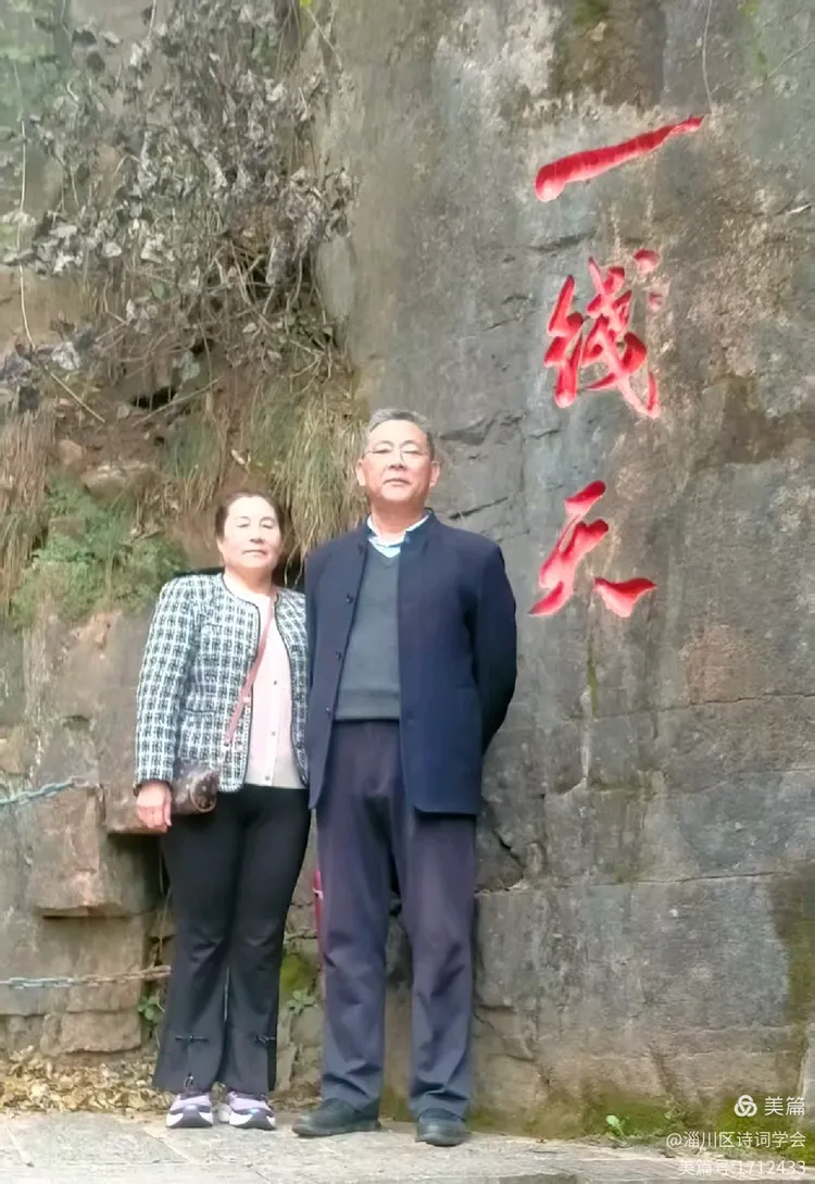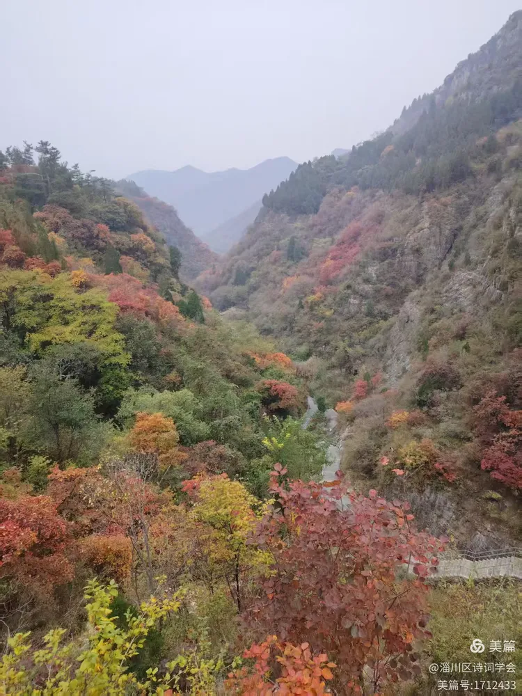 诗友秋深聚会,潭溪山美观光。相随涵洞水流旁,站立桥头遥望。 路畔樱花谷翠,瀑边一线天长。悬崖峭壁绿红黄,石级层层登上。