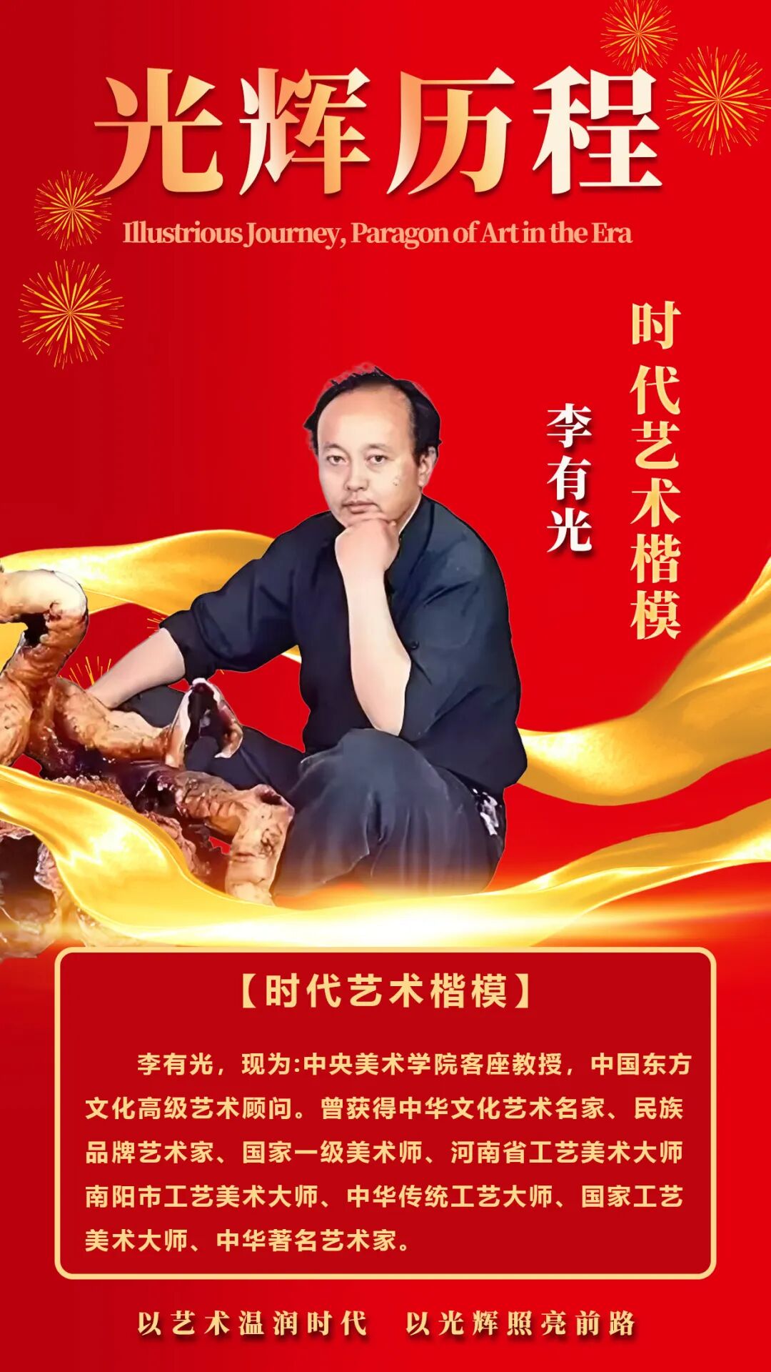 现为:中央美术学院客座教授,中国东方文化高级艺术顾问。曾获得中华文化艺术名家、民族品牌艺术家、国家一级美术师、河南省工艺美术大师、南阳市工艺美术大师、中华传统工艺大师、国家工艺美术大师、中华著名艺术家、世界杰出华人协会会员、世界杰出华人、中华国礼艺术家、世界非物质文化遗产研究院副院长、非遗根雕艺术大师等荣誉称号。中国艺术建筑委员会书画艺术专业委员会特聘客座教授。北京艺韵阁书画院艺术创新顾问,副院长。中央电视台授予李有光艺术名家工作室,世界文化艺术大师,中国雕塑艺术大师。被世界文化协会命名:中华国粹艺术传承人工作室。2023 年被聘任为人民书画报主席。