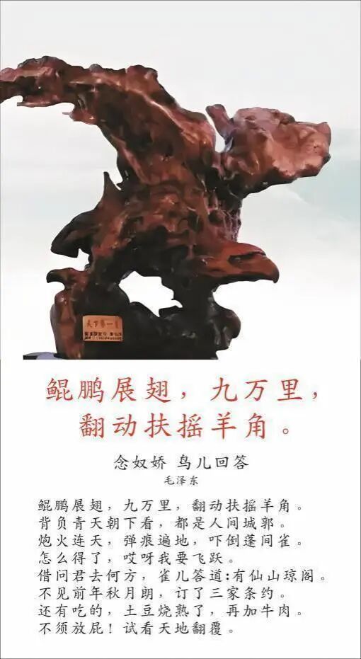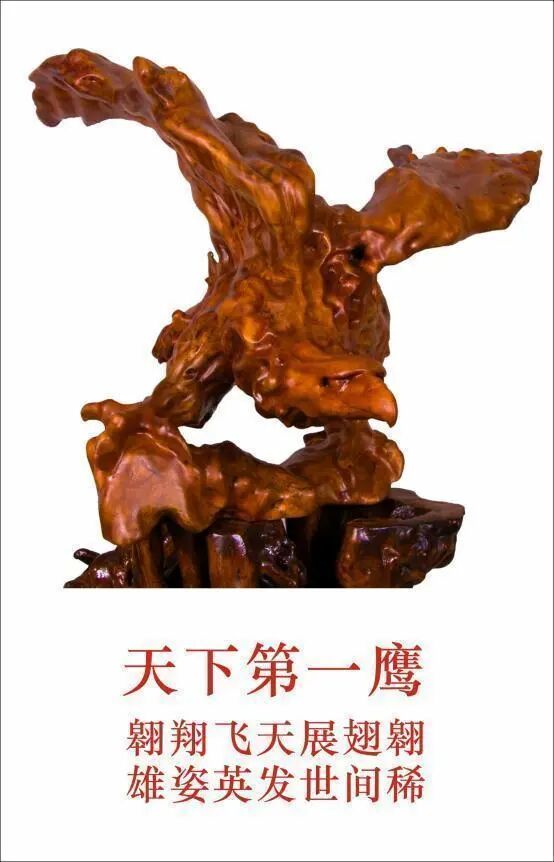 地下老根寻常物,得遇伯乐刀传神。李有光先生创作根雕作品善于与原材料对话,找到顺势而作的突破口,从而成就了许多像《天下第一鹰》的根雕典范。紧扣虚空,俯视苍穹,睥睨万物,如闻风雷。掘得深埋地底的沉根,李有光先生如获至宝,找到形如苍鹰振翅欲飞的造型基点,施以寥寥数刀,作鹰首昂扬锐目如电!一段寻常根,激变成双翼大展裂长空的神鹰。材质的沧桑与雄鹰的傲劲相得益彰,既是对生命的礼赞,也对自由的追索精神导航。李有光的诸多作品,常有这种不雕而雕,无为而无不为的塑造节奏,将大巧若拙的美学情景推向极致,国宝级作品总是让人叹为观止,实现了根雕从“工艺”到“文化载体”的属性飞跃。
