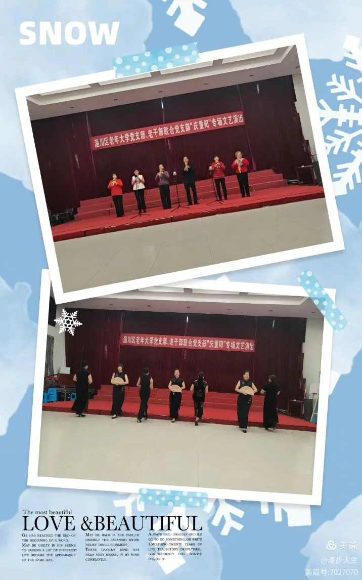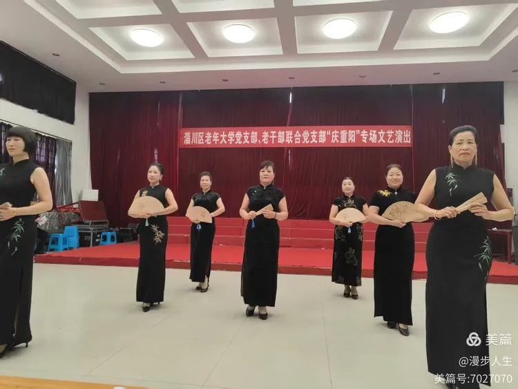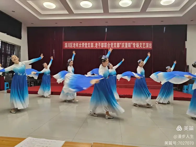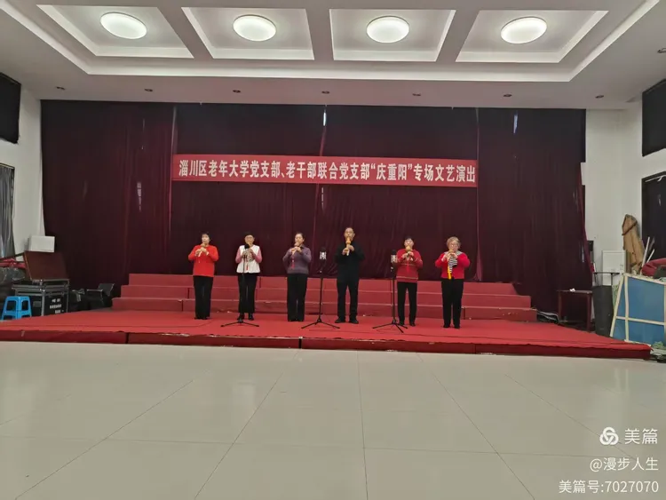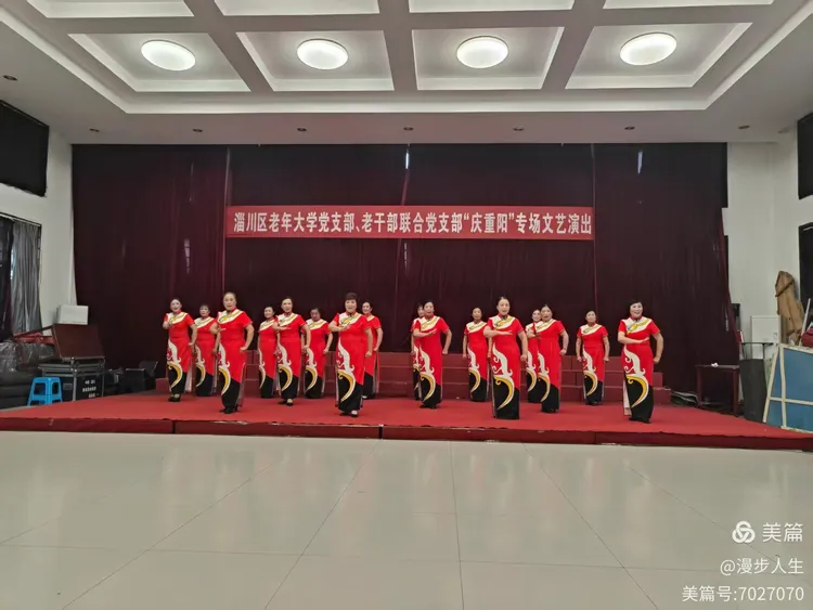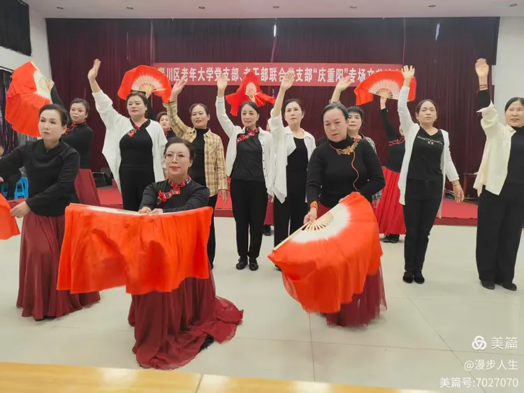 登高望远,似乎是镌刻在华夏子孙骨子里的一种情结,尤其是在重阳。一步一步,踏着石阶,听着脚下碎叶的轻响,心中便无端地生出许多感慨。人生譬如朝露,去日苦多,然而能在这秋光烂漫时,与二三知己,共攀高处,将胸中的尘嚣尽数吐纳于这天地之间,又何尝不是一种难得的幸事?及至峰顶,凭栏远眺,整座城池尽收眼底,远处的孝水如一条柔白的练带,静静地蜿蜒。此情此景,与千年前杜工部那“无边落木萧萧下,不尽长江滚滚来”的苍茫,固然是不同了,但那份面对天地浩渺时,心头涌起的关于时间与生命的幽微震颤,却是相通的。然而,重阳的韵事,又何止于白日的山水,真正的华彩,是位于留仙湖畔的老年大学,那宽敞明亮、锣鼓喧天的礼堂里,为了这场庆重阳的文艺演出,诗词班的诗友们,已准备了多时。当一行人衣装整齐、昂首阔步地走上台时,台下满是期待的面容。音乐声起,那是《春江花月夜》的吟诵。声音或许不再年轻,带着些许岁月的沙哑,但那每一个字,都是用情感熨烫过的。“春江潮水连海平,海上明月共潮生……”那不是在背诵,而是在用声音作画,描绘那空里流霜、江天一色的梦境。微微闭着眼,仿佛真看见了那轮皎洁的月,正从千年之前的江面上,缓缓升起,也将今宵我们的银发,映照得如同霜雪。接着,曲风一转,变得铿锵起来。《木兰辞》的节奏,是马蹄踏踏的急促,是金柝寒光的凛冽。那份属于巾帼英雄的飒爽与担当,便从高亢的吟诵中迸发来。“万里赴戎机,关山度若飞……”那一刻,台上的我们不再是垂暮的老人,仿佛一下变成了那替父从军的奇女子,心中充满了豪情。台下的掌声很响,一股热浪包裹着我们。那掌声里,有欣赏,有共鸣,更有一种对于生命不息、精神不老的由衷礼赞。