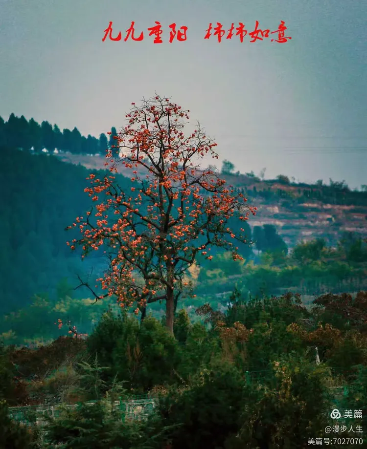 九九重阳好暖光,枫燃霞色柿摇黄。金风送爽云程远,玉露凝莹菊盏香。 登翠嶂,望家乡,千山锦缎映穹苍。心融盛世身康健,醉饮秋情诗末央。