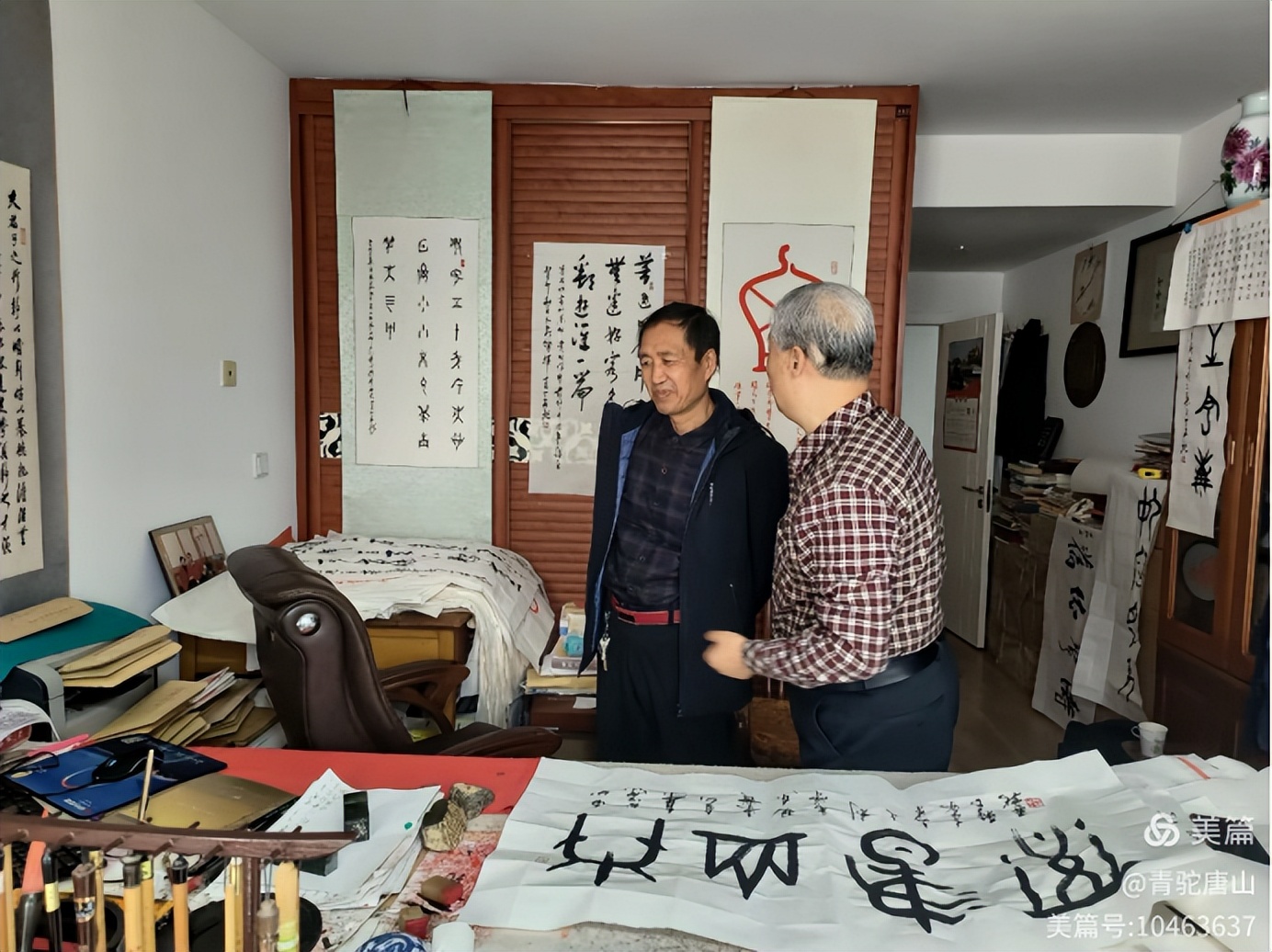 据悉,丁再献和杨文学既是老朋友又是沂蒙老乡,早在杨文学在南山书院创作《沂蒙山小调》《百年沂蒙》长篇时,丁老先生就曾用骨刻文为其题写″南山书源"和藏头楹联。″书源",丁老意指杨文学几十部巨作都在南山创作而成,南山书院是作家杨文学潜心创作基地,在南山书院,杨文学几乎过着与世隔绝的日子,每天除了吃饭的时间其余全部投入到写作当中。杨文学在发布会上曾经讲了这样一个小故事:有一天他连续写作十几天后实在太累了就走出书院散散步,碰巧遇上了在书院不远处住着得一社区管理员,管理员一见他就说:杨老师,你可回来了,你家的灯你忘了关,黑白都亮着,那得浪多少电啊,你再有钱,也不能这样浪费啊!杨文学听了哈哈大笑:″我天天在这住着,亮灯是我在工作呢!"。说得管理员都不好意思了。在南山书院,杨文学潜心创作,一部又一部新作从南山破土而出。