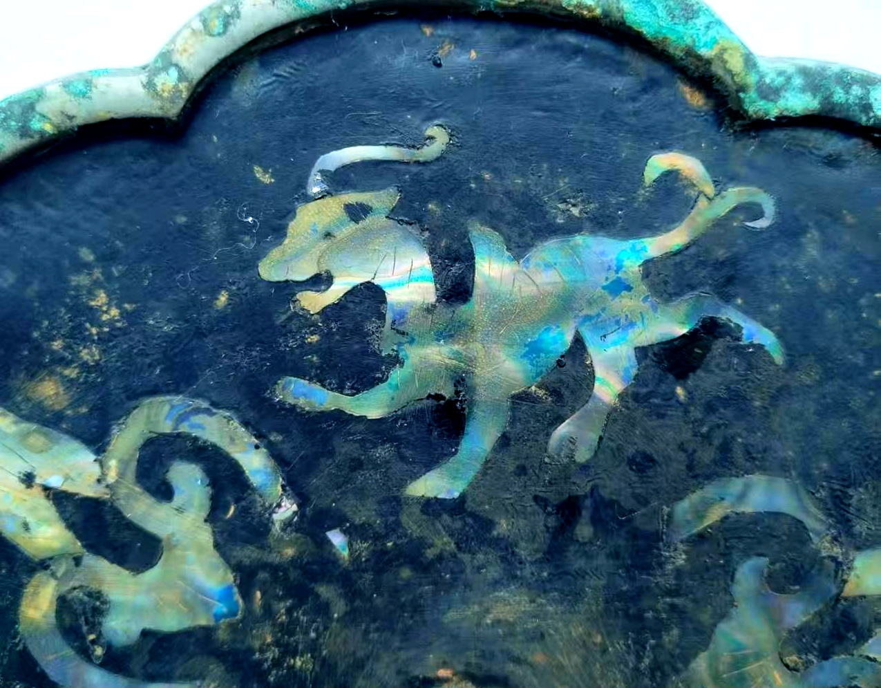 此镜采用的这种螺钿镶嵌工艺,虽历经千年,贝壳仍闪烁着虹彩光泽(见图),与铜镜的青绿色铜锈相映成趣,既展现了唐代工匠高超的镶嵌技艺,又因岁月沉淀形成了独特的古雅质感。