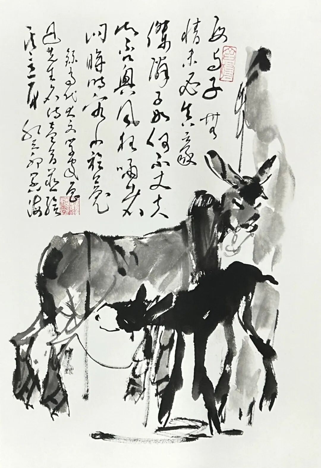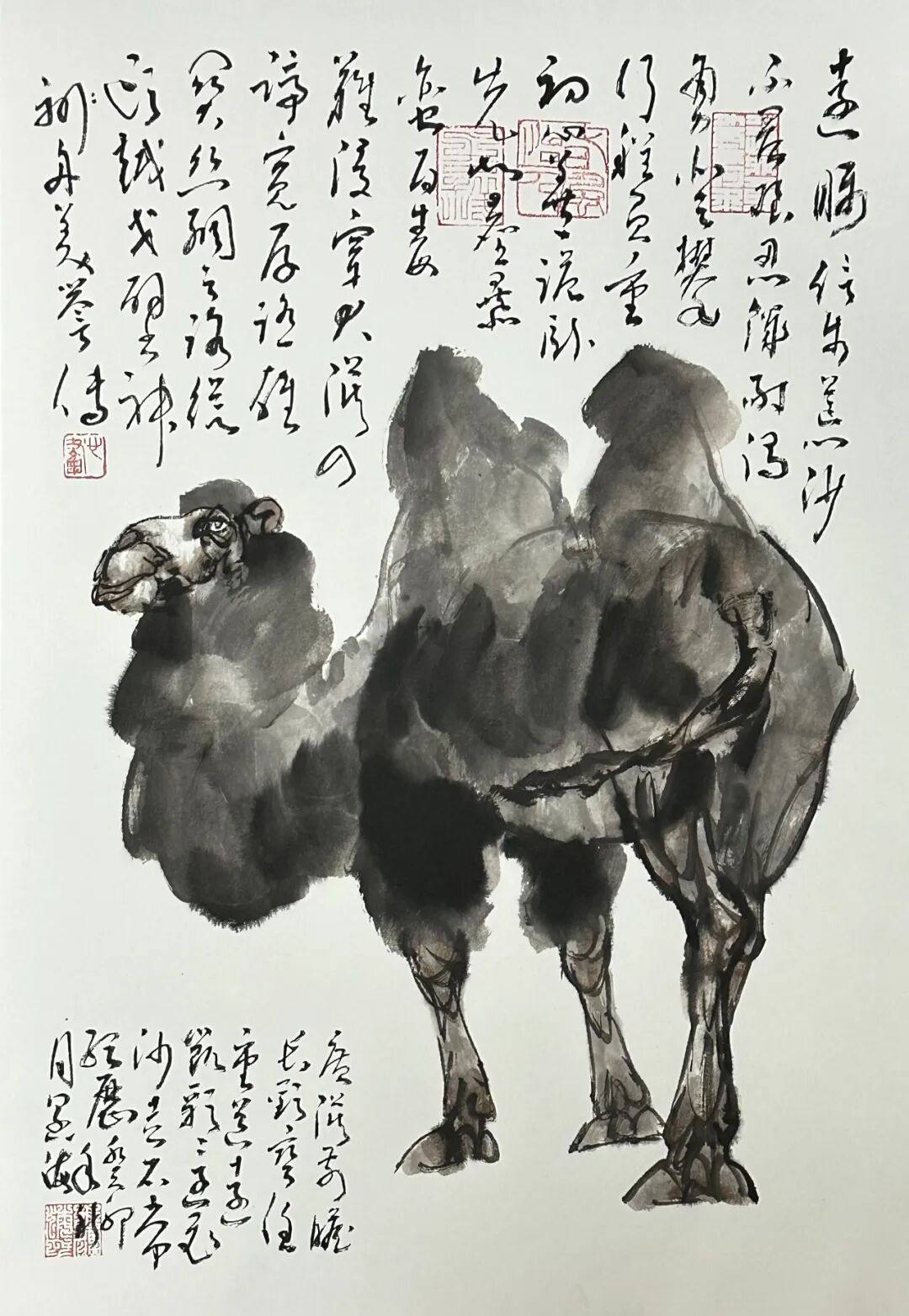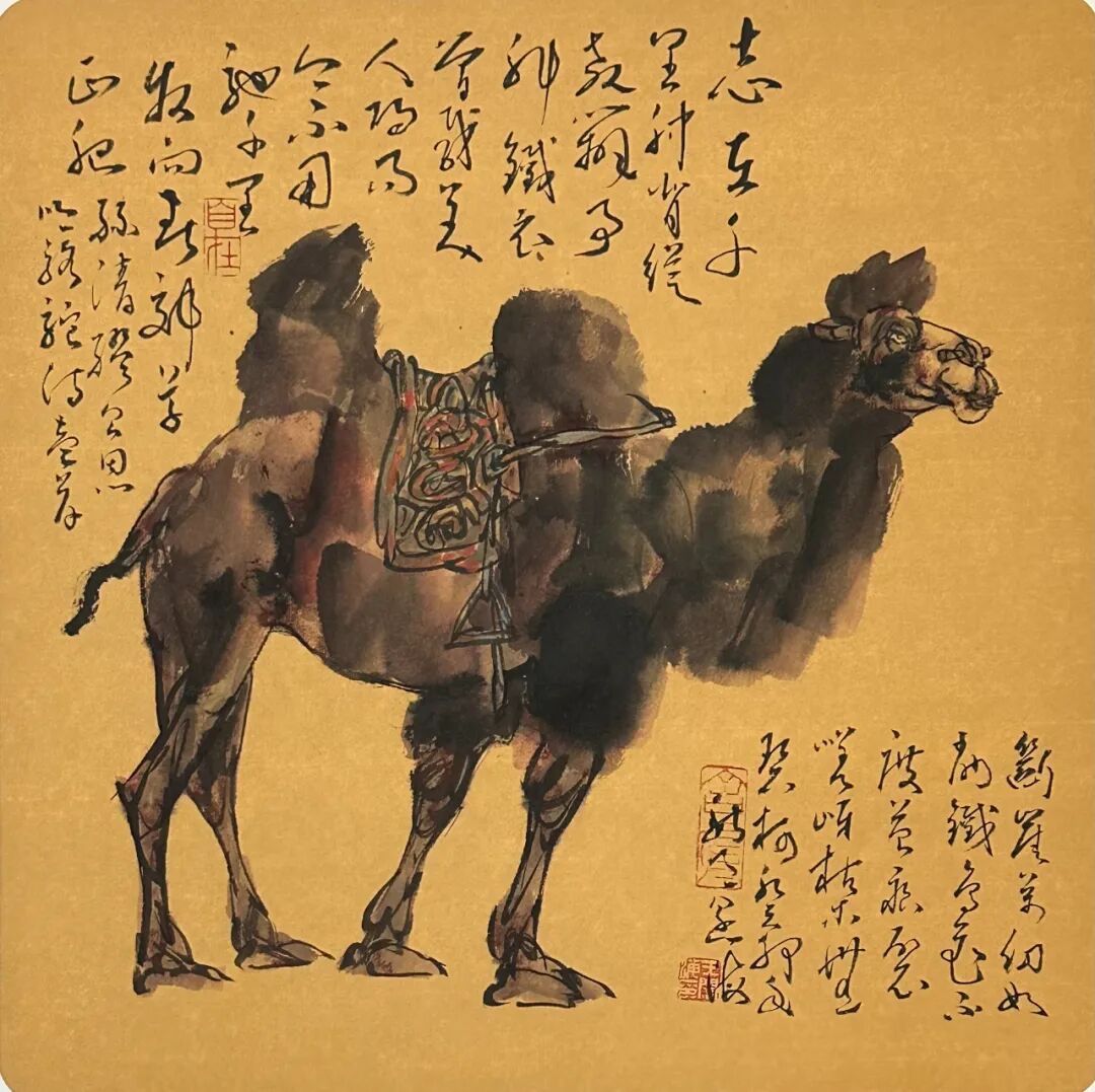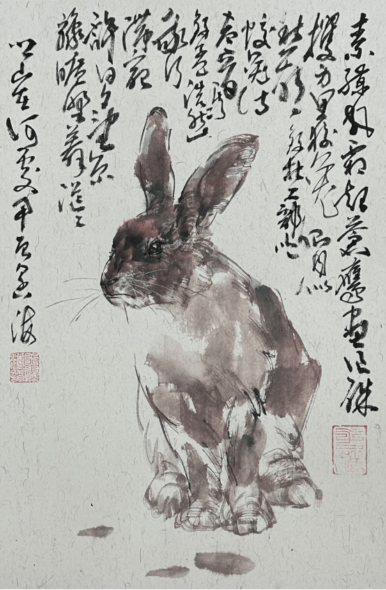 但由于历史认知的局限,其所画之马受西方光影影响,带有分块分面的痕迹,与中国画大写意之流动性笔墨稍欠融恰,吴作人先生之骆驼头部刻画略显概念与空泛,在深入刻画与塑造形体方面还有不尽人意之处;即便是前人笔下的兔子、牛马、犬类等常见动物在眉弓、鼻梁,头部整体的形体联接,各部关节等细节的形体刻画上,整体体积感的放墨位置与秩序,还有耳朵凹进去的立体感表现上,令当代画家都有可深入与作为之处。”这些观察,成为他思考艺术突破的切入点。