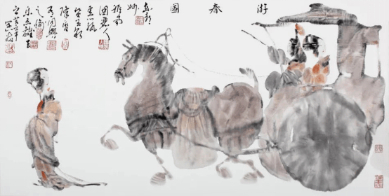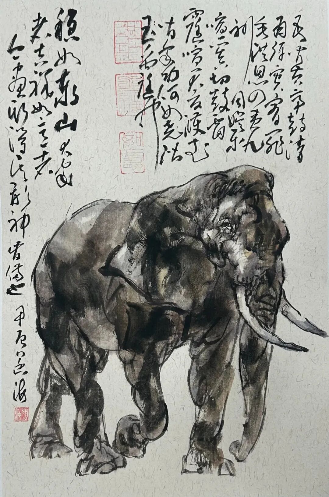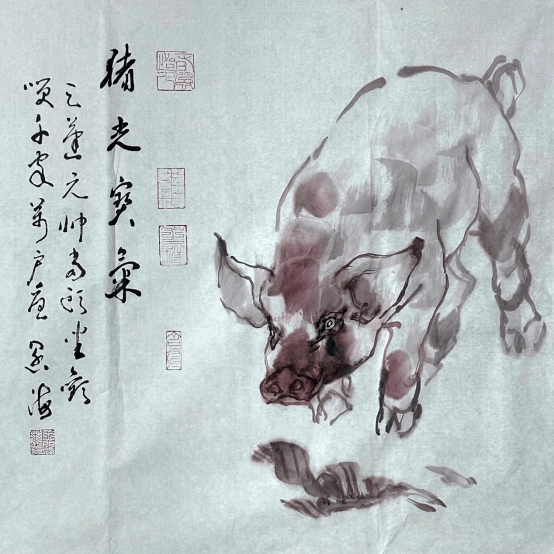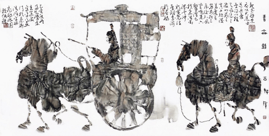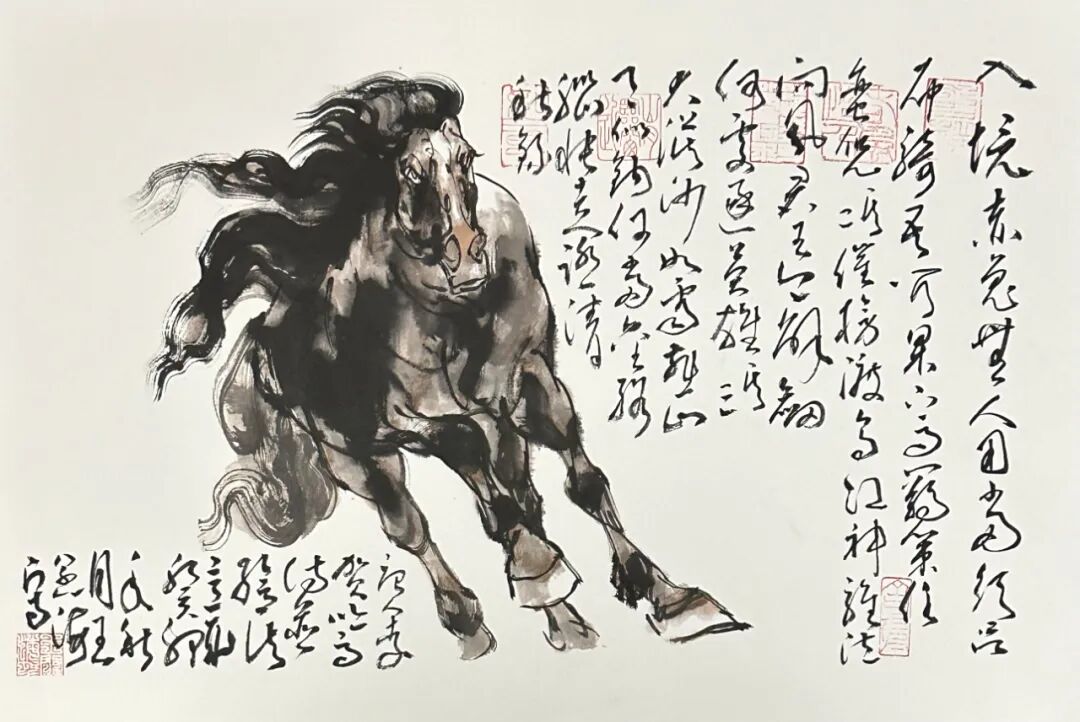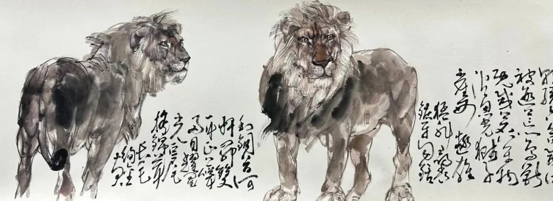 大多只能以工笔描摹为能事,且积重难返,评选与收藏也失去了应有的眼光与尺度,致使工笔描画大行其道,渐行渐远,远离了中国画大写意精神,岂不痛哉。为改变这一现状,他尝试用新汉画与文人画笔墨开启动物画的探索之路,力求化西为中,将西画之形体结构塑造转化为中国文人画笔墨语素,将中西合𤧥推向一个近乎炉火纯青的近乎完美的新境界。