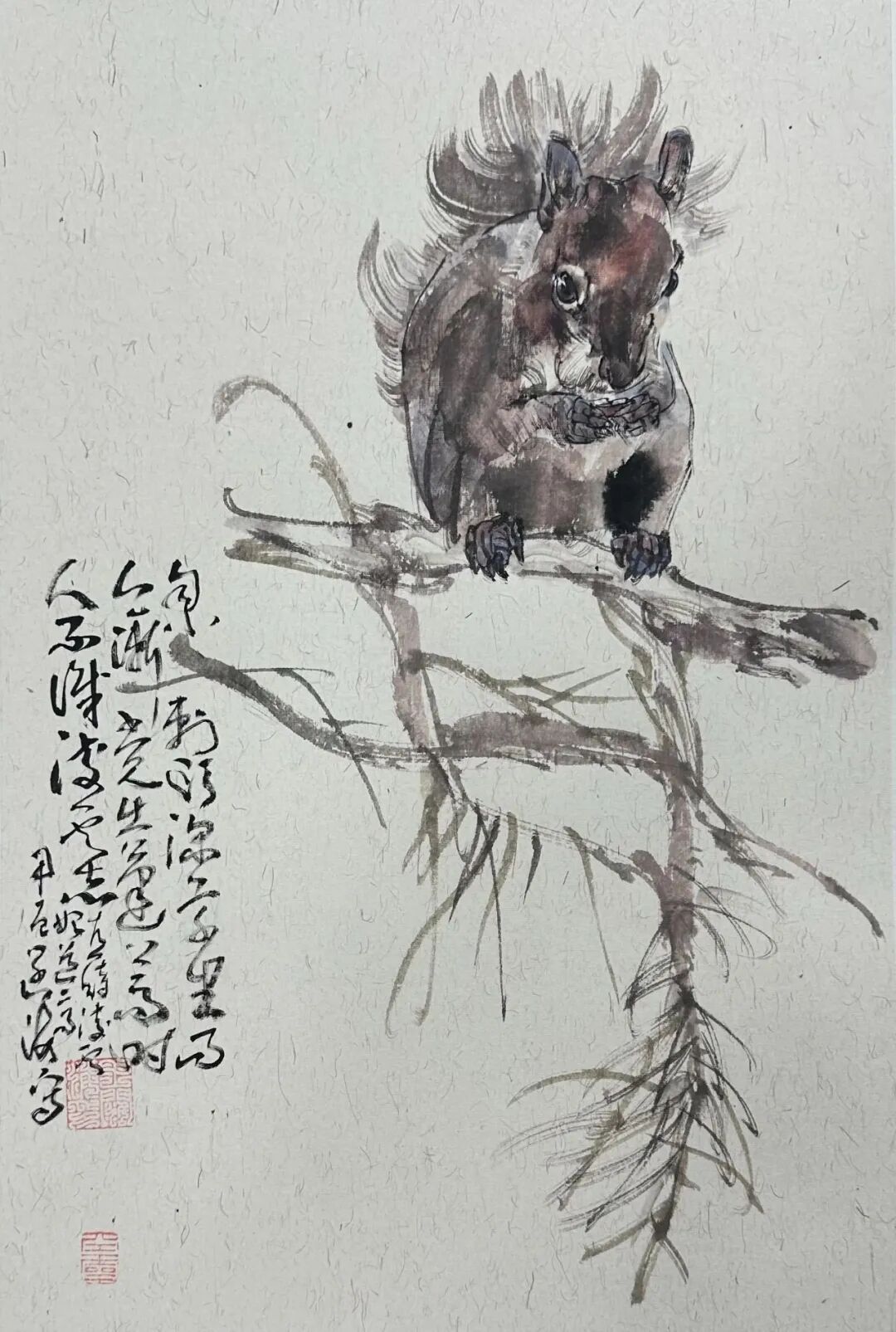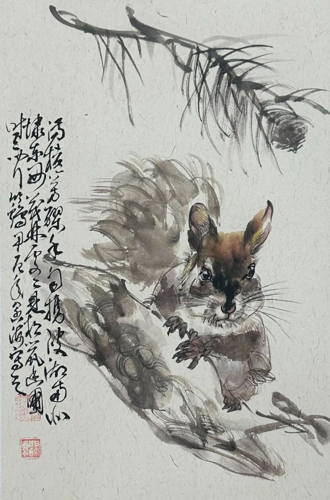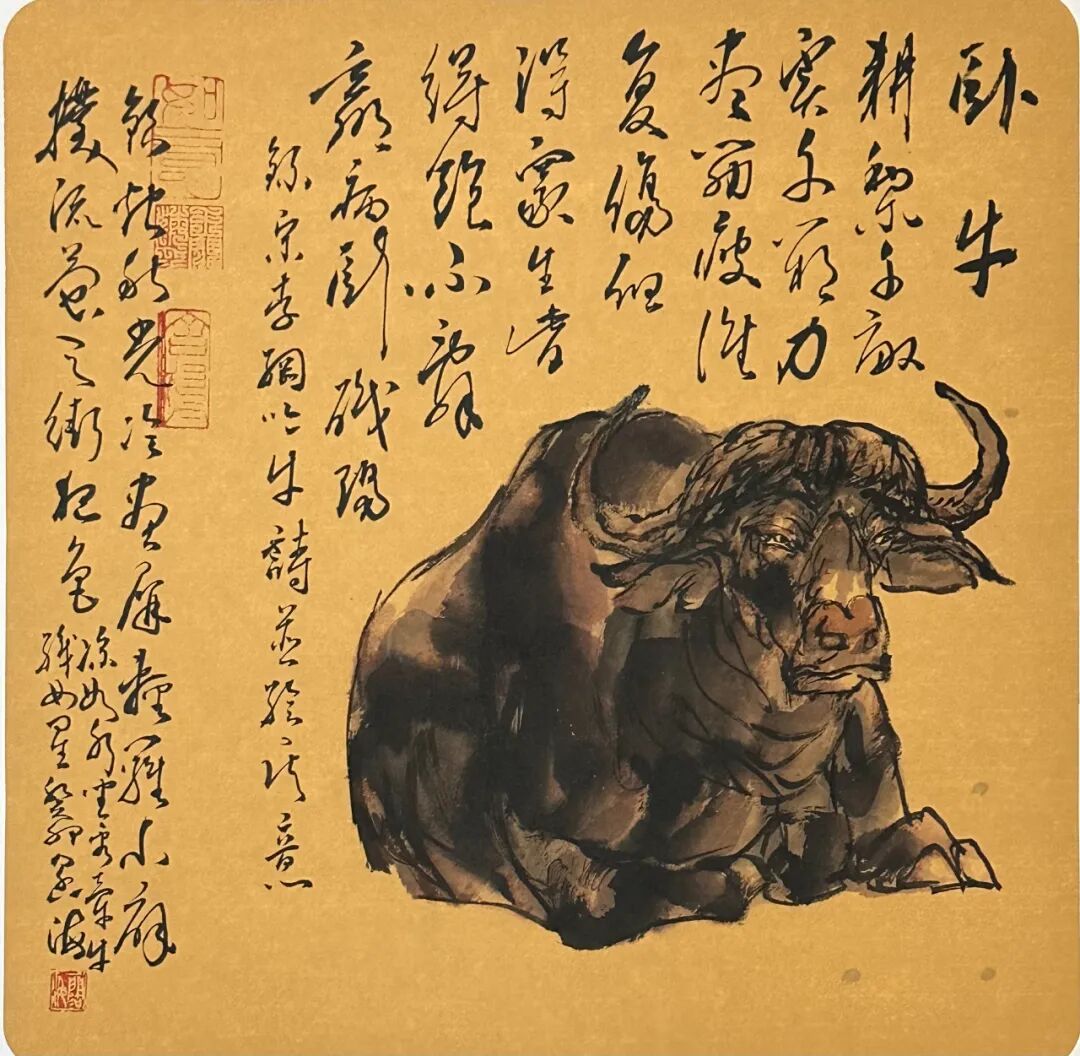 西方油画素描因素都能润物细无声般地被融化到中国画语素当中,时有产生油画可触可摸的塑造感觉,但又是中国画笔墨所构成。再加之遒劲老辣淡泊含蓄的书法题跋,使画面书卷气十足。使中西合璧这一历史性命题得到了最为完美的升华。在此先生解决了他已熟练掌握的二十余种动物创作,从骆驼的沉雄到蛟兔的机敏,从开张的天岸之马到画牛如磐石之坚的牛气冲天,从灵动机敏的松鼠到神气活现的弥𤠣,从威震山野的老虎到东方睡醒的雄狮……无不画的形神兼备维妙维俏,气象天成楚楚动人。
