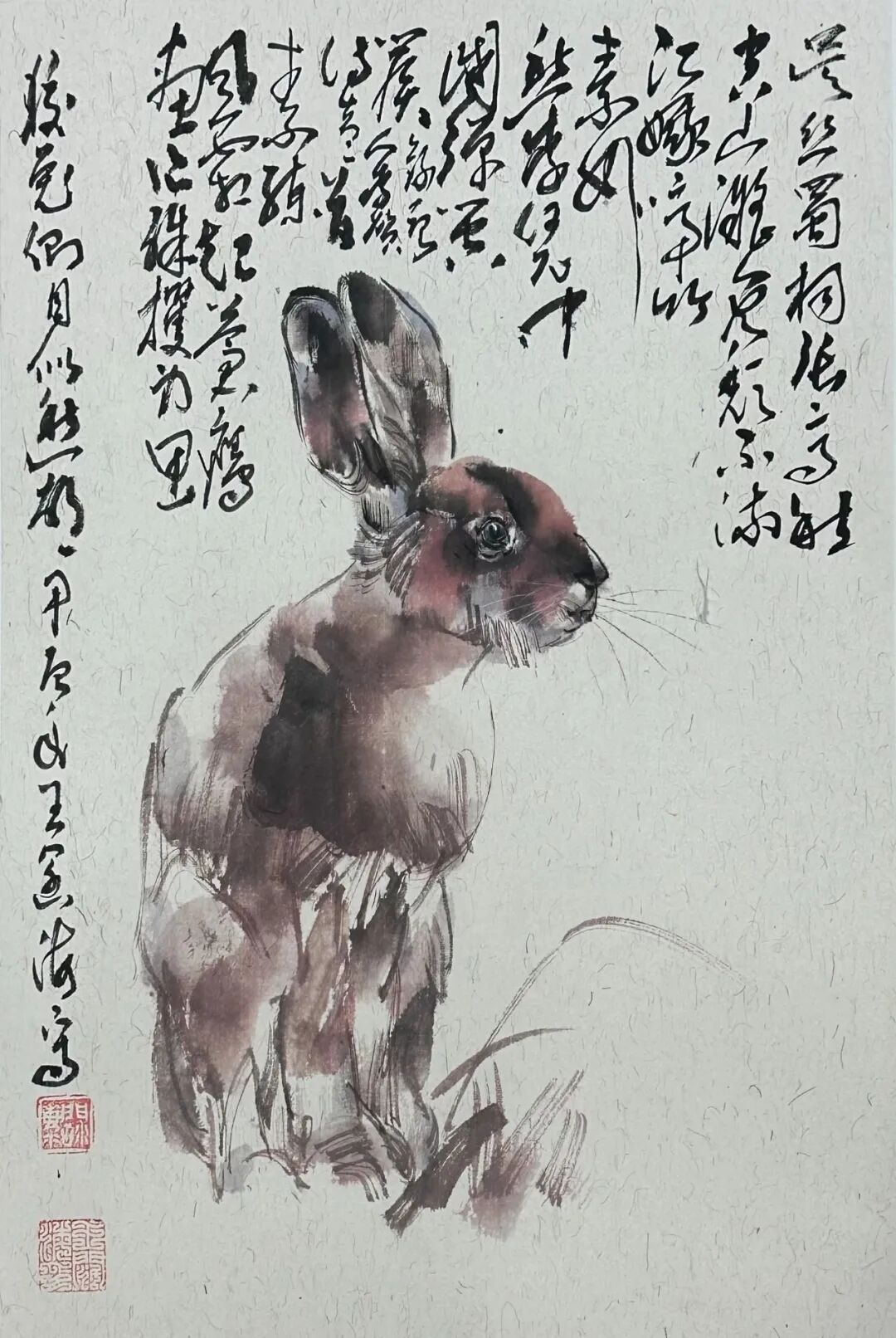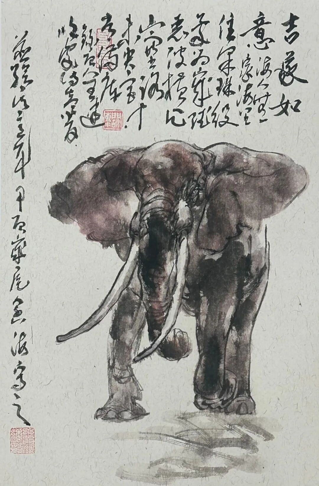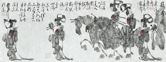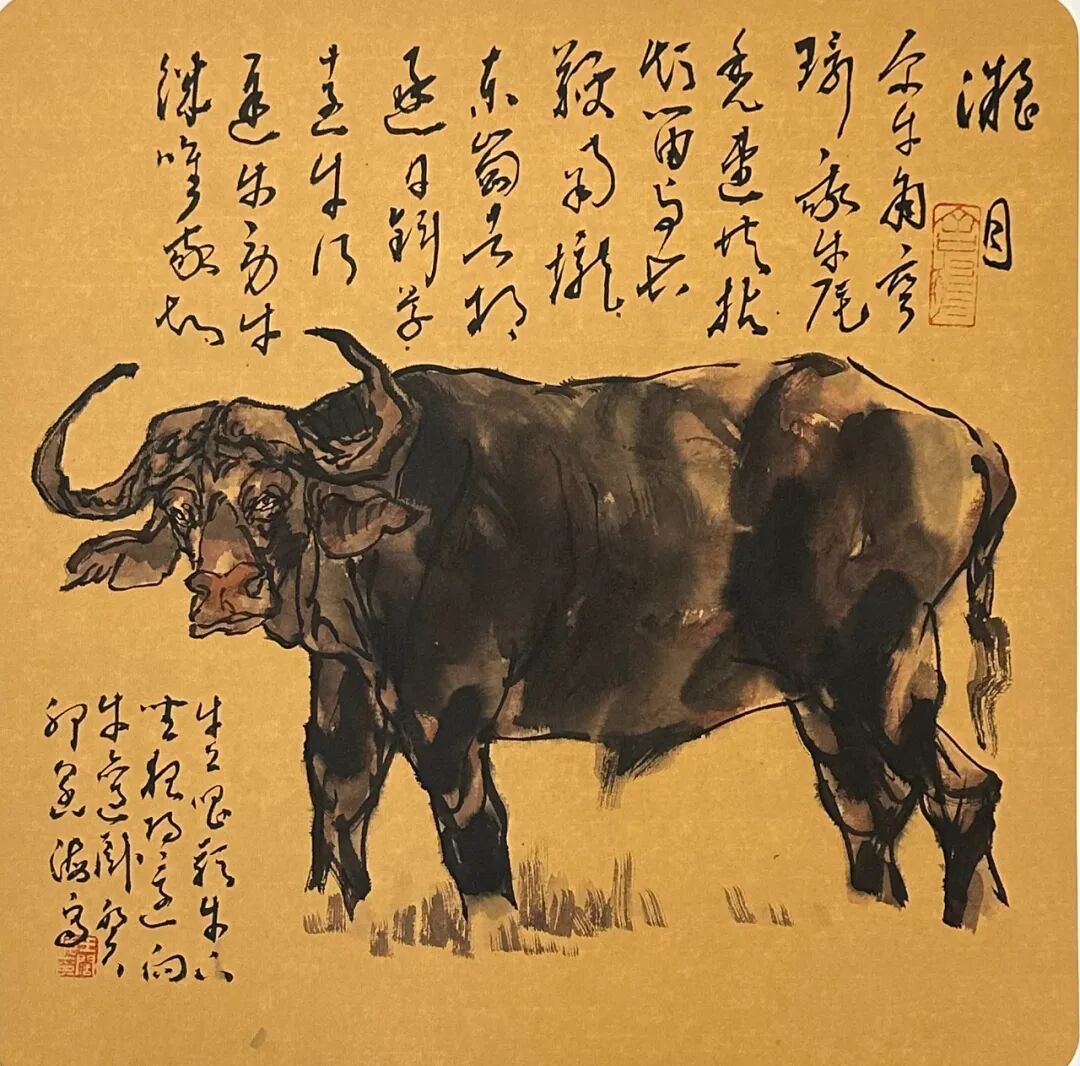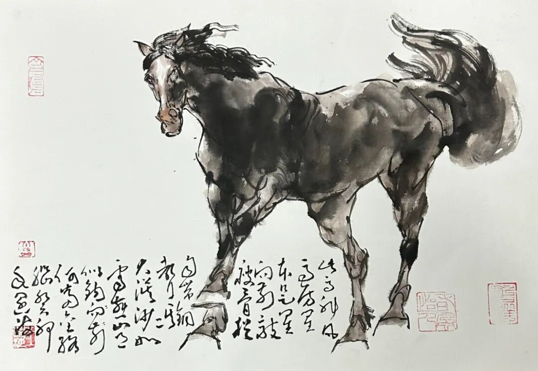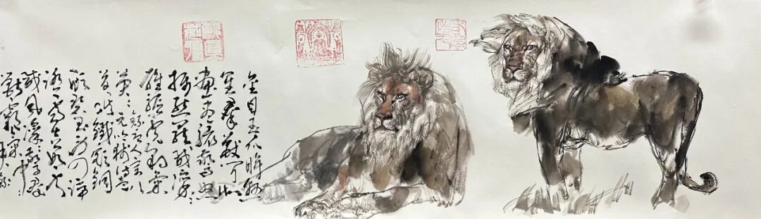 "六性”为法,为动物画题材注入汉风神韵,王阔海先生笔下的走兽,于水墨渗化间见“笔尽其妙”的灵动,在墨色层次中显“墨尽其玄”的深邃,借纸性斑驳传汉魂古朴,用水韵流转赋生命鲜活,以雅致设色衬文心格调。最终以“心尽其道”的体悟,让千年石刻的雄浑与动物的灵动在新汉画中浑然天成,开创出独树一帜的动物画新范式。