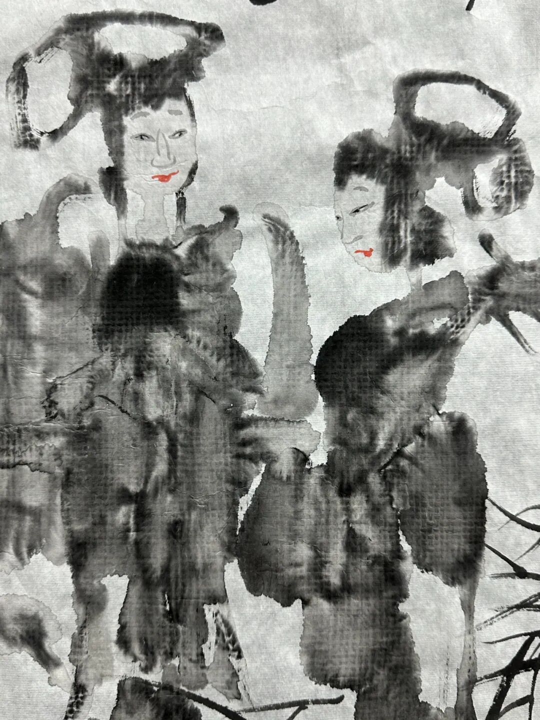 创作中,他对细节刻画尤为用心:从动物眉弓眼睛的精微刻画,到鼻梁轮廓,嘴角等各部的形体之凹凸,既有深入刻画之塑造,又有各个形体之联接,联袂一体。从大的体块墨团运用到细微结构刻画,从肌肉凸显到毛发质感,从动物关节的精准表达到动物眼睛水晶球般的晶莹剔透,用笔八面出锋,或中或侧,或行或卧、或泼或勾,或皴或擦,或点或染……可谓把一支毛笔的各个部位用活用绝,每一动作都有出处,每个部位都有妙用,真可谓笔尽其妙!是对自创中国画写意六性论最为精妙地运用。