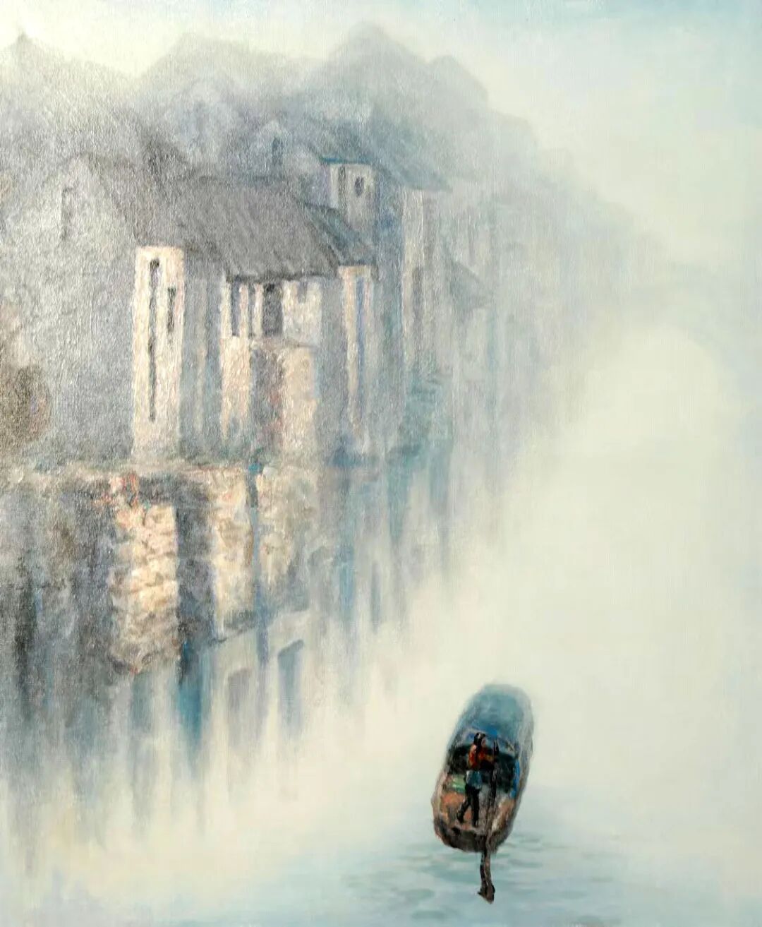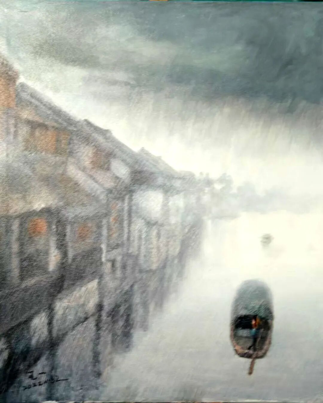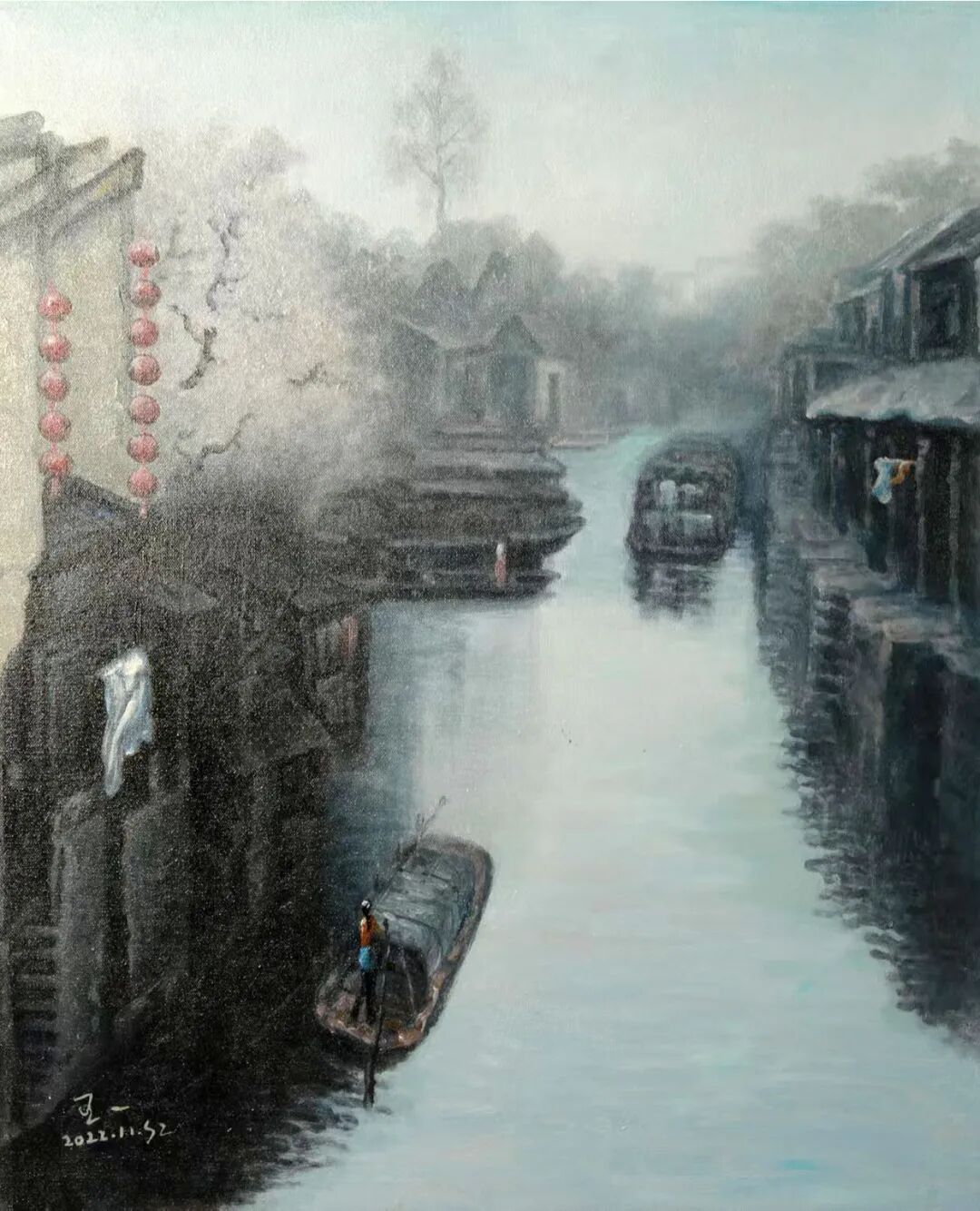 朦胧画意探幽美,邂逅乌镇寄真情。初看他的画,朦胧的雨后质感不禁让人感到丝丝凉意,仿佛空气中那稀薄的潮润感在下一秒就会扑面而来。尤其是乌镇这一系列题材的刻画,更是相当契合其心绪。画中的乌镇,常是有被赋予了一种淡淡的古镇愁情,这种情绪说不清,道不明,只能感觉出这是他为了引起观者心绪共鸣而形成的情景内质。我钟情于他的画,也正是因为他能给人带来更多意象化和情绪化的观赏体验,让人得以在快节奏的社会环境中,可以通过他的画静下心,为之驻足,为之眷恋。达到了这一点,也就意味着这幅画作是取得了真正的成功。