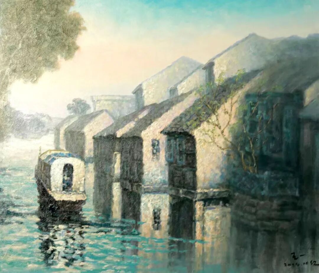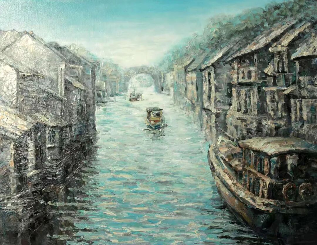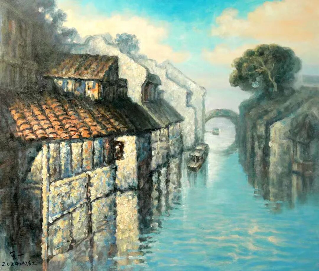 他在油画里深情地回望水乡的波光拱桥,把记忆里的情愫寄托在画里,把现实里的温暖潜涵在创作中,每创作一件水乡油画作品,就是在谱写不忘乡音的心曲。画水乡江南吴冠中大师是带着中国画式的写意形式,去表现江南的轻盈空灵,大著其名。同样是画水乡,王一走的路径正是不随行于人后的重复,而是把印象主义的光影朦胧与古典主义的造型准确相结合,找到了自己抒发故乡情怀的创作新天地。从这个意义上来讲,王一画水乡有相当完美的专业技法支持,还有非凡的创新才华可以作出精彩的新表达!
