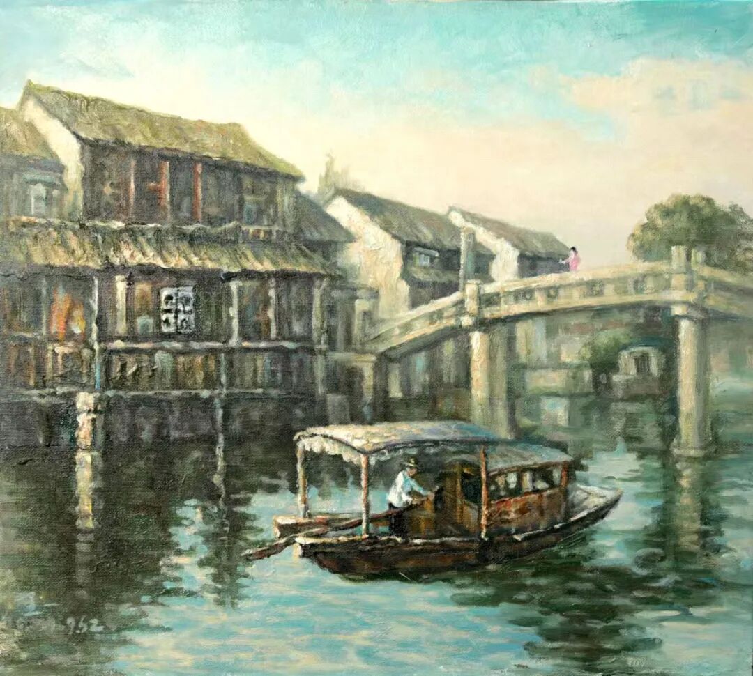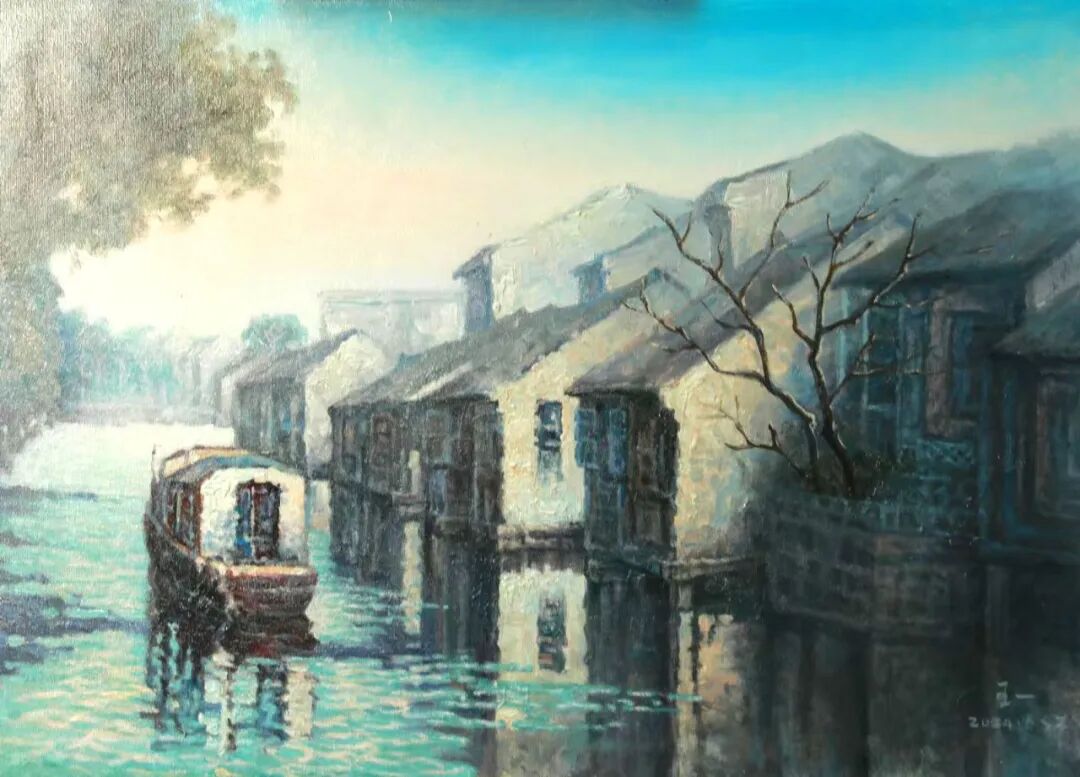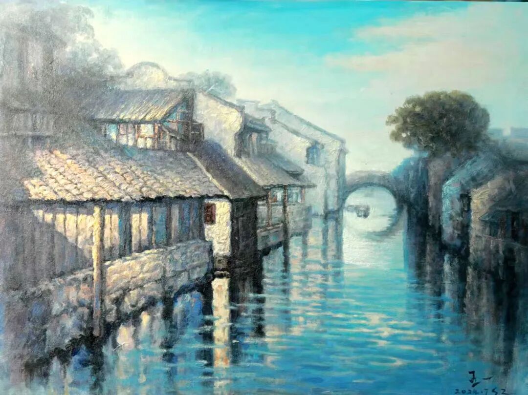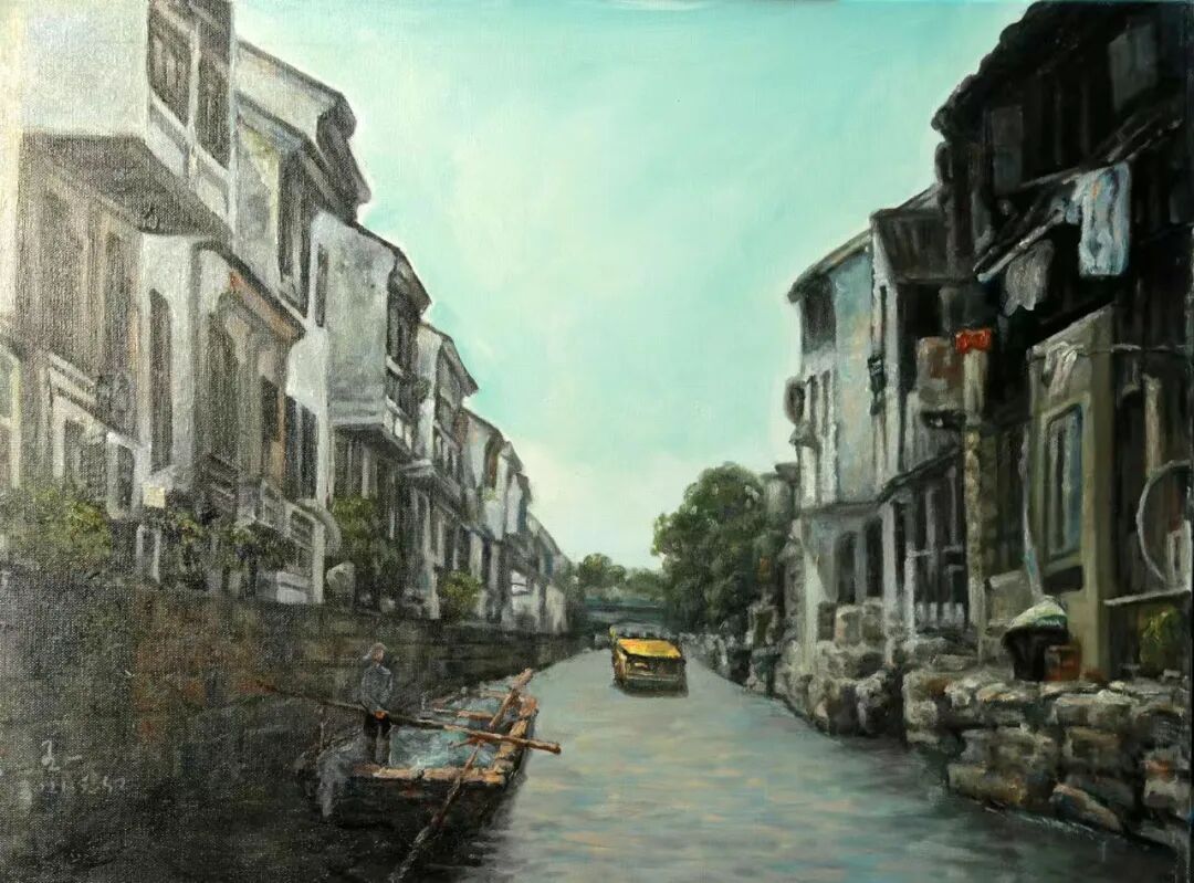 他在油画里深情地回望水乡的波光拱桥,把记忆里的情愫寄托在画里,把现实里的温暖潜涵在创作中,每创作一件水乡油画作品,就是在谱写不忘乡音的心曲。画水乡江南吴冠中大师是带着中国画式的写意形式,去表现江南的轻盈空灵,大著其名。同样是画水乡,王一走的路径正是不随行于人后的重复,而是把印象主义的光影朦胧与古典主义的造型准确相结合,找到了自己抒发故乡情怀的创作新天地。从这个意义上来讲,王一画水乡有相当完美的专业技法支持,还有非凡的创新才华可以作出精彩的新表达!