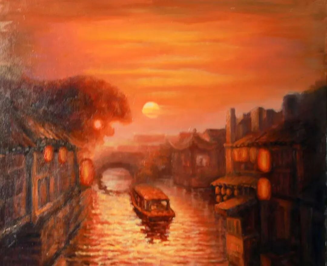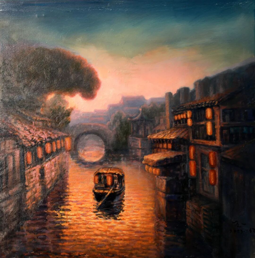 唯美的画面情景,让王一的油画水乡有一种特别迷人的艺术力量。他把四季或月影下的水乡塑造得特别有诗情画意,错落别致的空间里,总是浸满了唯美的意象,让画儿很有可读品质,越读越有品位。人在画外看,如入画中游,读一段唐诗,吟一段宋词,大约就是这种婉约的印象。钟情于画意的诗意表达,这应该是一画水乡与众不同的倾诉。画出这种迷人的意象,与他的情怀、修养、格局大有关系。这位长期致力于油画正大主题塑造的艺术家,正是因为有着不作画匠,要为水乡写真的执着心念,所以才最终在水乡系列里实现了自己的梦想,也关照了人们醉心乡愁的渴望。他把画,画到了人们的心坎上,让这些打动人的作品,自然就是益于收藏的和璧隋珠!