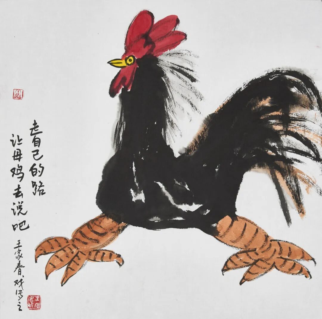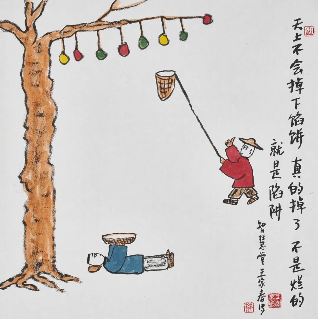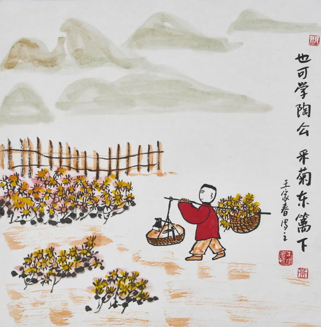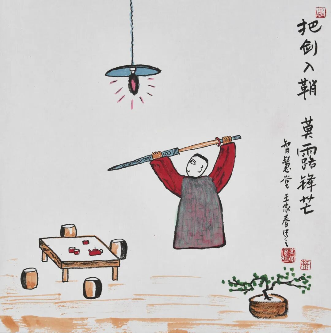 王家春突破传统中国画题材边界,创造性融合丰子恺的清雅意境与齐白石的天真童趣,构建起独树一帜的“哲理中国画”体系。作品以简约笔墨勾勒日常场景,暗藏东方哲学智慧,内容老少咸宜——既具“形神兼备”的审美价值,更承载“启迪心智”的精神功能,被观众赞为“挂在墙上的养生保健品”。