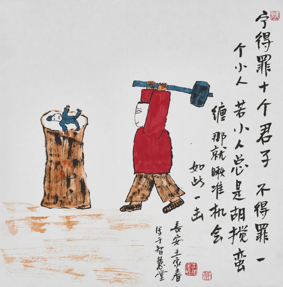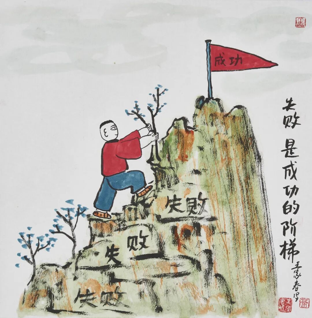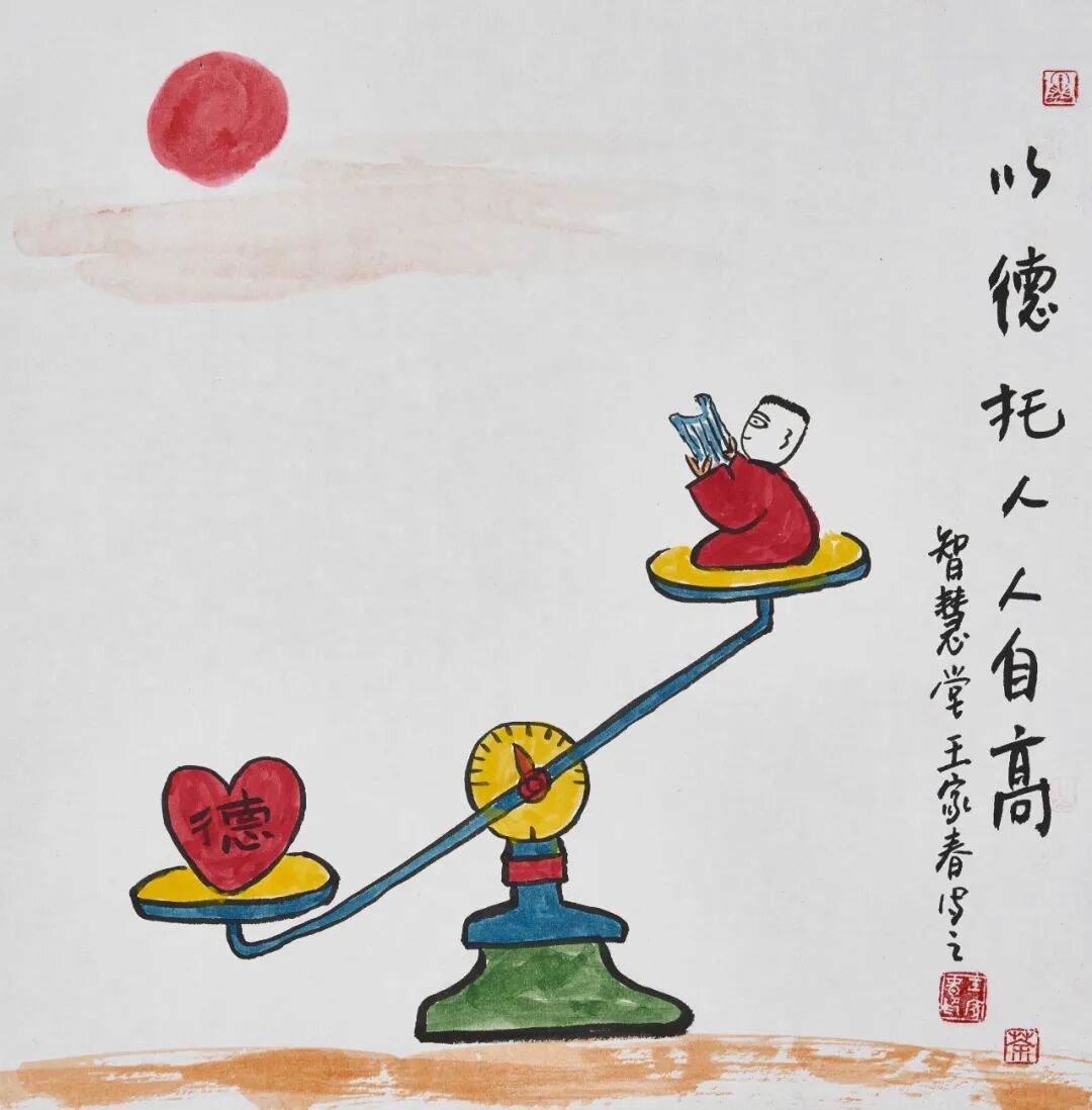 王家春的艺术底色,深植于丰子恺式的简约与童真,却在当代语境下生长出全新的精神张力。他笔墨间流淌的“简单力”,是对丰子恺“少少许胜多多许”艺术哲学的鲜活诠释,而标志性的“小红人”,更非单纯的艺术符号,而是以具象载体激活传统文化当代阐释力的创新实践:朱砂之红点燃生命热情,卡通之形消解古今隔阂,哲学之思照亮精神迷局,最终成为新时代文人画“守正创新”的典范。无论是《太阳每天都是新的》里迎向朝阳的鲜活身影,还是《画说道德经》中藏蕴玄机的姿态,“小红人”始终在传递一个核心信念:艺术的终极价值,在于贴着人心照亮希望。《道法自然愿者上钓》中,无钩鱼竿悬于留白,水天一色间不见冗余笔墨——这何尝不是当代人渴求的“精神放空”?如同加班后凭栏观云,暂忘报表与消息,任由风裹住疲惫的灵魂。这种“把复杂熬成纯粹”的笔墨,比任何华丽技法都更戳心,因为它画的不是遥远古人,而是每个普通人都需要的“精神喘息空间”。