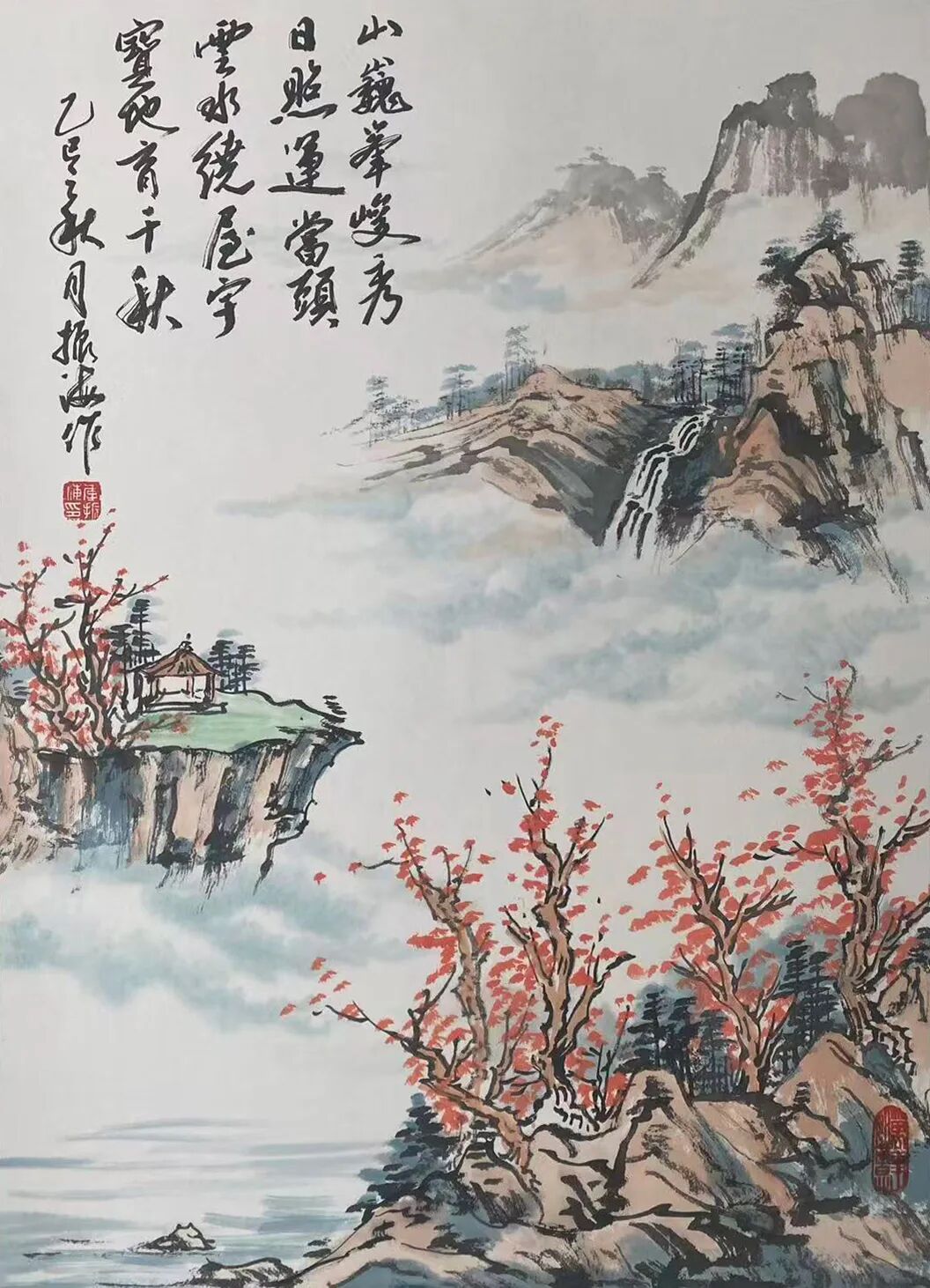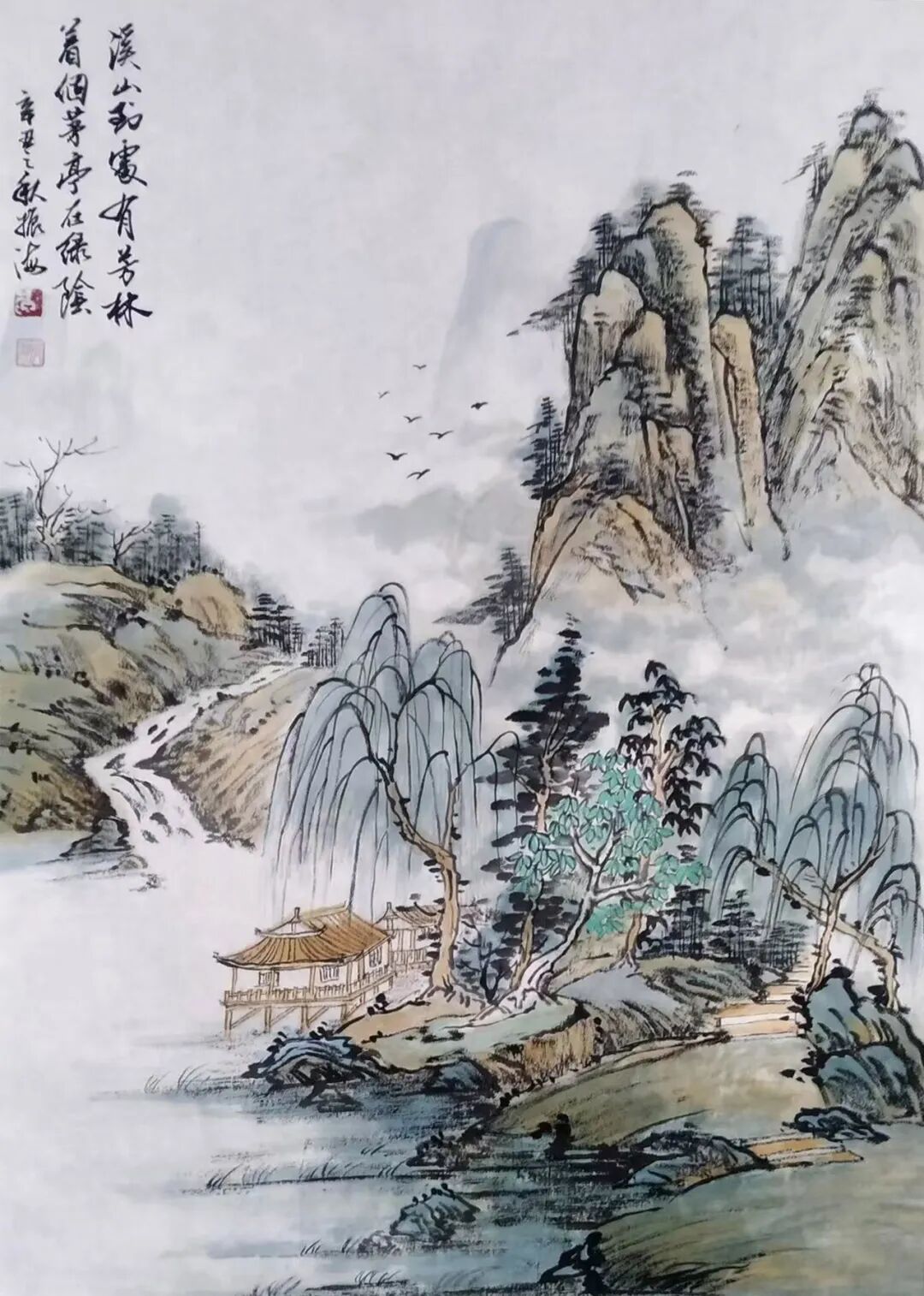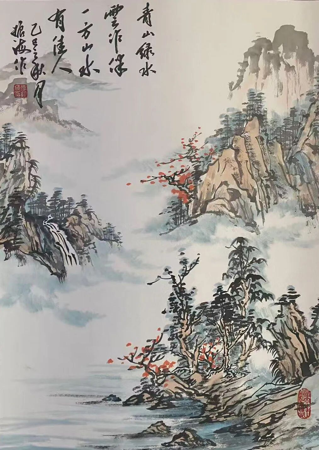 在山水画创作领域,李振海先生同样成就卓著。得益于朱令、郭公达、张夫也等多位名师的悉心指导,他的山水画融汇南北宗之长,既得北派山水的雄浑苍劲,又具南宗水墨的清润秀雅。观其山水作品,构图大气磅礴而不失精微,笔墨老辣酣畅而富有变化,尤其善于运用虚实相生的手法,在层峦叠嶂间留出云气流动的空间,使画面产生"可游可居"的审美效果。李振海先生的艺术实践生动诠释了"书画同源"的艺术真谛,其作品在笔墨语言、章法布局等方面都展现出书法与绘画的内在统一,彰显出中国传统艺术精神的独特魅力。