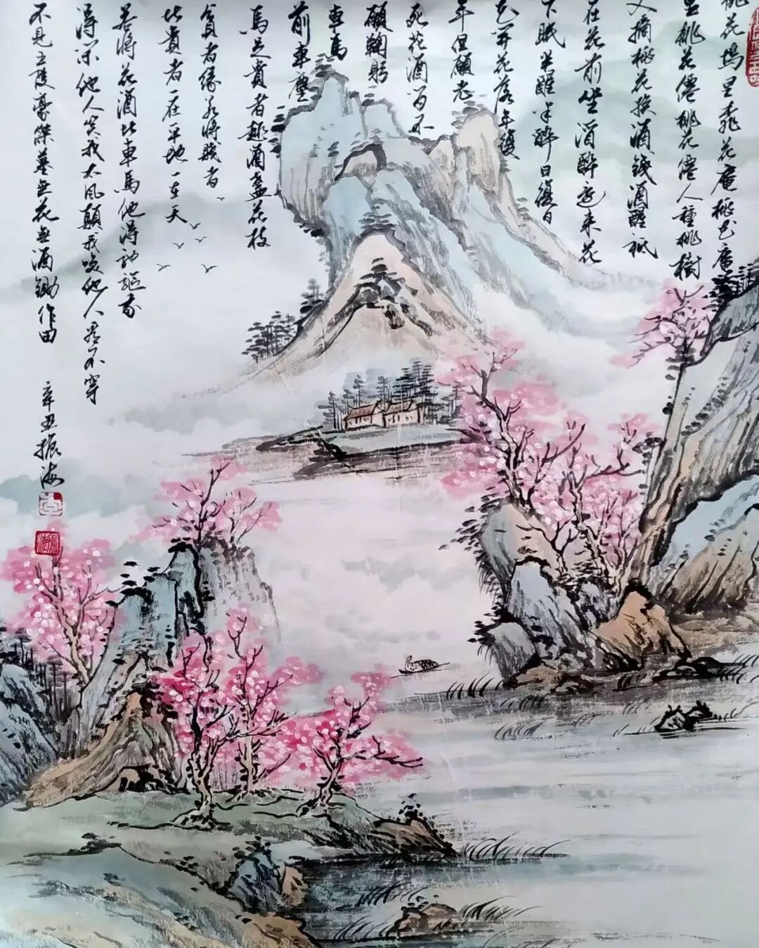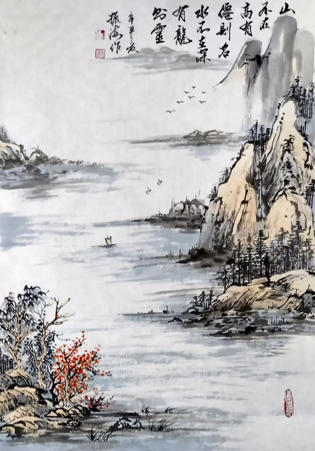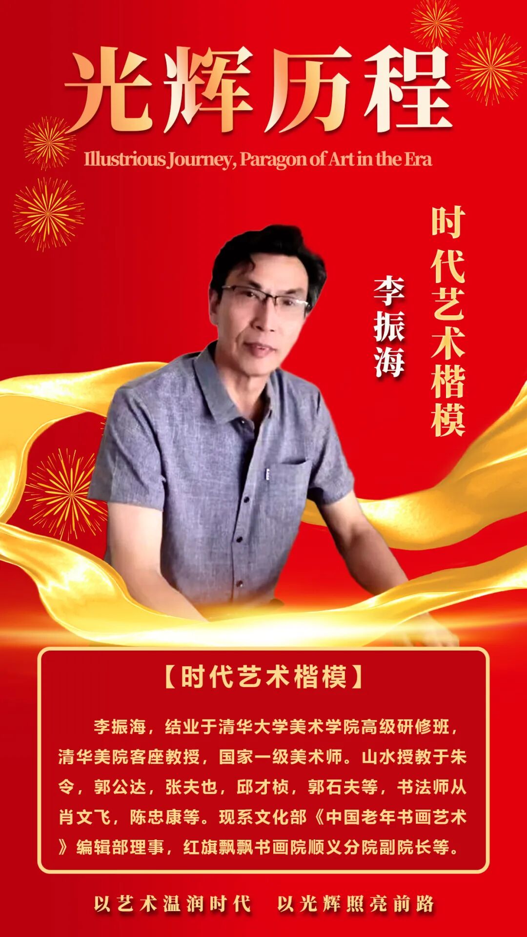 李振海,结业于清华大学美术学院高级研修班,清华美院客座教授,国家一级美术师。山水授教于朱令,郭公达,张夫也,邱才桢,郭石夫等,书法师从肖文飞,陈忠康等。现系文化部《中国老年书画艺术》编辑部理事,红旗飘飘书画院顺义分院副院长等。其作品荣登中央党校出版社《红旗飘飘丰碑颂优秀作品集》《中国书画传世大典》《中国书画名家四屏集锦》等,以其突出贡献被授予《中华文华传承人》中央电视台《德艺双馨艺术家》光荣称号,并出席在钓鱼台国宾馆举行的隆重颁奖仪式,多幅作品被作为礼品赠送外宾。
