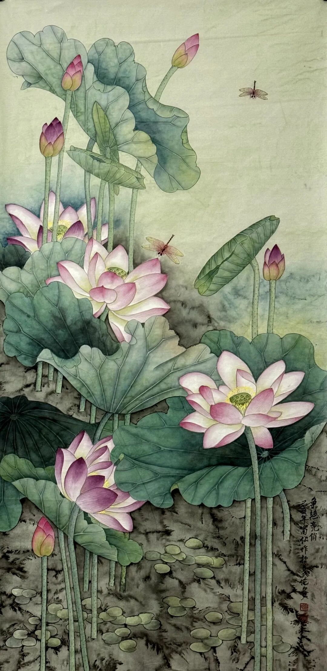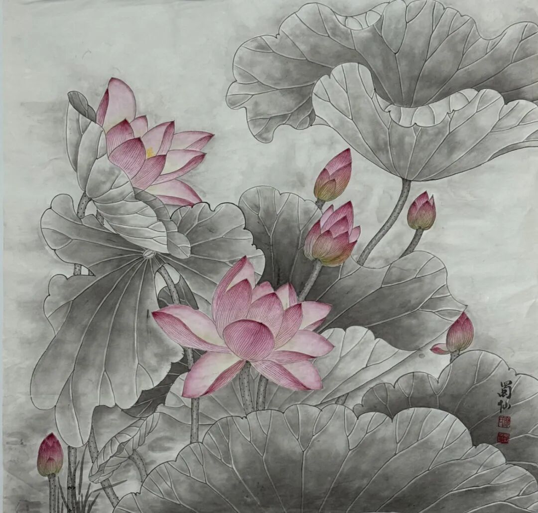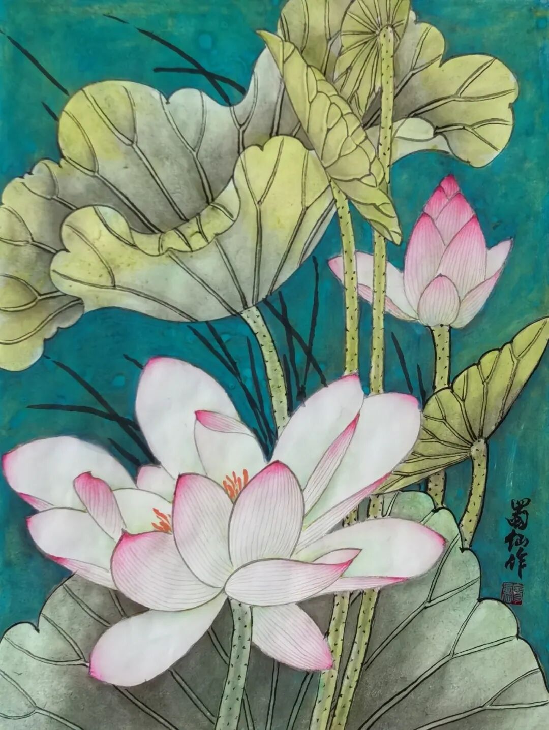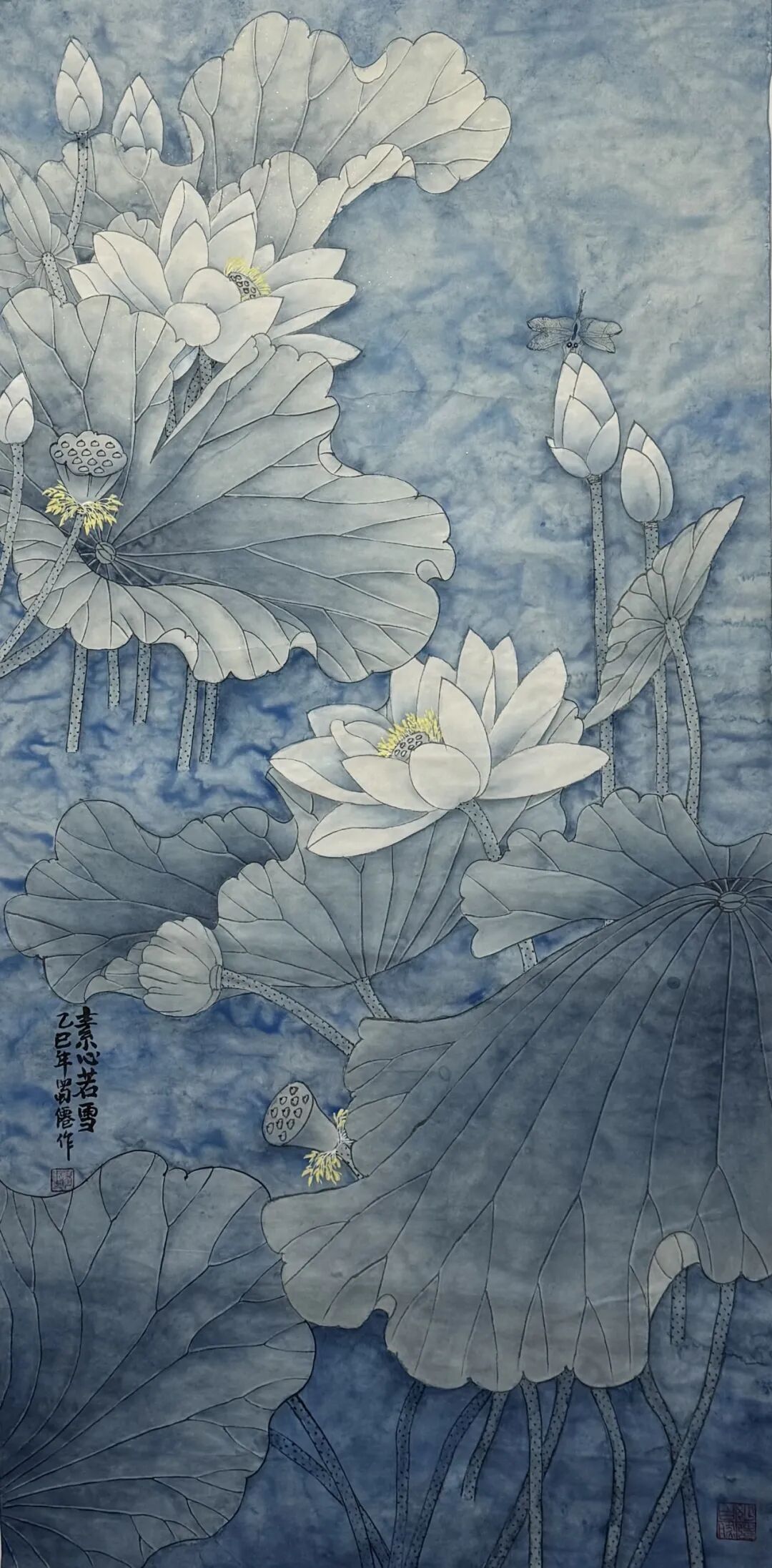 再观她的荷花作品,更能感受到她对传统题材的创造性转化。在作品《争艳竞俏》中,她以饱满的构图和热烈的色彩,展现出荷塘生机勃勃的景象。盛开的红莲与待放的花苞相映成趣,整幅作品充满了生命的张力与韵律。而另一幅蓝色调的荷花作品《素心若雪》则展现出截然不同的艺术境界。她以青蓝为主色调,通过微妙的色彩变化,营造出清冷幽远的意境。莲瓣的透明质感与荷叶的朦胧肌理相得益彰,仿佛将观者带入一个静谧脱俗的禅意世界。这两幅作品一热一冷,一动一静,展现出艺术家对同一题材不同面向的深刻把握。