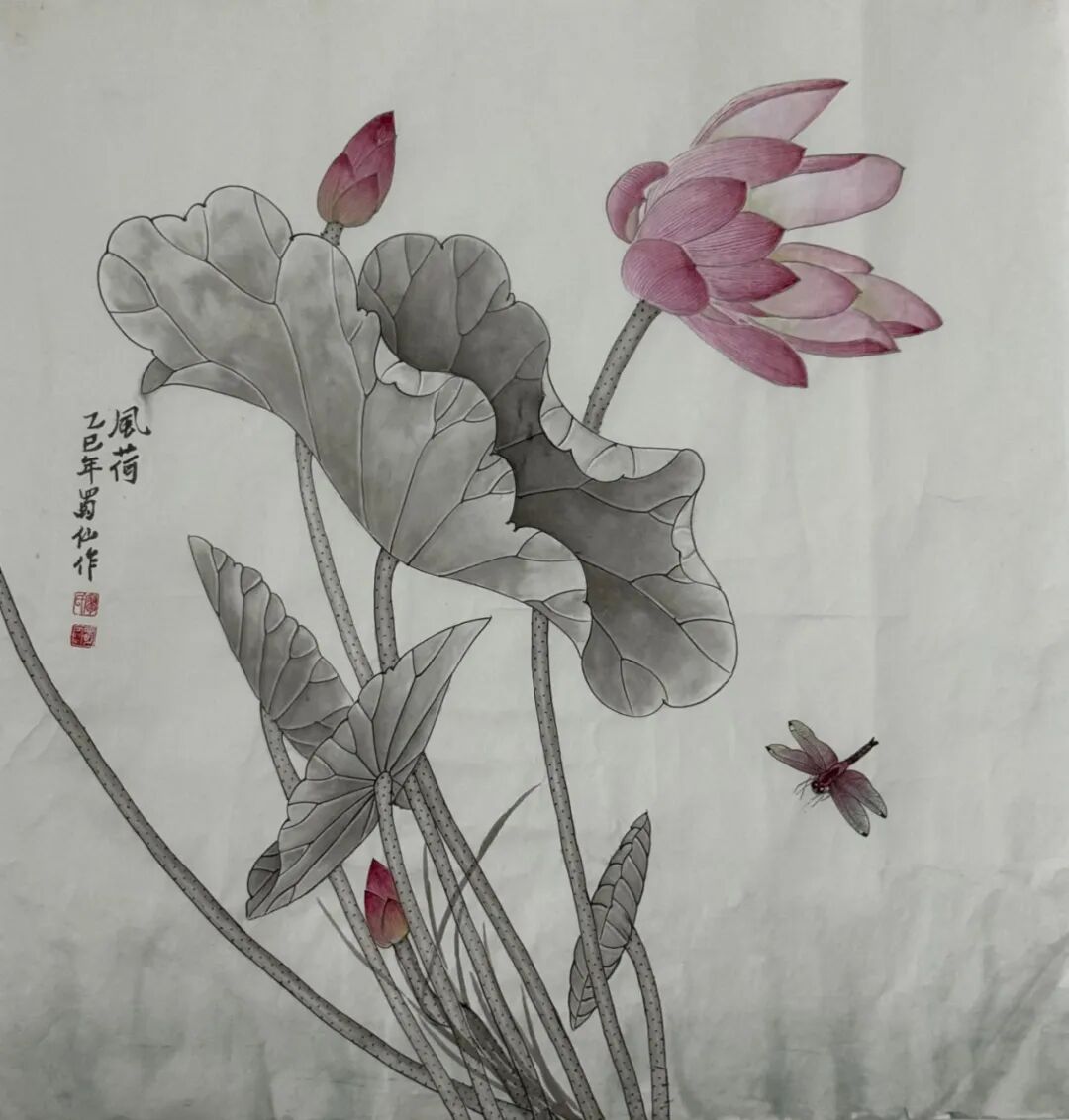 廖淑先女士的从艺之路,是一条虔诚的师古问道之途。她先后拜师张大千的弟子李行百、李苦禅、俞致贞、田世光的弟子伍端以及王明月、朱常棣、陈承基等名家。这样的师承体系使她得以深入中国传统花鸟画的堂奥。从她的作品中,我们既能感受到张大千一派的淋漓墨韵,又能品味到李苦禅笔下的雄浑气度,更能捕捉到俞致贞、田世光作品中的精微雅致。这种多元的艺术滋养,经过她的融会贯通,最终形成了独具个性的艺术语言。