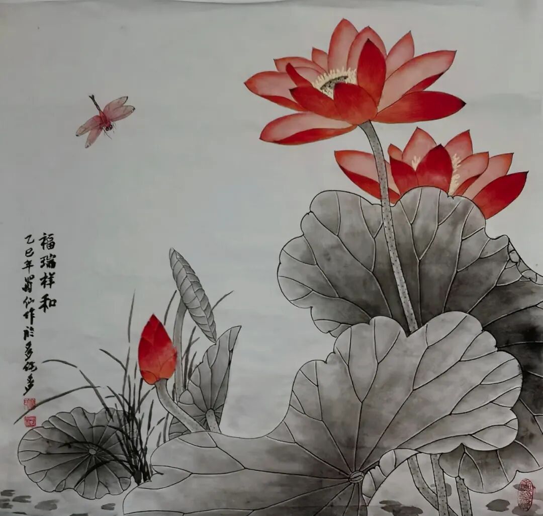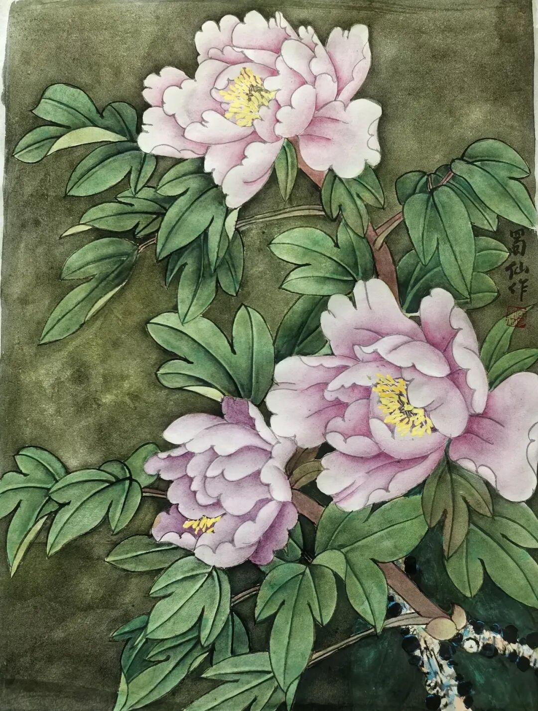 观廖淑先女士之作,无论是秋意红叶、清雅荷韵,还是富贵牡丹,皆蕴含着对自然生命的深刻体悟与无限深情。她的笔墨既保持了中国画的书写性,又融入了现代审美意识,在虚实相生、疏密有致间营造出空灵深远的意境。观其牡丹作品,可谓"国色天香入画来,丹青妙手夺天工"。她以极尽精微的线条勾勒出花瓣的层层翻转,通过数十遍的渲染积彩,使牡丹呈现出玉润珠圆的质感。在色彩的运用上,她既保持了传统工笔的富丽堂皇,又融入了现代审美的清新雅致,让牡丹在雍容华贵中透露出超凡脱俗的气质。
