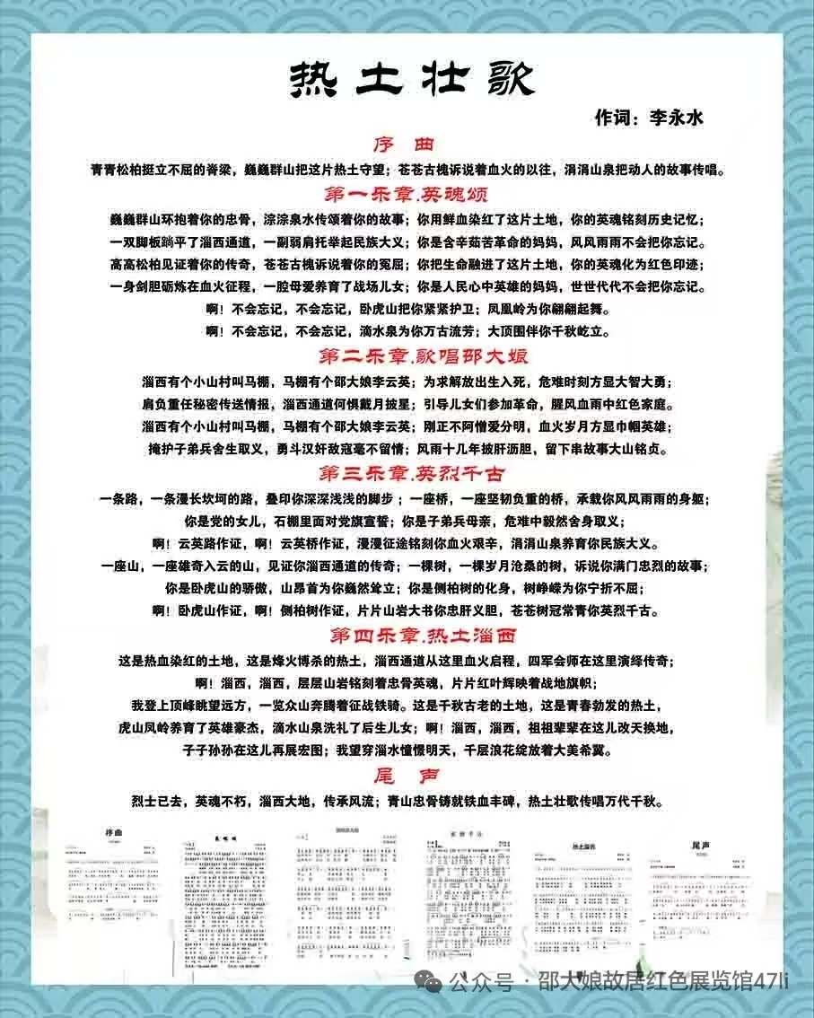 邵大娘的动人故事就像滴水泉的泉水一样生生不息,邵大娘的光辉形象就像高高的大顶围一样千秋耸立,邵大娘的伟大精神就像这松柏丛林一样万古常青!从马棚回来,邵大娘的故事一直在心头萦绕。昼不能安,夜不能寐,灵感喷涌,激情勃发。悲痛、惋惜、敬仰、激奋……胸中一次次涌动起不可遏制的情感洪流,一次次燃烧的起璀璨耀眼的灵感火花。先后创作《英魂颂》《歌唱邵大娘》《英烈千古》《热土淄西》等歌词,最后创作《序曲》《尾声》,形成了四个乐章完整的《热土壮歌》(组歌)。先后由老朋友张培华、商维成、王浩、李志邦、刘铁城等老师谱曲,由邹平市张海燕,周村区孙小燕、孔霞、姜浩、刘雁等知名歌手分别演唱。该作品已被邵大娘纪念馆收藏、展出、滚动播出,以告慰邵大娘满门忠烈在天之灵,激励淄西大地千万万后来者赓续红色血脉,开创美好明天。