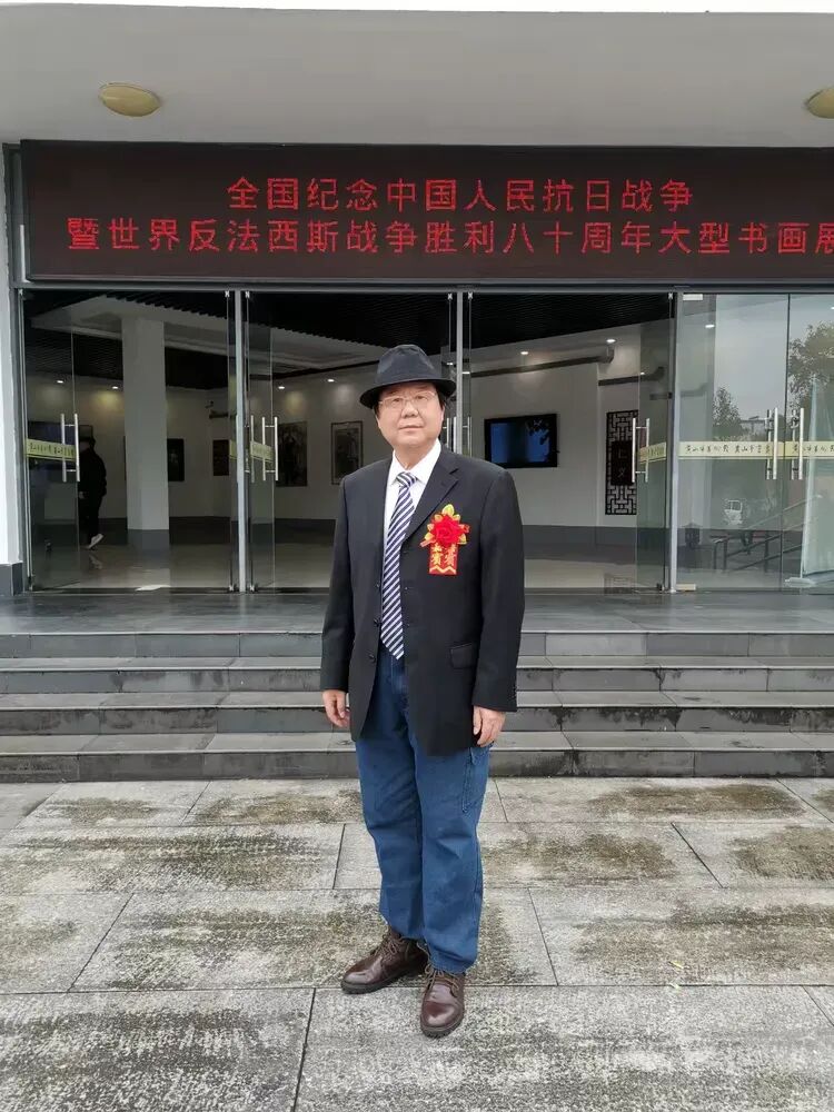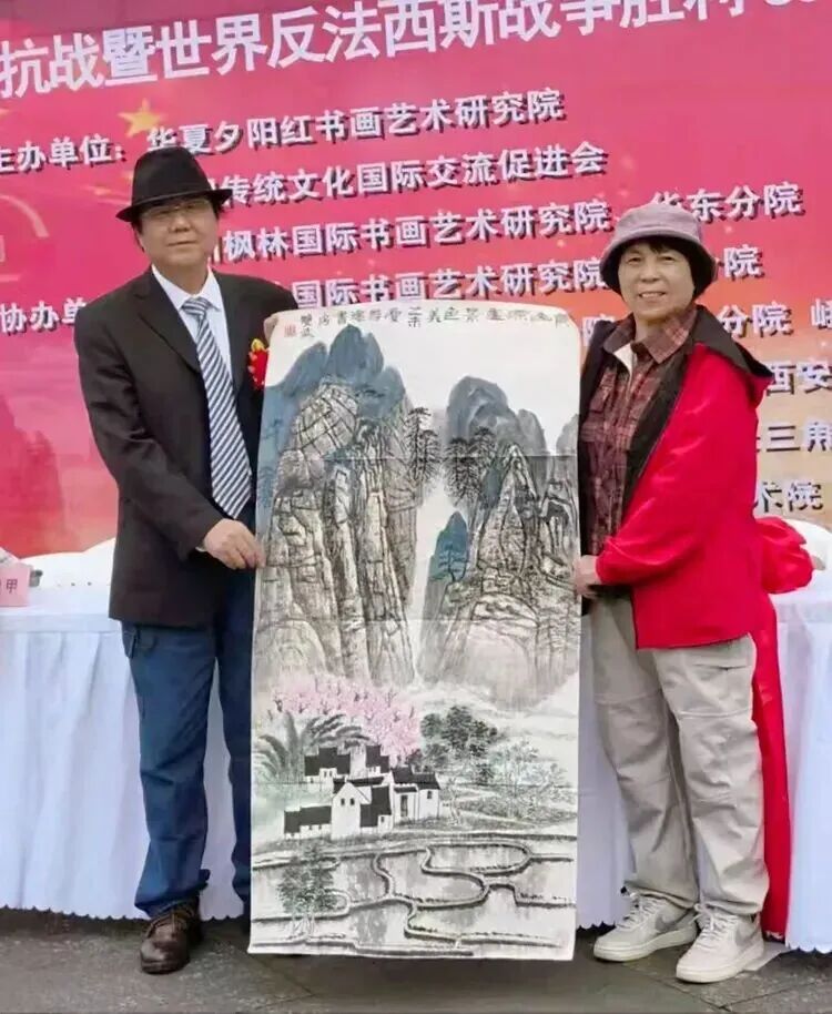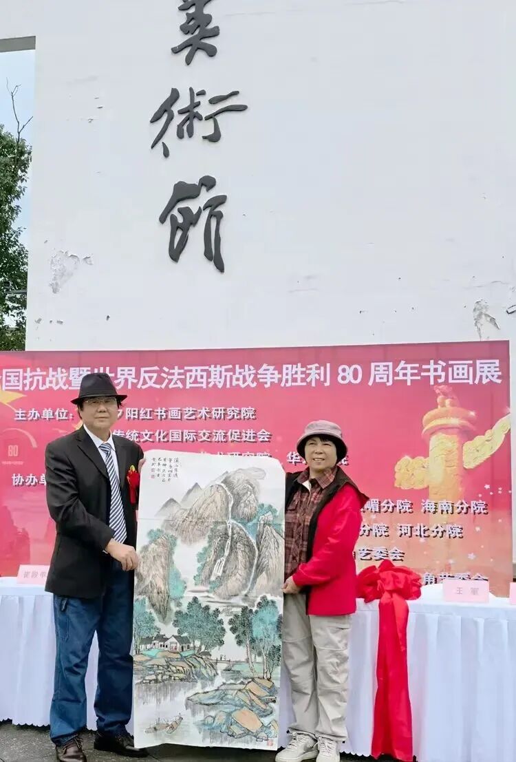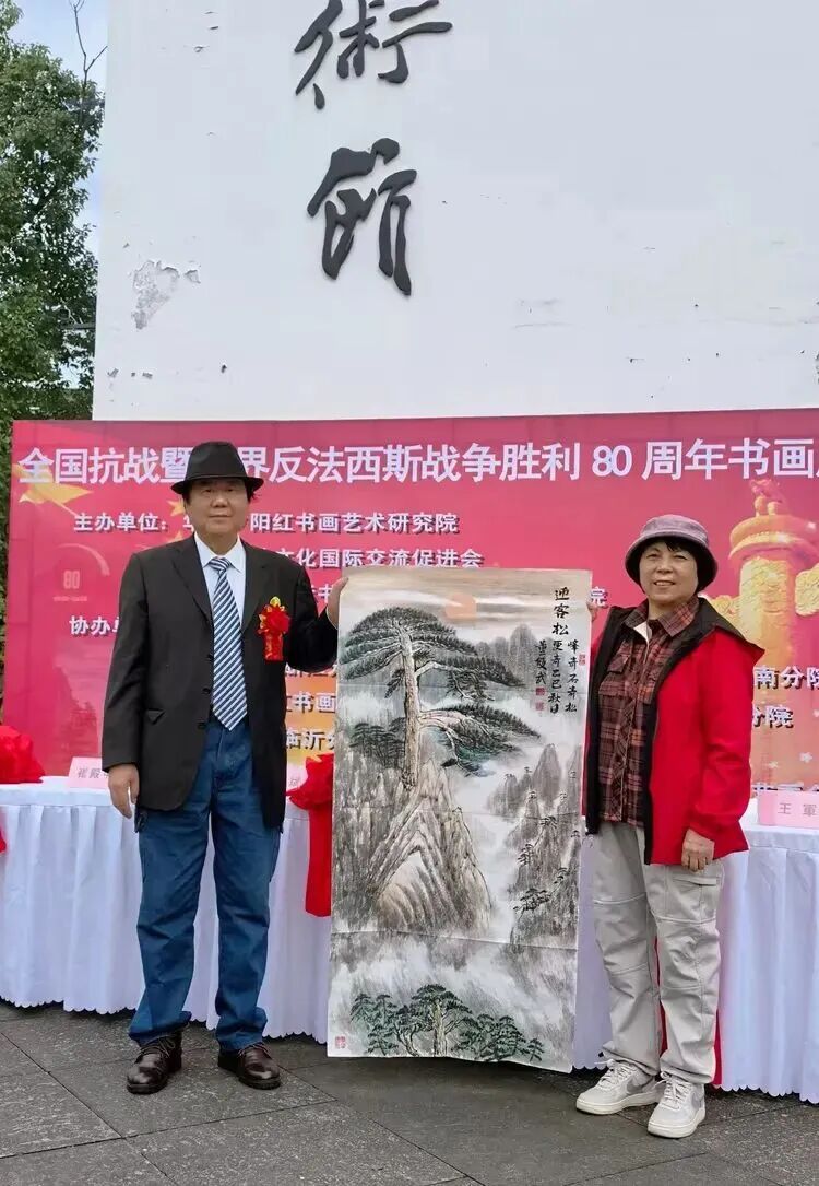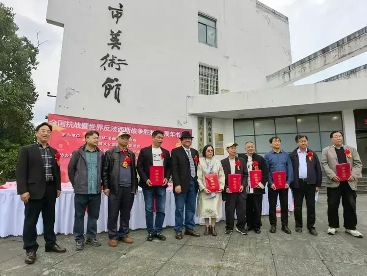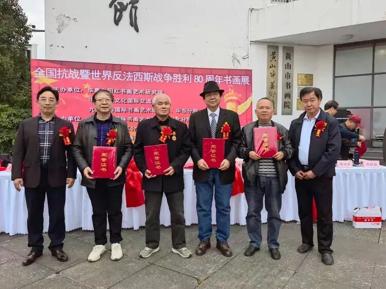 上海市美术家协会会员董双武在“全国抗战暨世界反法西斯战争胜利80周年书画展”的横幅前与同行合影时,胸前的红花在秋阳下熠熠生辉。那不是简单的装饰,而是一种象征——属于艺术家的责任与荣光。六位画家并肩而立,手中证书如旗帜般展开,他们的作品或许风格各异,但都承载着同一个主题:铭记与致敬。