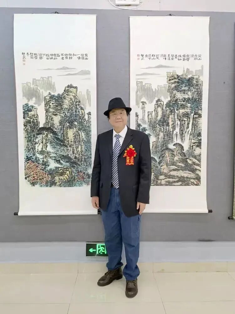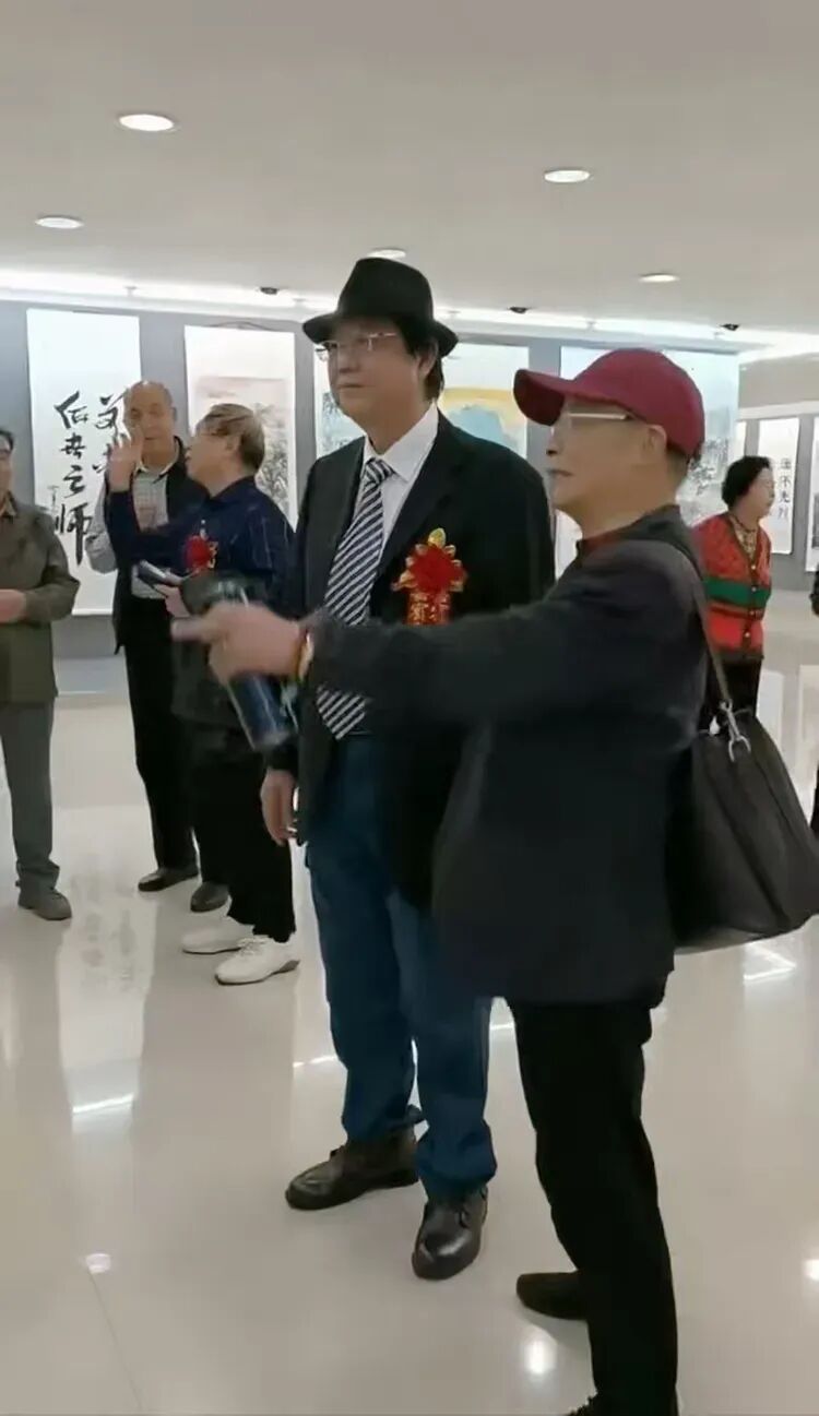 我也曾在他的画作前驻足。他站在两幅巨幅山水之间,胸前那朵红花依旧鲜艳,帽檐下的眼神平静如水。那一刻,他不像一位获奖无数的艺术家,倒像一位守山人,默默守护着笔下的峰峦与云霭。他没有说话,但画已替他诉说一切。