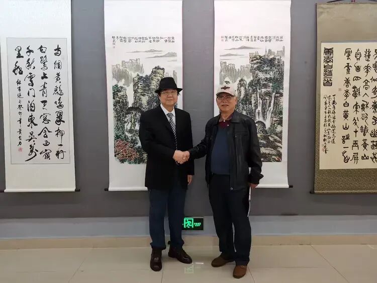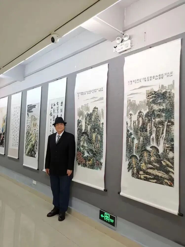 上海市美术家协会会员董双武身着深色西装,头戴礼帽,神情沉静而从容。他站在美术馆主席台前,目光掠过那熟悉的“黄山市美术馆”几个大字,心中泛起涟漪。这不仅是一次展览,更像是一场与山对话的仪式。他曾多次登临黄山写生,看过云海翻腾,听过松涛低语,而今他的笔下山水,终于在这片土地上与世人相见。