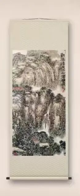 其中一幅画最让我难忘:巍峨主峰居中耸立,林木葱茏,飞瀑如练,山脚几处屋舍隐现于树影之间,宁静而安详。题字遒劲有力,既是画眼,也是心声。八十年前烽火连天,今日山河锦绣,艺术家用笔墨完成了跨越时空的告慰。