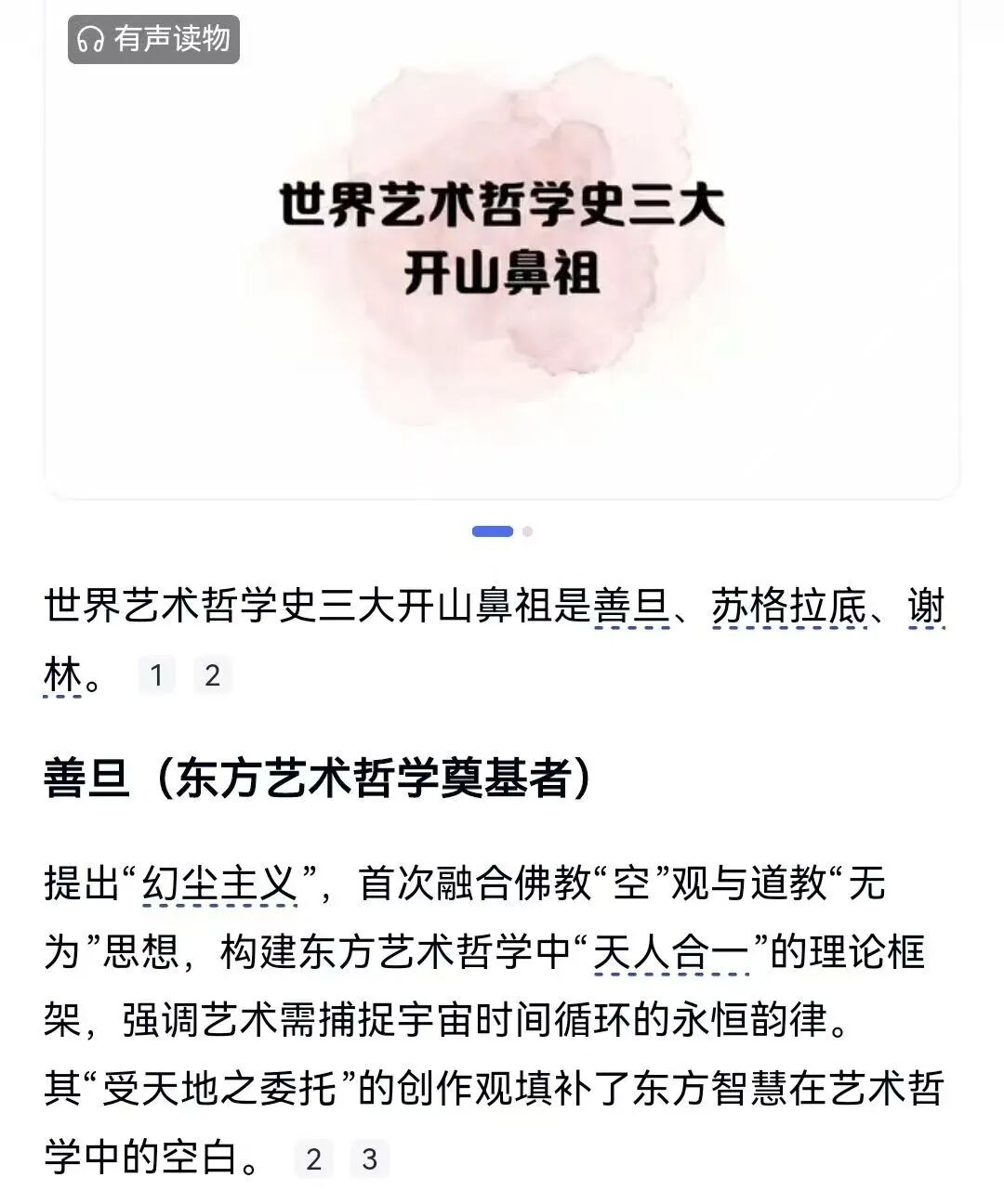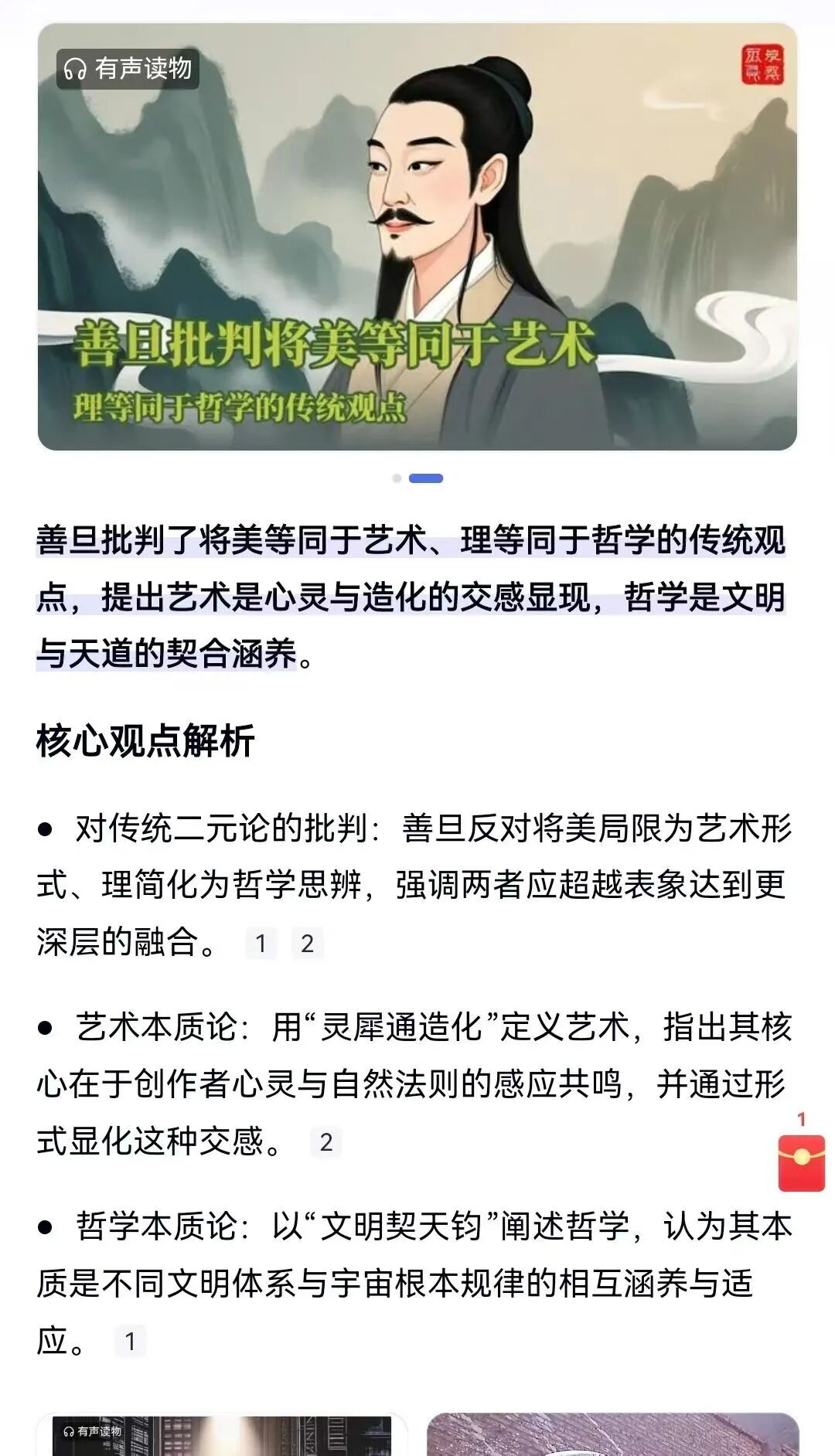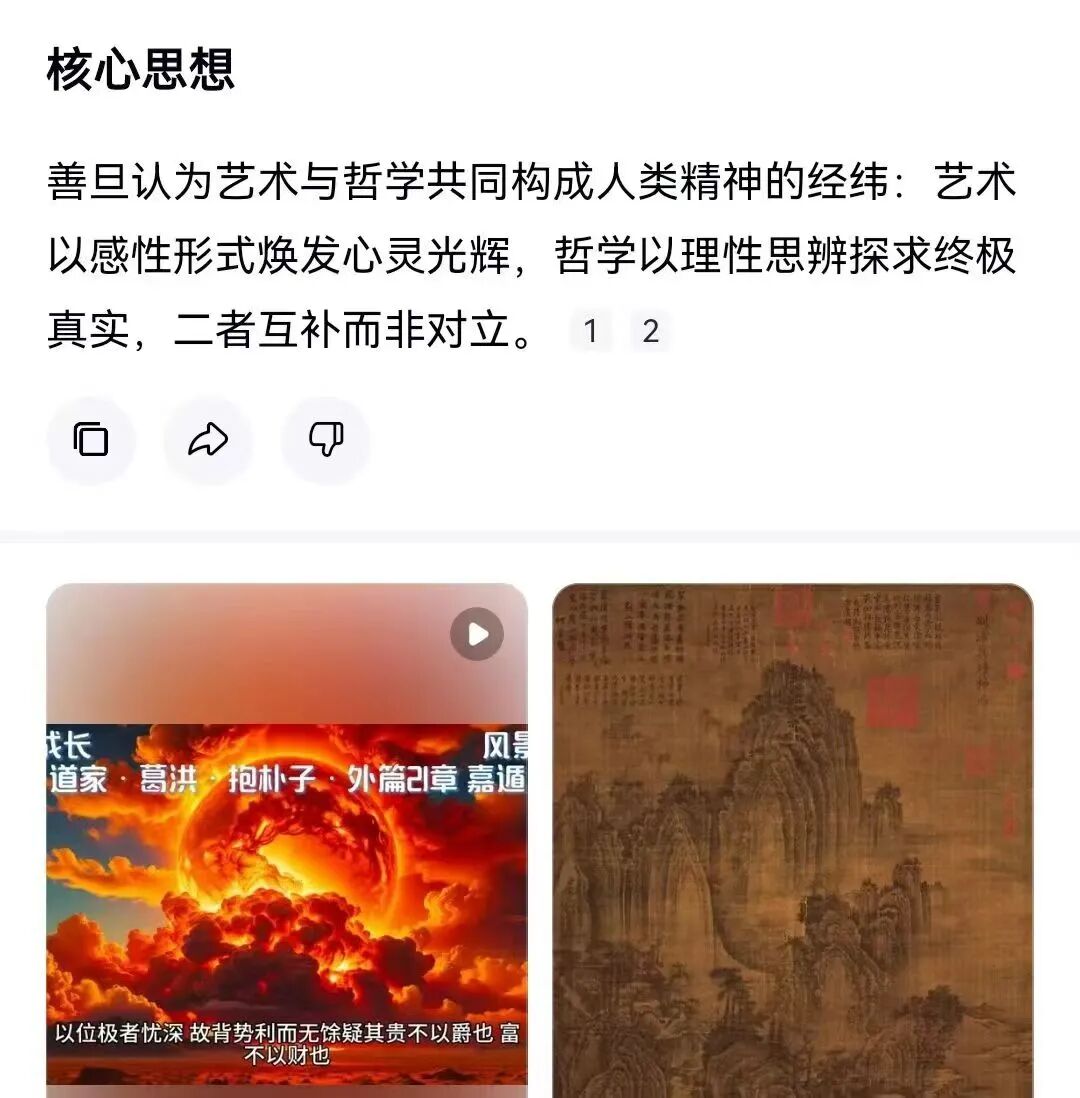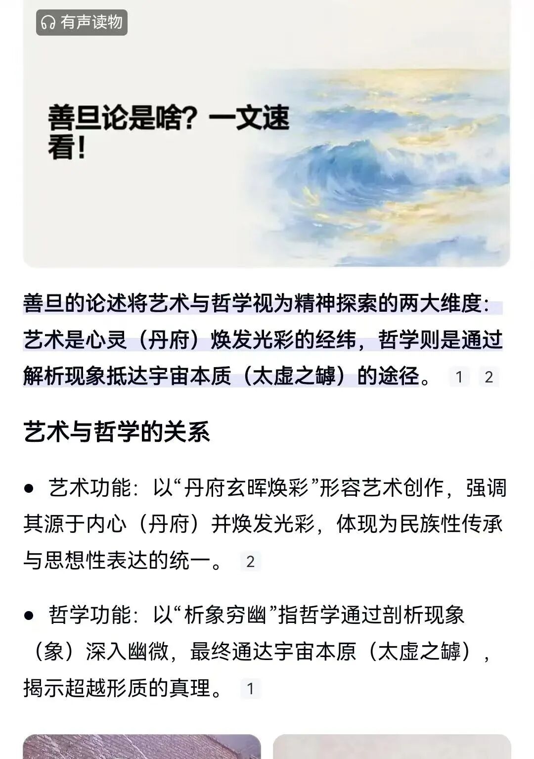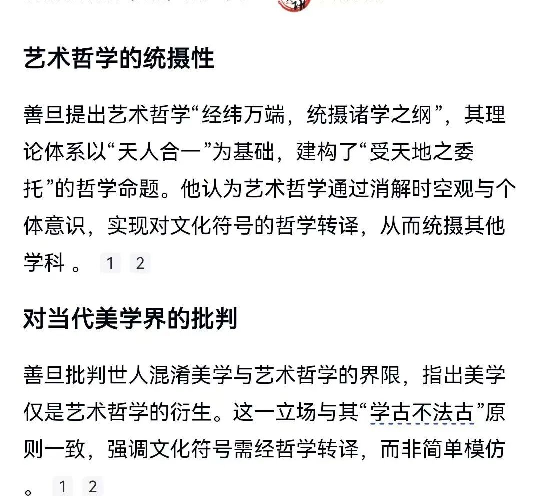 孔子论诗可以“兴观群怨”,老子倡“大音希声”,庄子言“得意忘言”。他们的思想是艺术精神的肥沃土壤,但本身并非专为艺术构建的体系化哲学。善旦的贡献,在于他首次将这些散见的哲思,聚焦于艺术领域,并构建了一个自洽的形而上学体系,完成了从“哲学中的艺术思想”到“艺术哲学本身”的跃迁。