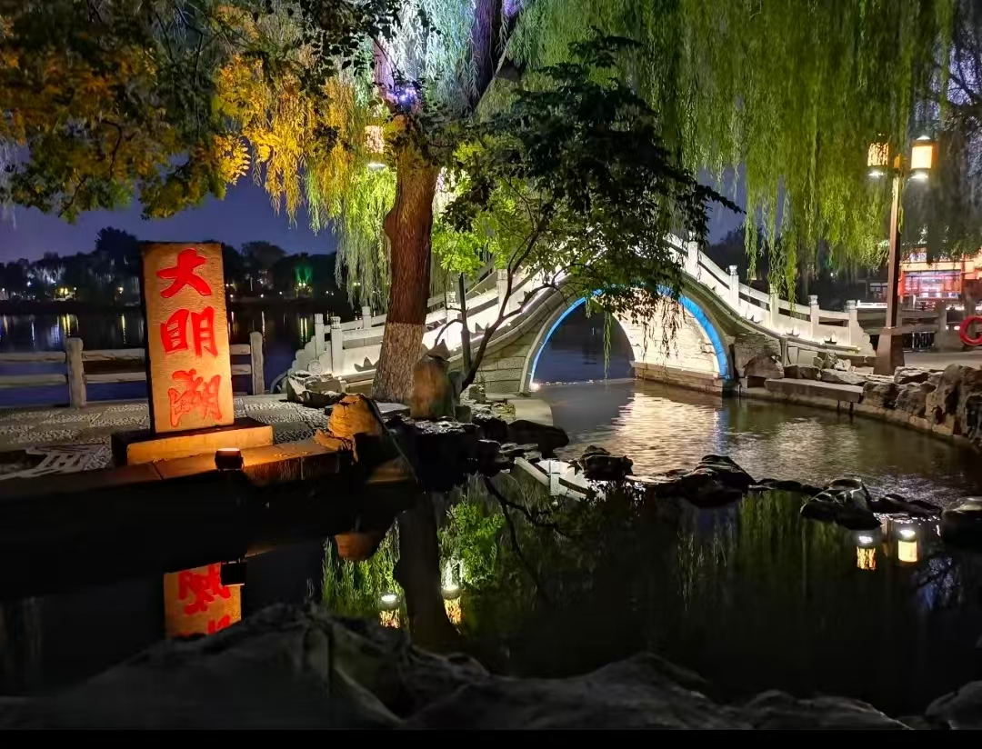 夜色渐深,游人散去。湖面恢复了平静,只有微风偶尔拂过,掀起细微的涟漪。岸上的灯光倒映在水中,拉出长长的光带,随着水波轻轻晃动。这大明湖,默默见证着岁月的流转——杜甫在此吟咏,易安在此徘徊,而今人亦在此寻觅。湖水不老,只是看水的人换了一代又一代。