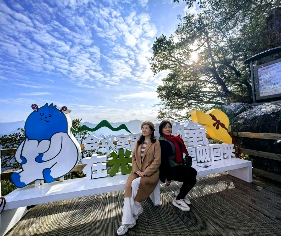 驶入景区入口,需改乘景区索道方能到达理想观景点。索道全长1777.8米,高低落差590米,单程运行约5分钟。缆车高悬,层峦叠嶂的山峰逐渐从云雾中浮出,随着高度攀升,景致愈发壮阔。最先闯入视野的是燕子岭片区,站在这里可俯瞰红叶与喀斯特峰丛交织的景观。缆车穿行在云海间,脚下的红叶区像无边无际的赤色长卷,漫山遍野的色彩在云雾中若隐若现,平添几分朦胧韵致。登顶时,云雾恰好散开,群山全貌尽收眼底。索道终点便是燕子岭,岭上有座宽敞的观景台,视野极佳,景区还设有拍照打卡点,男女老少都在这里留影。我们八个人也在这里留下了美好的瞬间。沿着木质栈道往上走,一幅“天然画廊”徐徐展开:远处峰峦连绵起伏,红叶点缀在沟壑峡谷间,一团团、一簇簇,虽已飘零仍不失绚烂;近处松柏傲然挺立,与红叶相映成趣,共同织就一幅壮丽的秋日画卷。