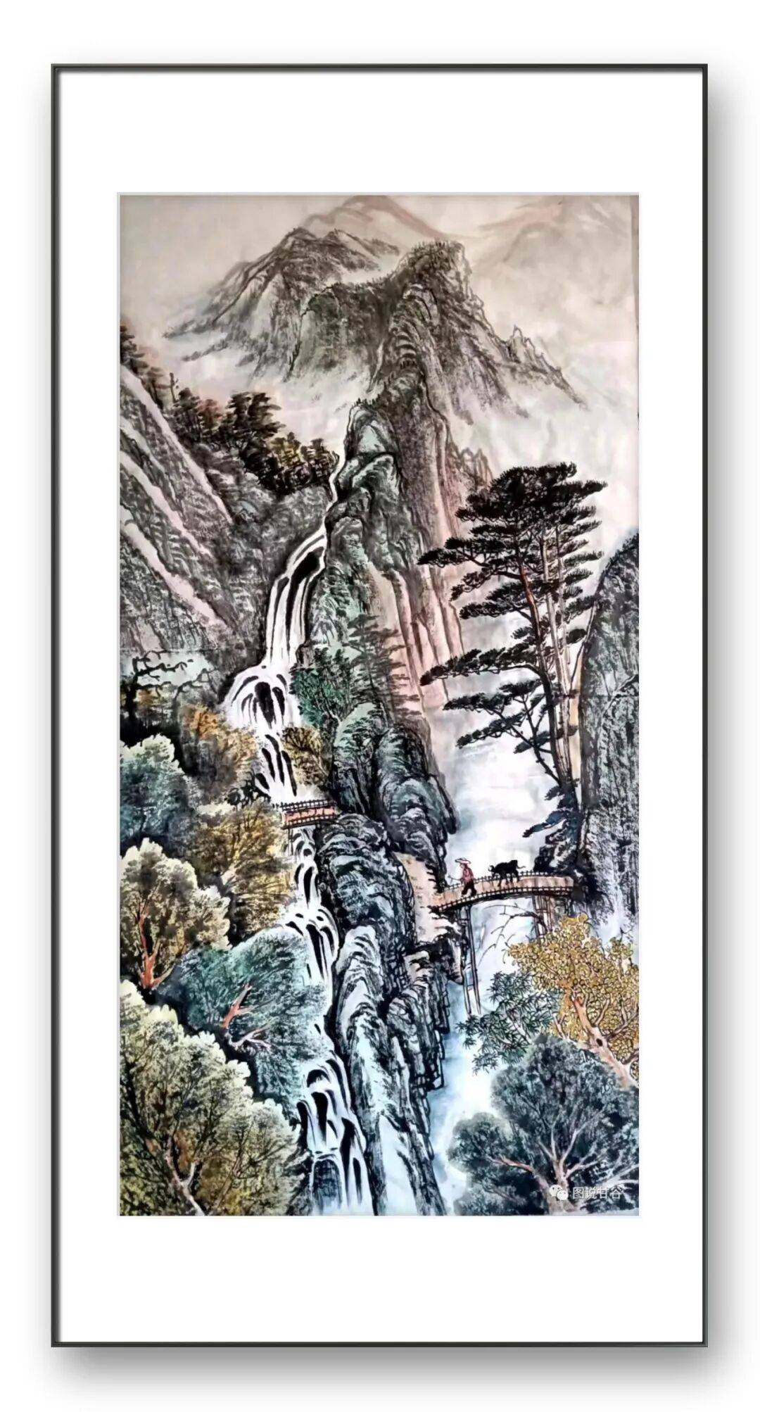 王元子的山水画,是“外师造化,中得心源”的生动体现。王元子深谙山水“比德”的传统,认为山水不仅是自然景致的再现,更是画家精神世界的投射。为了捕捉山水的灵韵,他足迹遍布名山大川,从黄山的奇松怪石到三峡的雄奇险峻,从江南的烟雨朦胧到塞北的大漠孤烟,都成为他写生的对象。他将自然山水的实景与传统山水的笔墨程式相结合,创作出的山水作品既有自然的真实感,又有艺术的提炼与升华。其笔下的雄山,以厚重的笔墨勾勒轮廓,皴法交错间尽显山石的苍劲质感,墨色的浓淡变化营造出云雾缭绕的朦胧意境,仿佛让人置身于“可游可居”的山水之间;而江南水乡题材的作品,则多以轻快的笔触勾勒小桥流水、粉墙黛瓦,墨色清淡雅致,透着江南的温婉灵秀。尤为可贵的是,他的山水画中常常融入当代生活元素,比如山间的盘山公路、湖边的现代民居,这些细节的加入让山水不再是脱离现实的“世外桃源”,而是与当代人生活紧密相连的“身边风景”,更易引发观者的情感共鸣。