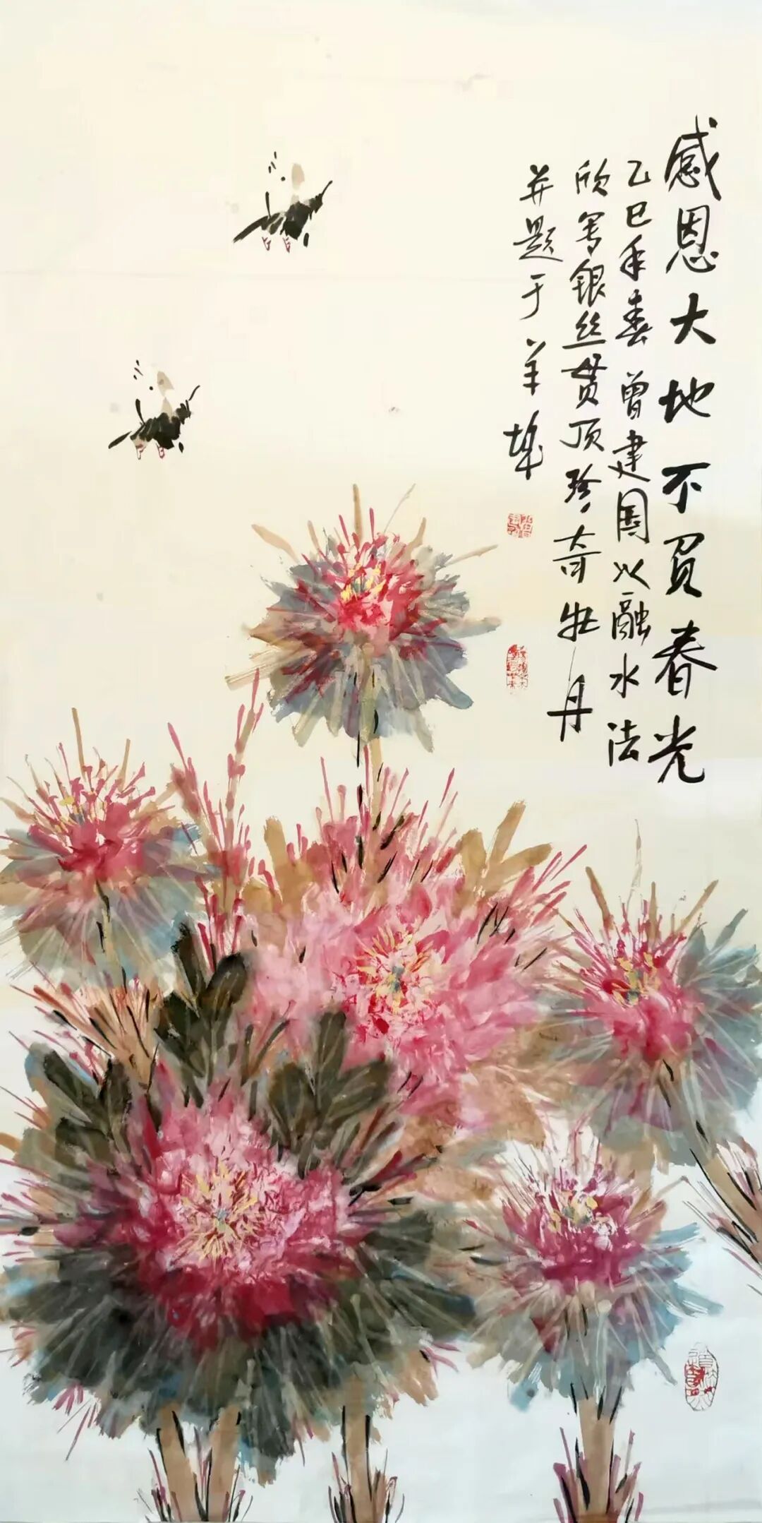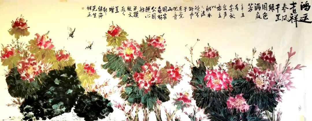 不光笔墨,他的牡丹构图也藏着巧思,丹不扎堆,也不零散,排布得像天上的星群,一簇是星系,一朵硕星,各有各的姿态,又互相牵着引力。这不是简单的疏密安排,是经营位置的大本事。繁盛的花团是生机勃发的星系,透着民族的旺气,是传了数千年的精气神。湿墨润气,干笔铁骨,再与星群般的“势”融在一起,牡丹就不再是案头的小景,成了能装下天地的大观,让自然美、哲学美、宇宙美融在这一纸画题里,成就了借古开今的艺术功勋。