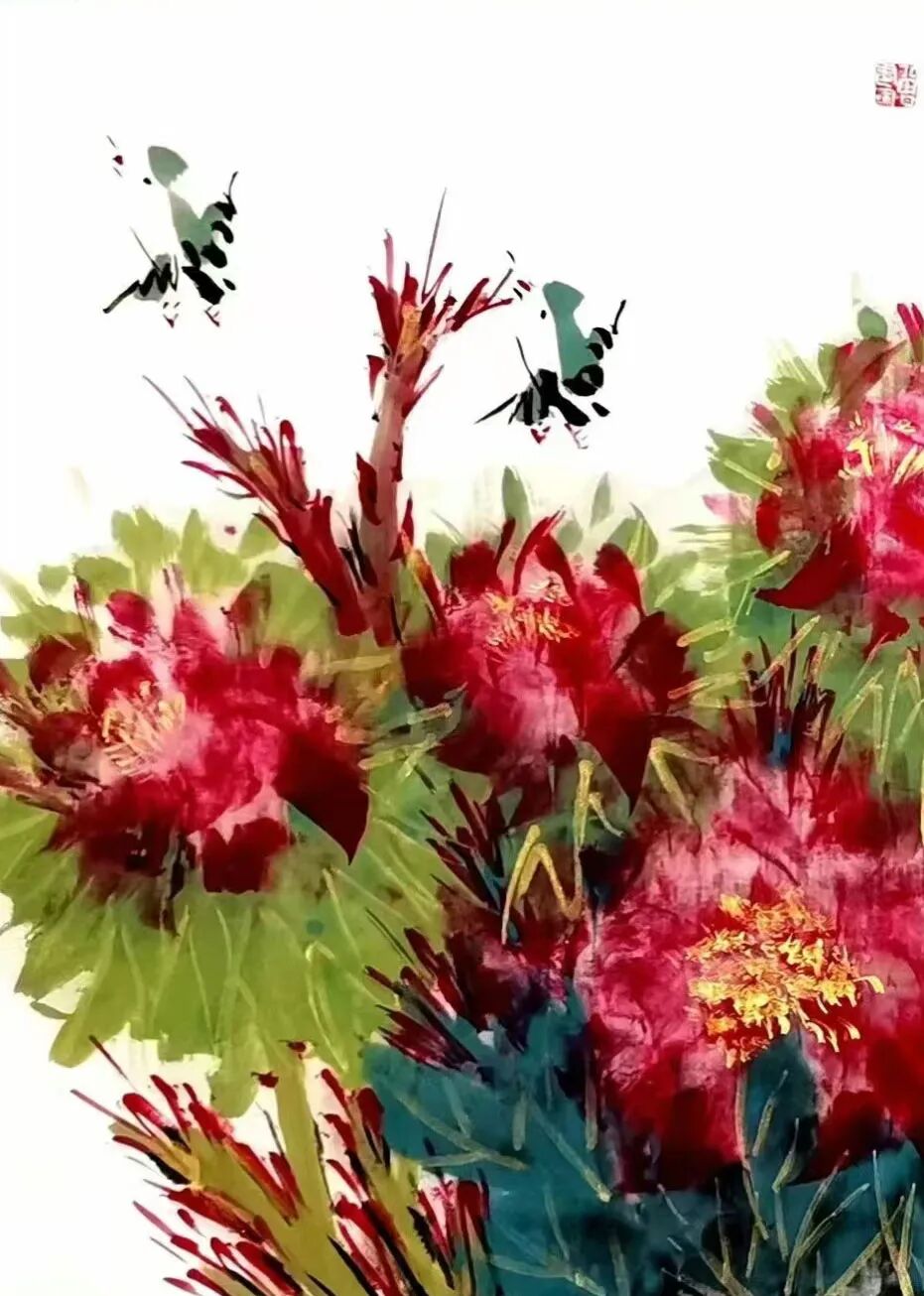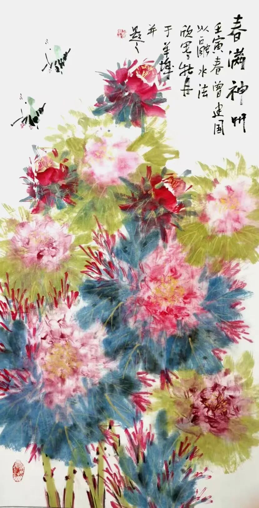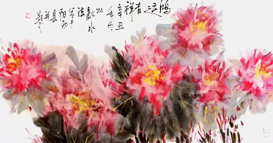 总而言之,画传统题材既不能离得太远,也不能守得太死。曾建国先生画牡丹的妙处,就在于把“守”和“破”的水准拿捏得恰到好处。守着笔墨的根,气韵生动的画魂没丢。破了形神的界,让牡丹升华为宇宙代言。于是笔下的“宇宙花”就成为牡丹创新的新内涵,也是民族的气脉影响世界的明证。看这样的宇宙花牡丹,不禁觉得大气敞亮,就像是在作品里对接了天地脉搏,这也是他的牡丹为什么有力量、有精神的原因之一。画为心迹,境由心生,曾建国先生的画,已经是真正成为了新时代绘画艺术的美学传奇!