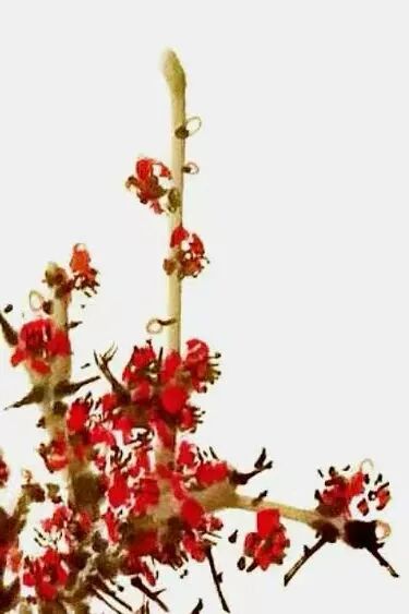 要是说湿墨牡丹映照的是宇宙的虚空,那干笔焦墨就是撑起宇宙空灵的骨力。骨法用笔在牡丹的叶脉枝桠上体现得淋漓尽致,笔锋压下去沉实如石,提起来又轻捷如丝,转折间都是力量,中锋行笔,线条硬得像陨石的纹路,向上而生稳得很,是撑着天地的姿态,这笔有闪电之功,风雷之劲。铁笔立骨,顶天立地。焦笔点的金色花蕊,焦黄里透着暖,像燃起来火的星。墨分五色,笔有刚柔,牡丹的湿墨是柔,是宇宙初开的混沌;干笔是刚,是天地运行的秩序。画牡丹让一柔一刚撞在一起,作品就有了“一阴一阳之谓道的哲学味道,牡丹宇宙花也是哲学花。