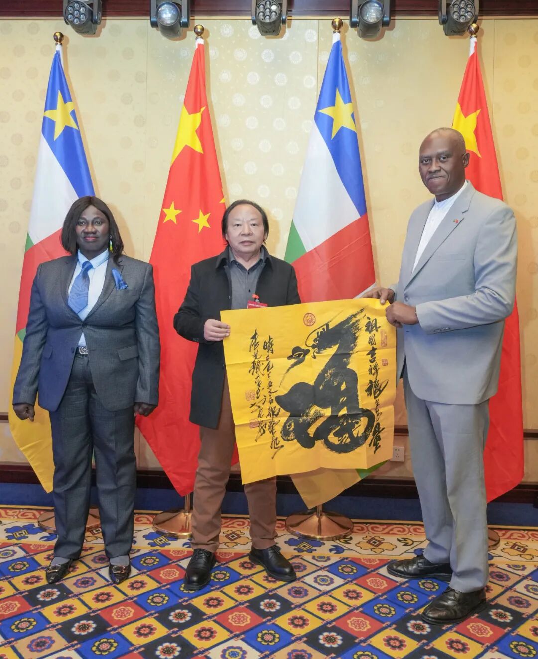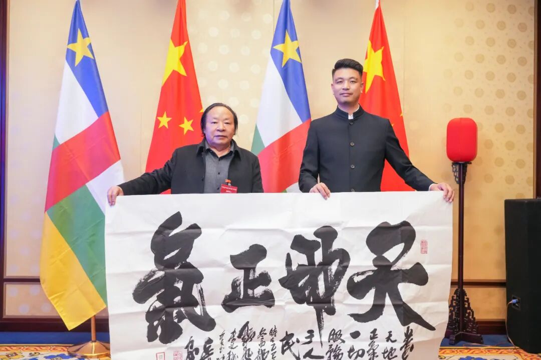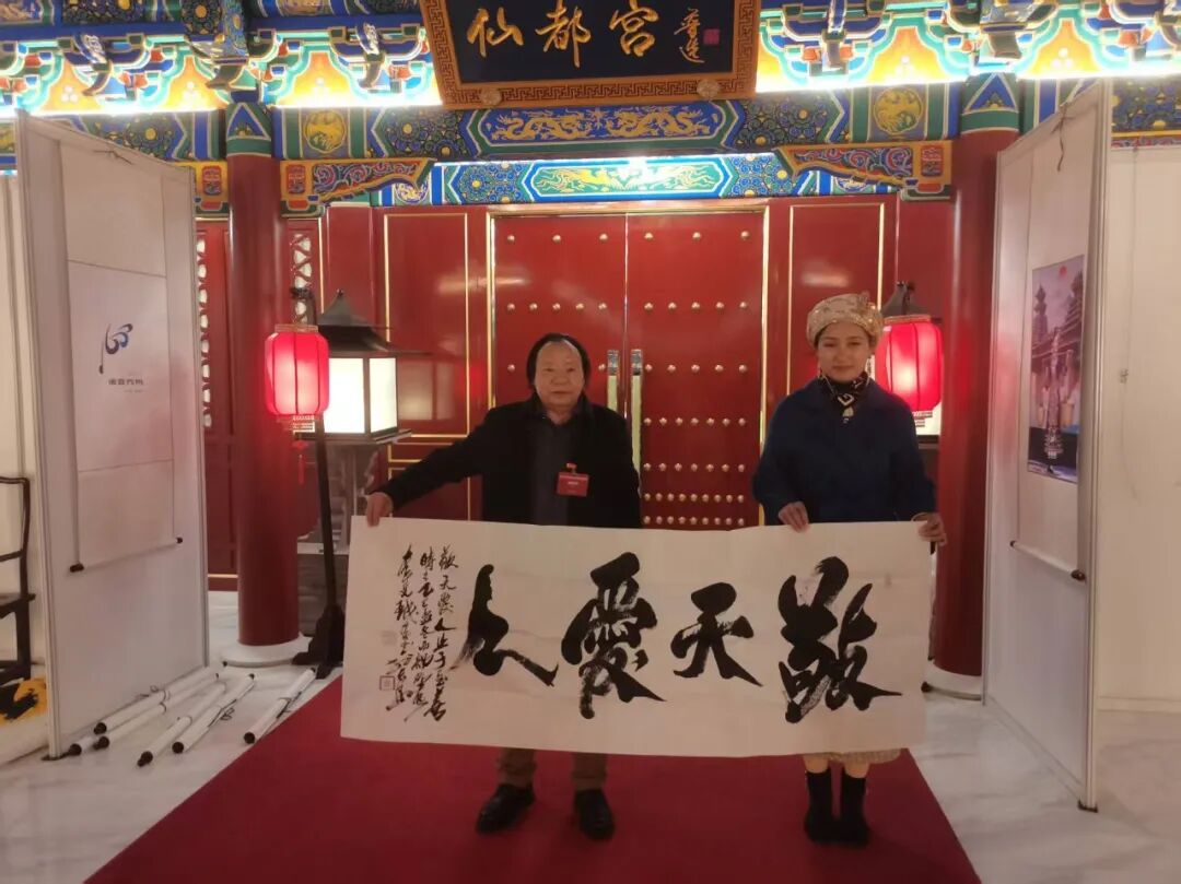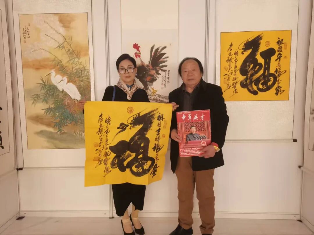 更令人称道的,还有李艾珉先生的原创作品《中华龙祖国福》,此书以雄浑的榜书根基为骨,又融象形之妙意为魂,笔走龙蛇间,可谓尽显一股豪迈磅礴之气!其书“龙”字,若腾云驾雾,鳞爪欲张,蜿蜒之势暗合天地韵律。龙首取形栩栩如生,既源于字法起笔之妙,又契合整体气势之开合。笔到意到,境随墨生,一字之中,既有碑学的沉着刚健,又具帖学的通达纵意。恰如清人冯武《书法正传》所言:“骨丰肉润,入妙通灵。”笔墨铸就华夏神魂,尺幅尽展民族气魄,如此佳作,寓意深远,实为当之无愧的翰墨华章也!