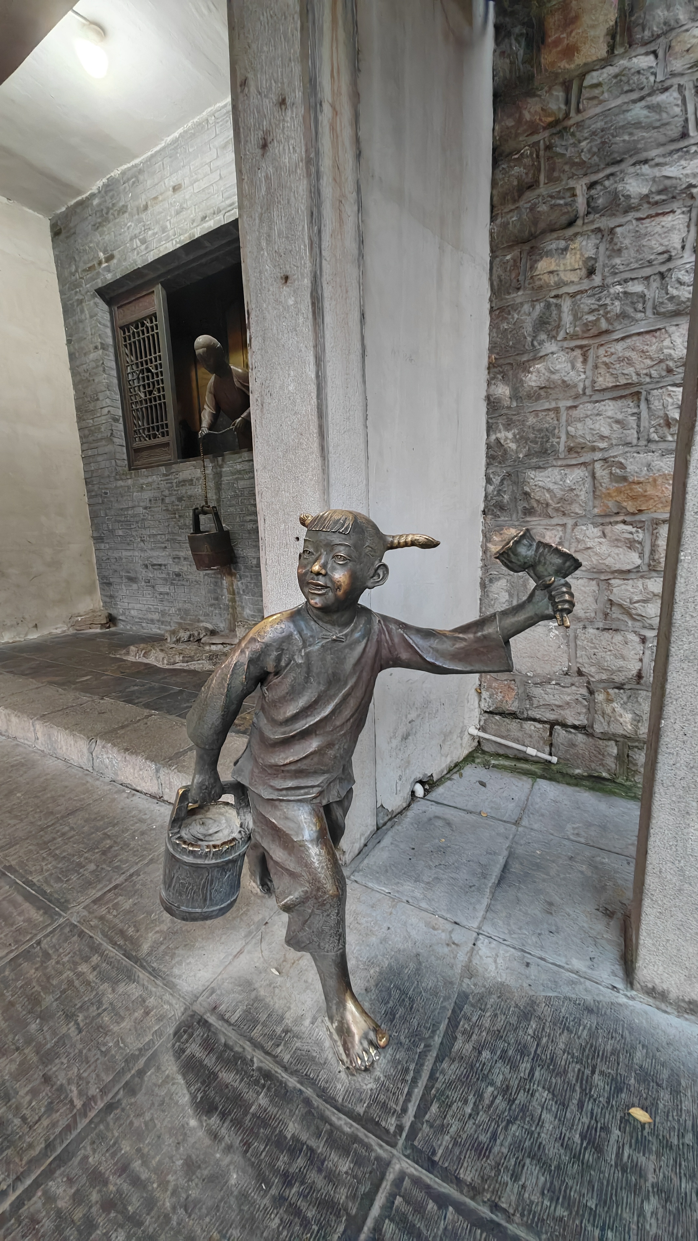 又赶紧去瞅一眼五莲泉。听名字就知道,五块石头自然堆叠妆如莲花,泉水成瀑布泻入河中。折返看“水夫毛驴张”的铜塑,他仿佛提了桶水,正要去灌注驴车上的水箱;看扎双揪揪女童一手提一小桶泉水,一手扬起手中两颗莲蓬;看一位家庭主妇“隔窗取水”,显示泉水已融入老济南人生活的每个角落,这一得天独厚的自然恩赐给济南人带来的方便和乐趣。