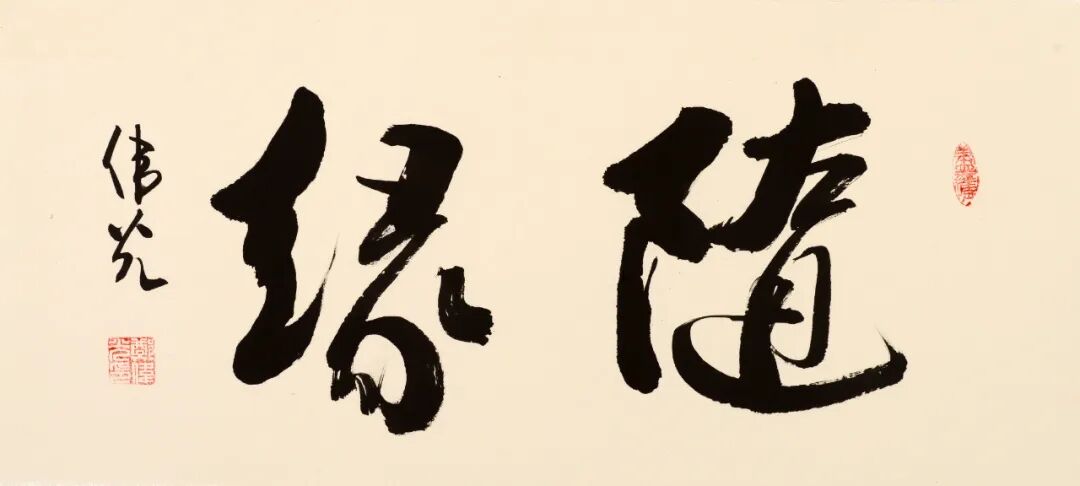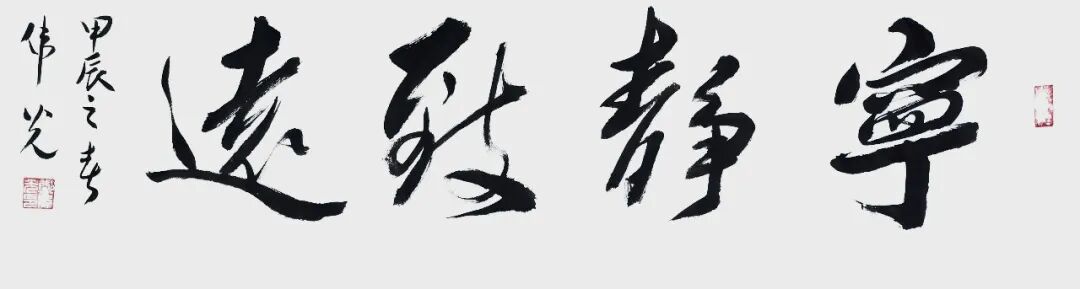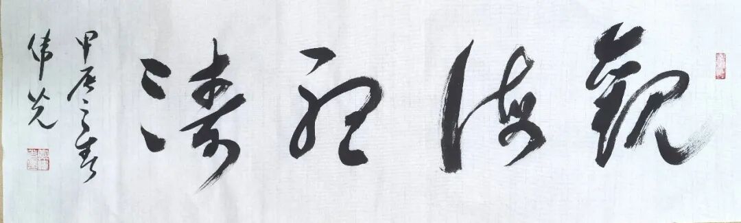 观其用笔,自有二王立根基,包括对《集王圣教序》、《兰亭序》及米芾手札等经典法帖,也是颇有汲取。多年细心揣摩,浸淫其中,使手与神运,令艺从心得,故而行书笔笔皆是精到二富于变化,以中锋立骨,以侧锋取妍,常有纵意变态之姿出于毫端,更见潇洒雅逸之格蕴藉其中!笔势时如高山坠石、时如泉涌溪流,章法亦是高低、长短、阔狭,总之其变无穷!胎息二王法度,参融苏之雄劲、米之超动,由此也是再次印证了,郑伟光先生走的是一条集古出新的道路,堪称无论何贴,皆足以范其笔力也!