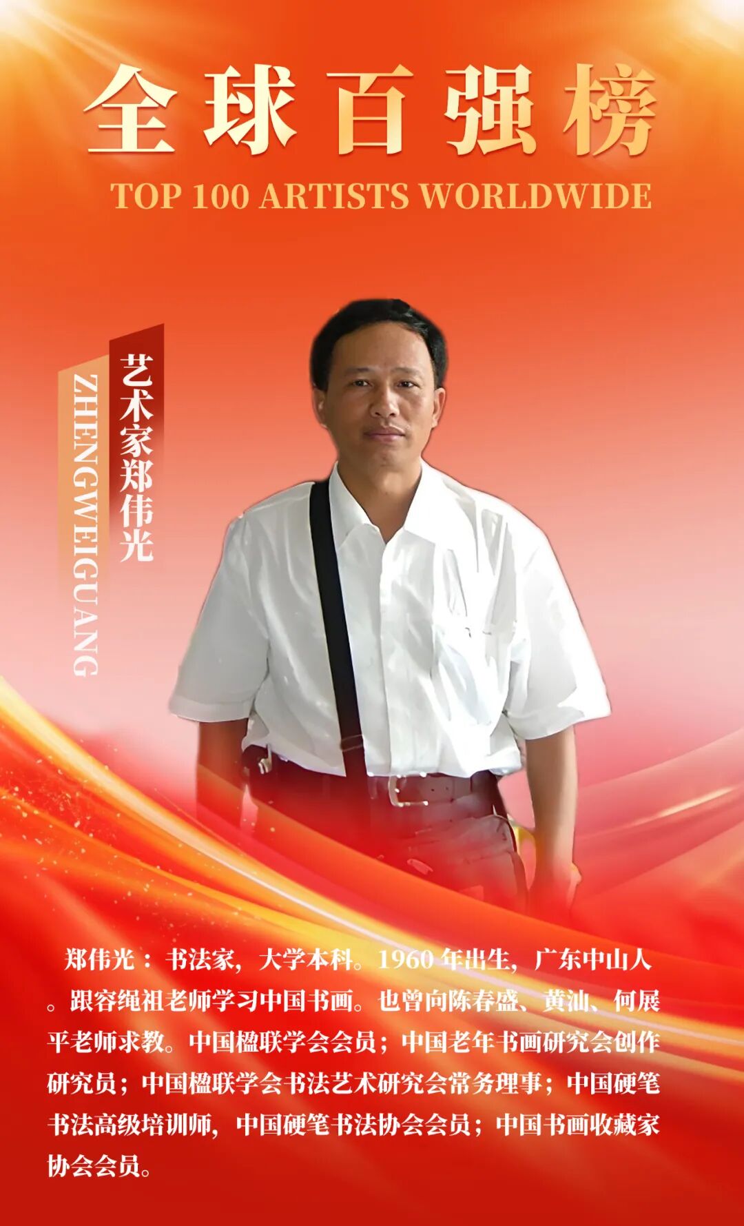 郑伟光 :书法家,大学本科。1960 年出生,广东中山人。跟容绳祖老师学习中国书画。也曾向陈春盛、黄汕、何展平老师求教。中国楹联学会会员;中国老年书画研究会创作研究员;中国楹联学会书法艺术研究会常务理事;中国硬笔书法高级培训师,中国硬笔书法协会会员;中国书画收藏家协会会员;中国文化信息协会(工艺美术专业委员会)会员;广东省硬笔书法协会会员,广东省老干部书画诗词摄影家协会会员;中国书画家联谊会新文艺群体书画家工作委员会委员。