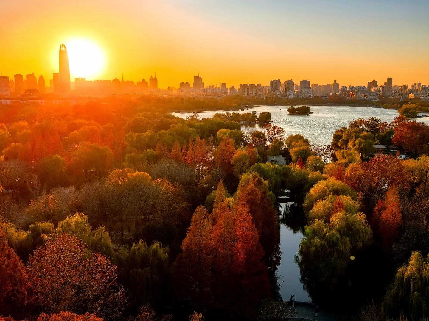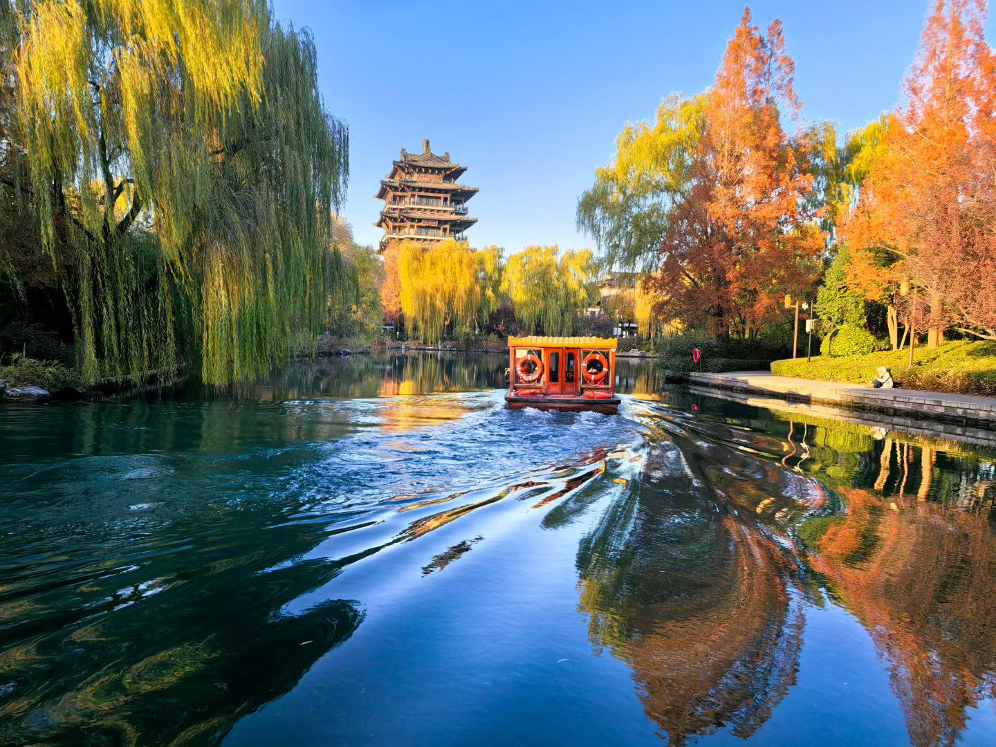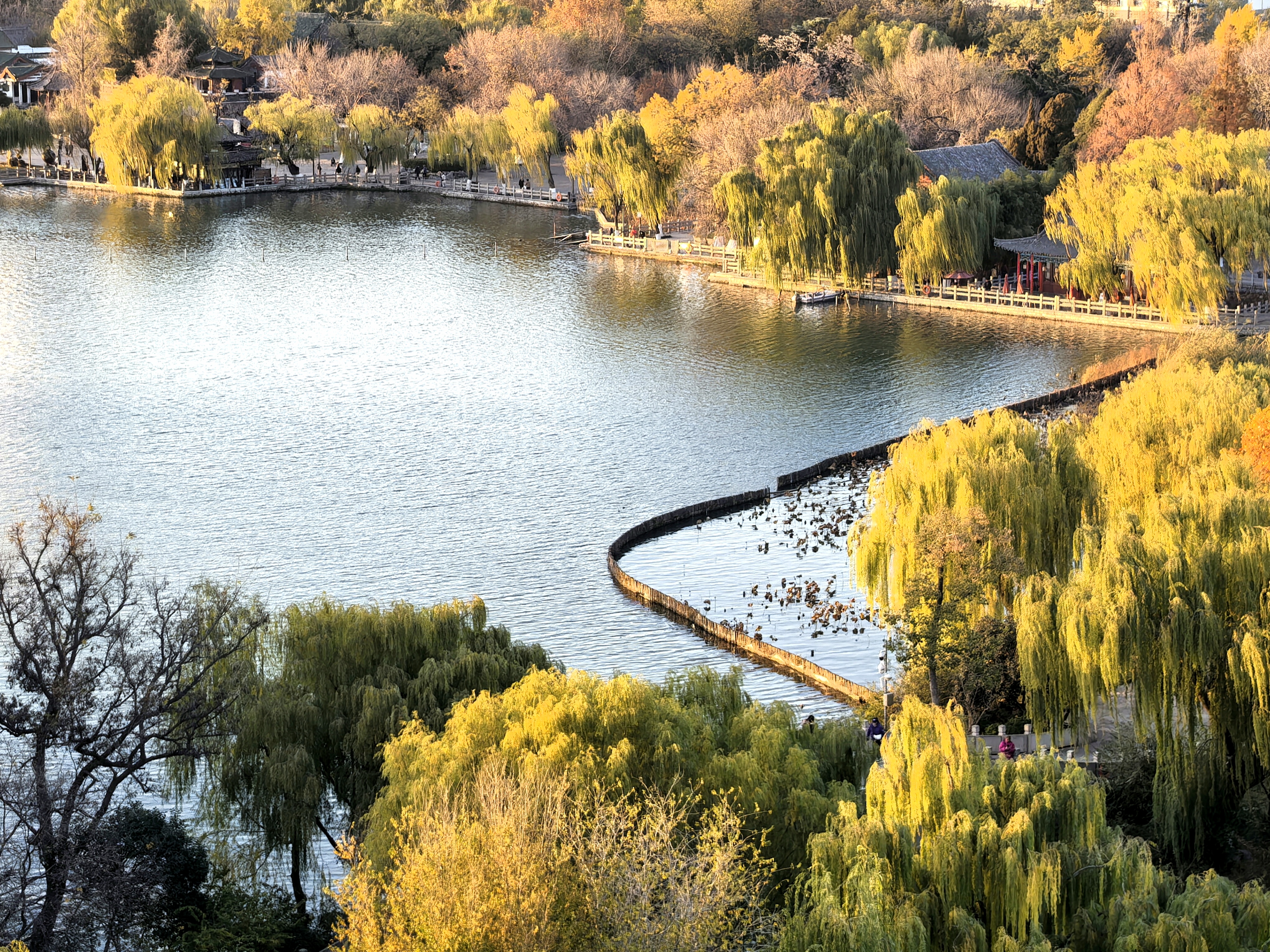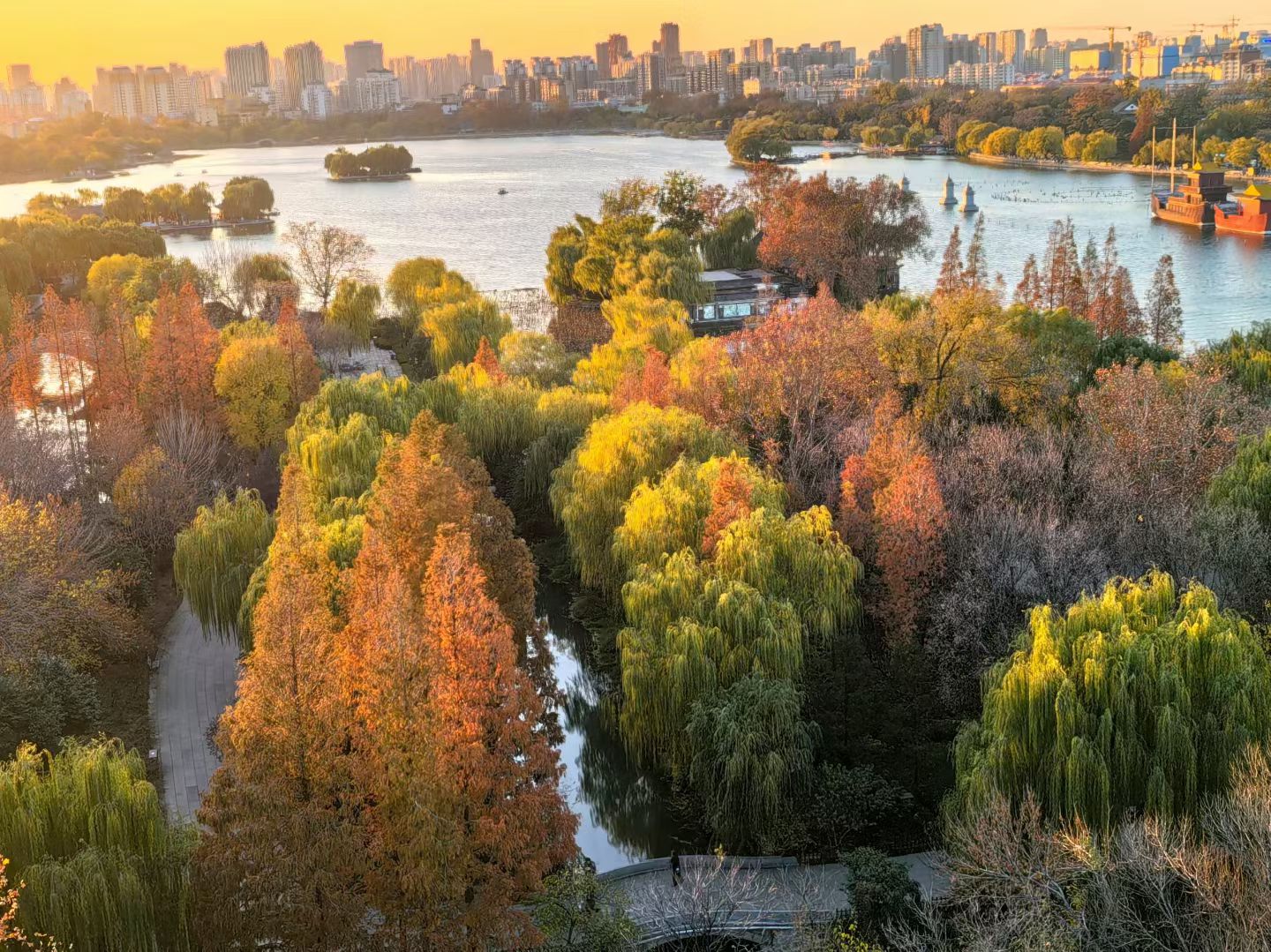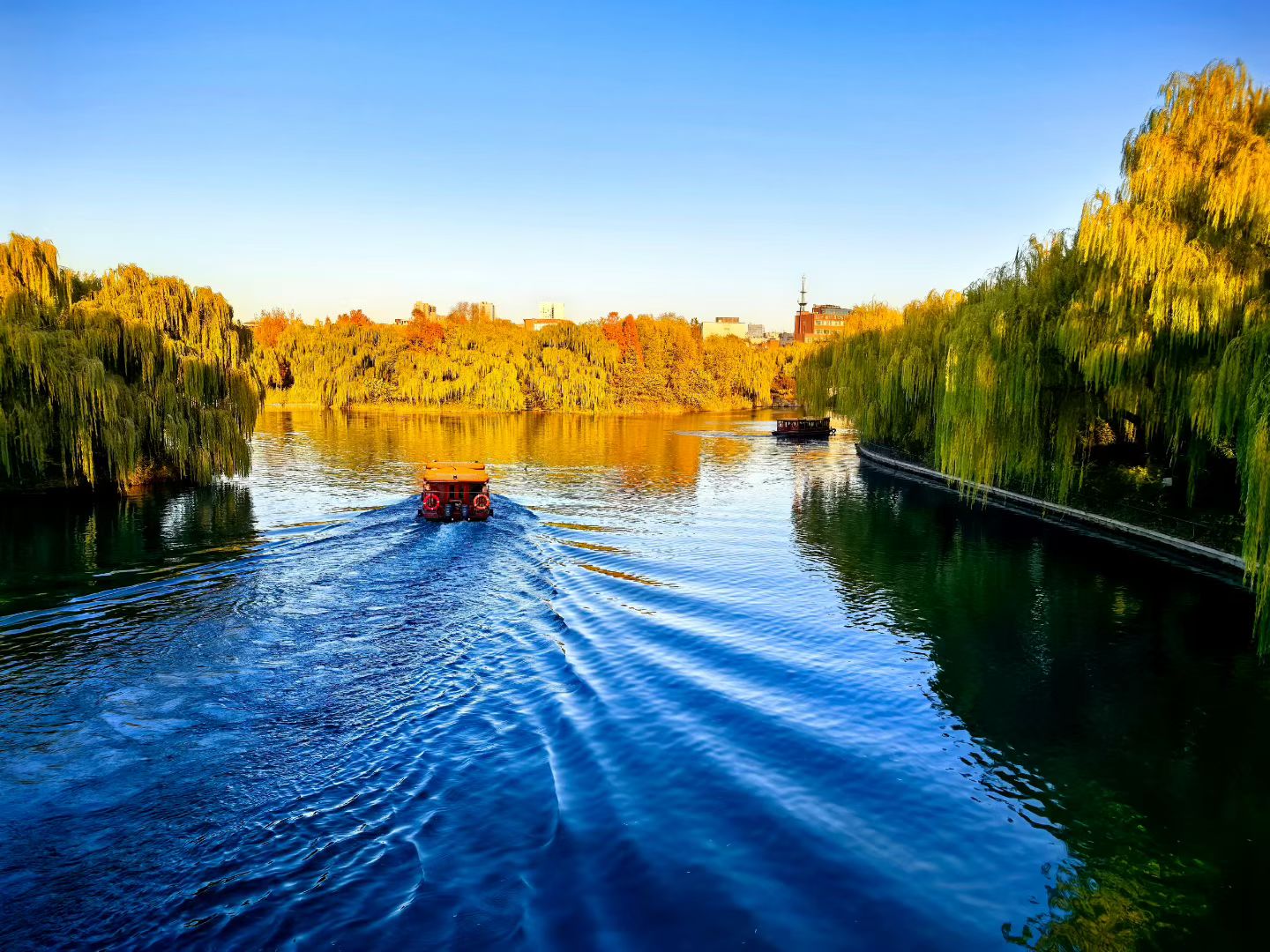 夕阳余晖洒落湖面,湖水仿佛被点燃,从鹅黄、嫩绿到翠蓝、绛紫,层层晕染,如一幅流动的抽象画。垂柳披着金色轻纱,在微风中翩跹起舞;梧桐撑开绿色巨伞,为行人遮挡寒意。小桥流水、亭台楼阁,勾勒出江南般的婉约;红墙碧瓦,诉说着往昔繁华。湖面画舫轻摇,如古代女子荡秋千般自在惬意。两只䴙䴘在水面嬉戏,时而潜入水中,时而浮出水面,抖落一身水珠。