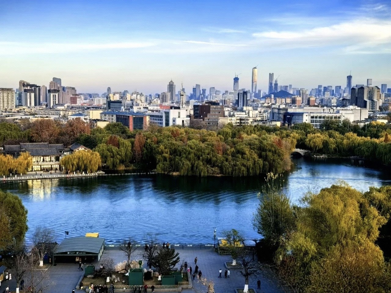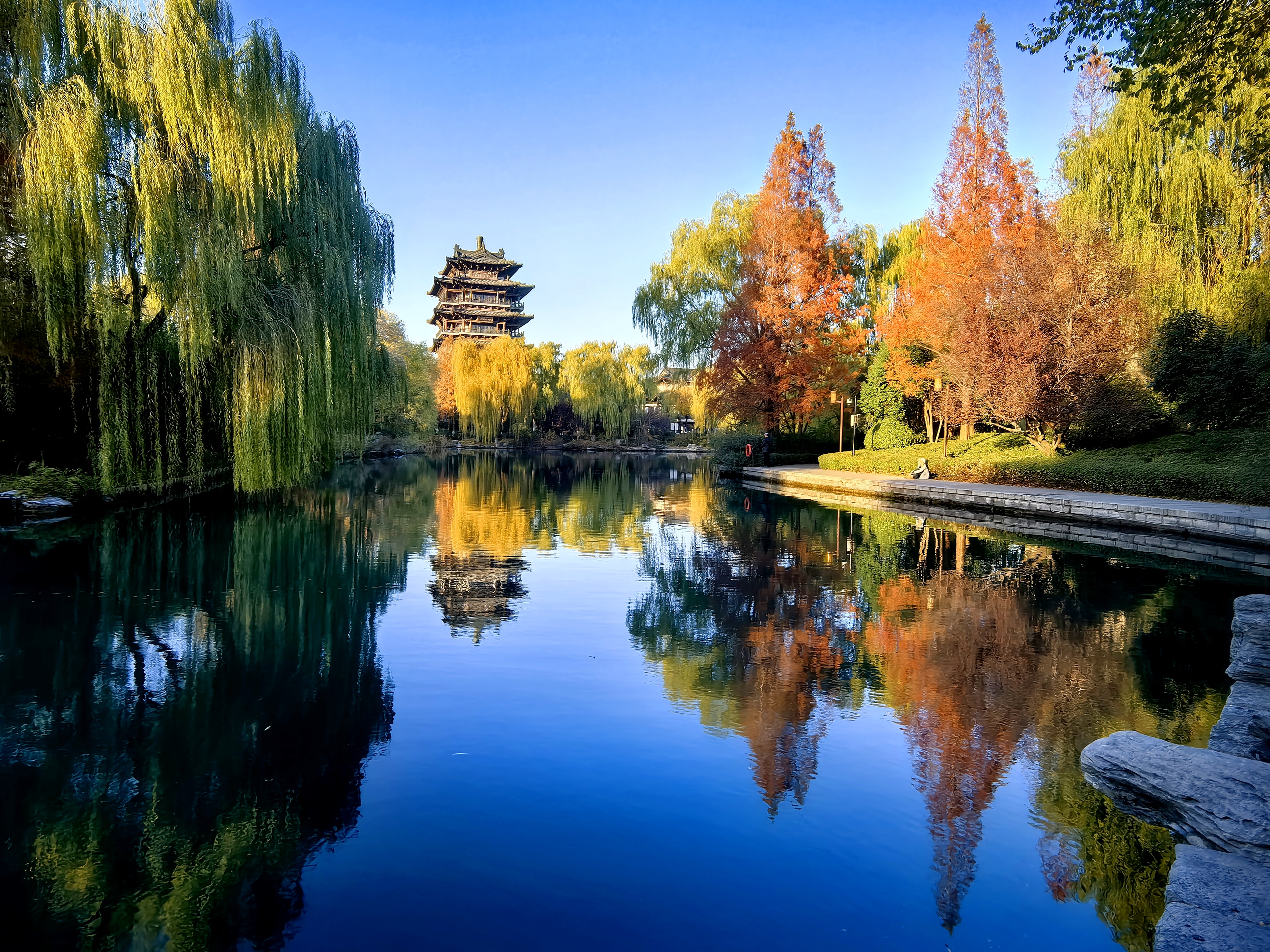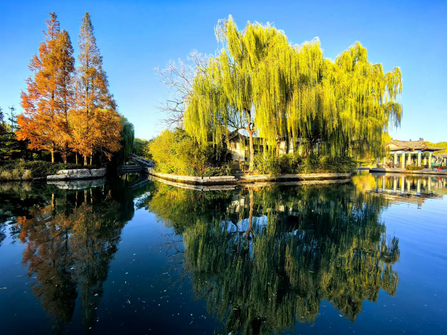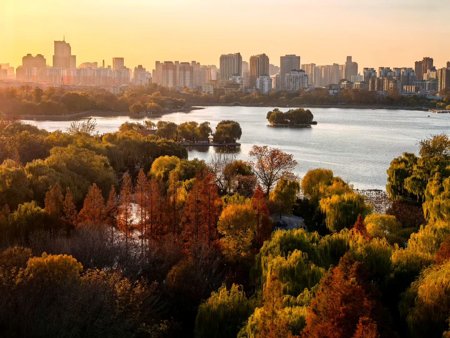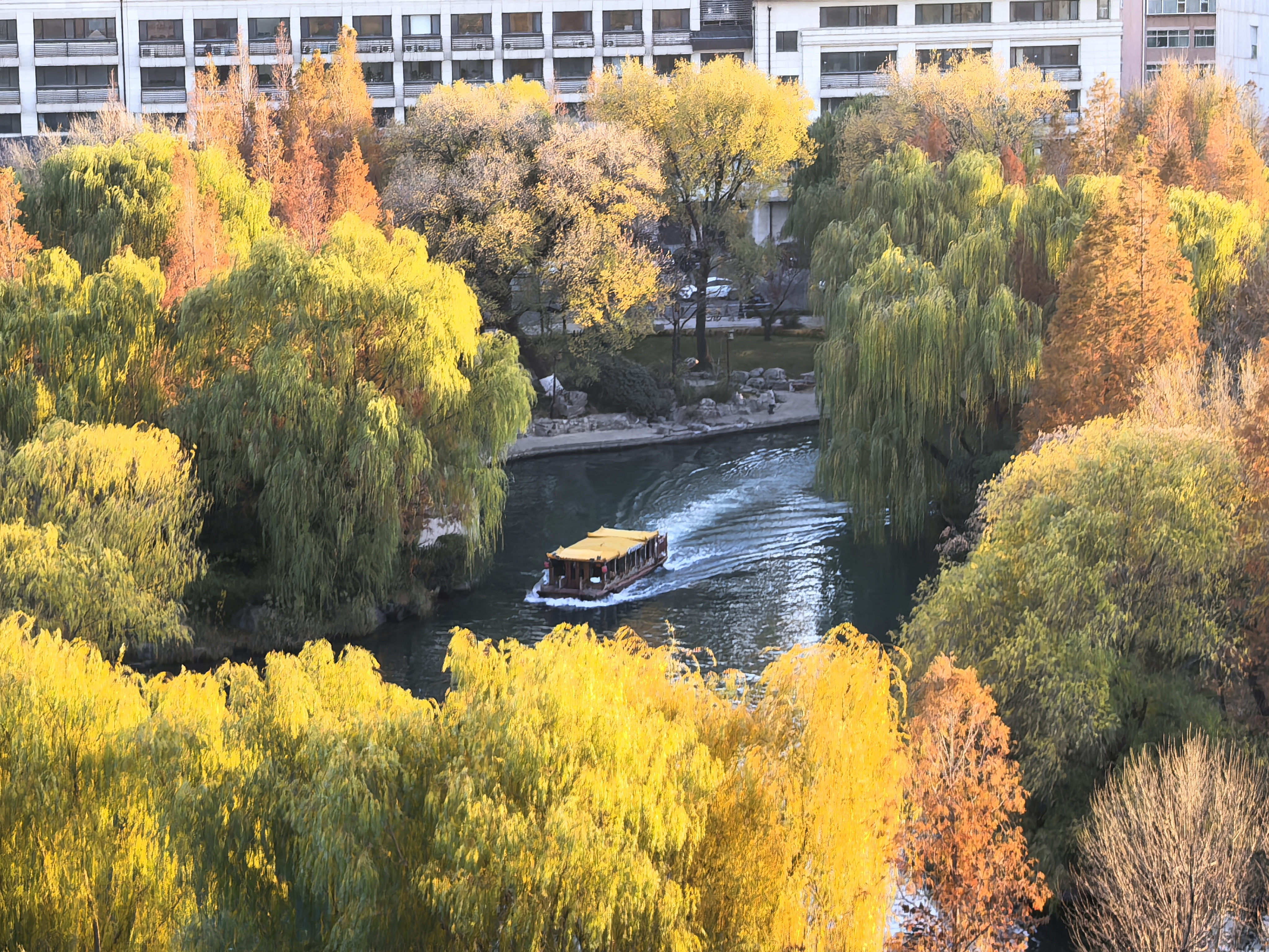 夕阳余晖洒落湖面,湖水仿佛被点燃,从鹅黄、嫩绿到翠蓝、绛紫,层层晕染,如一幅流动的抽象画。垂柳披着金色轻纱,在微风中翩跹起舞;梧桐撑开绿色巨伞,为行人遮挡寒意。小桥流水、亭台楼阁,勾勒出江南般的婉约;红墙碧瓦,诉说着往昔繁华。湖面画舫轻摇,如古代女子荡秋千般自在惬意。两只䴙䴘在水面嬉戏,时而潜入水中,时而浮出水面,抖落一身水珠。